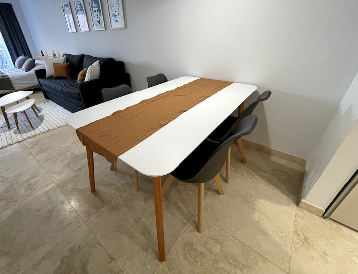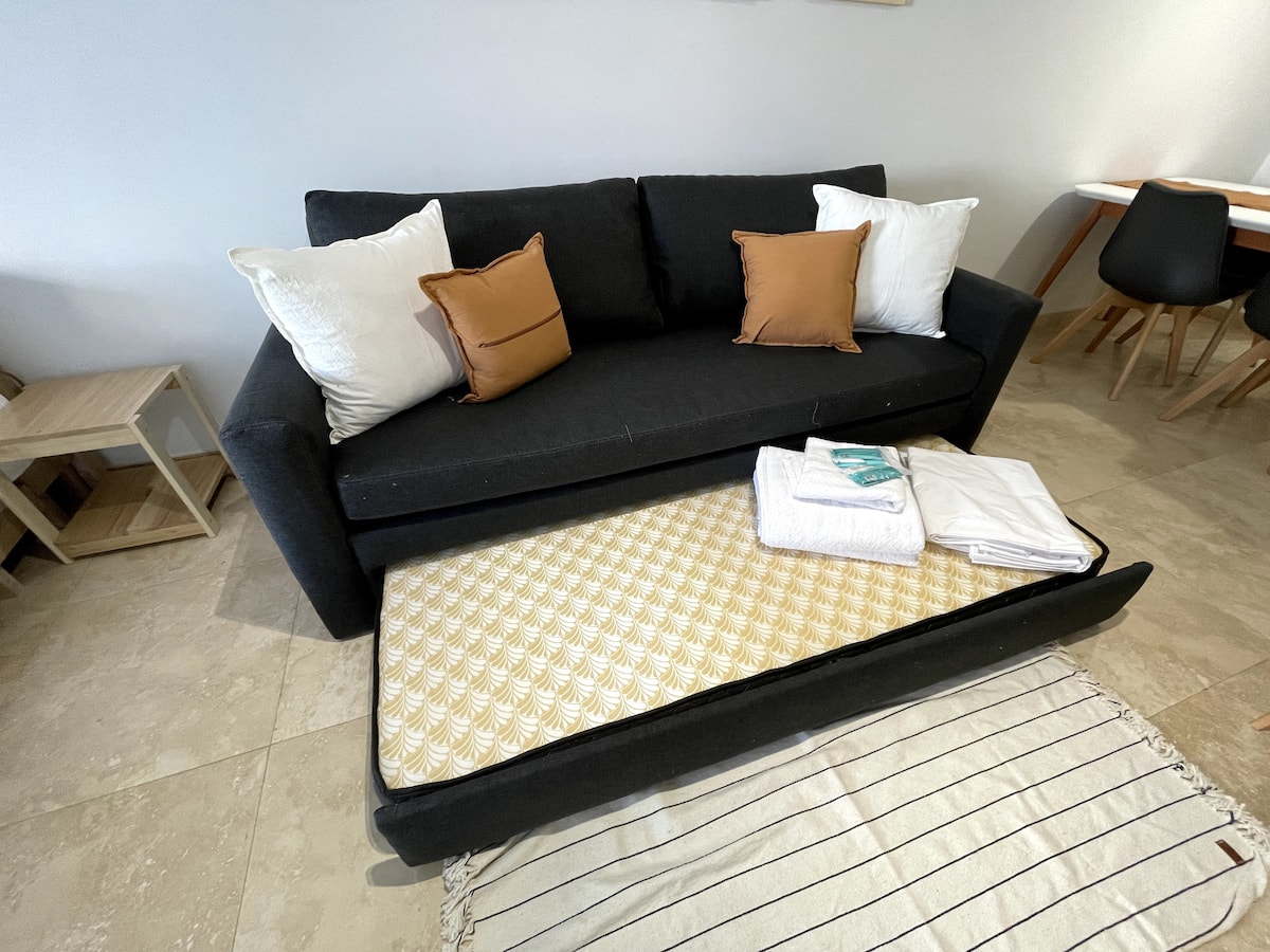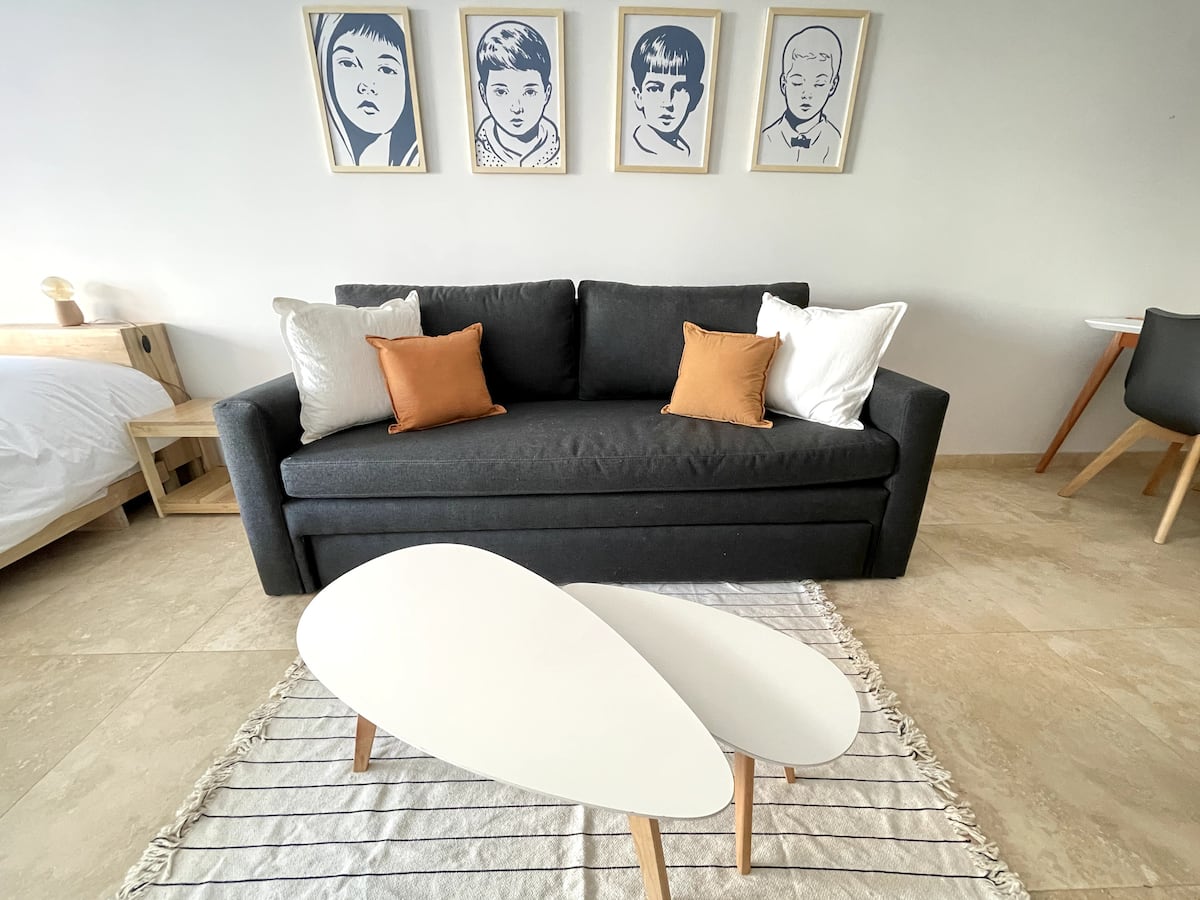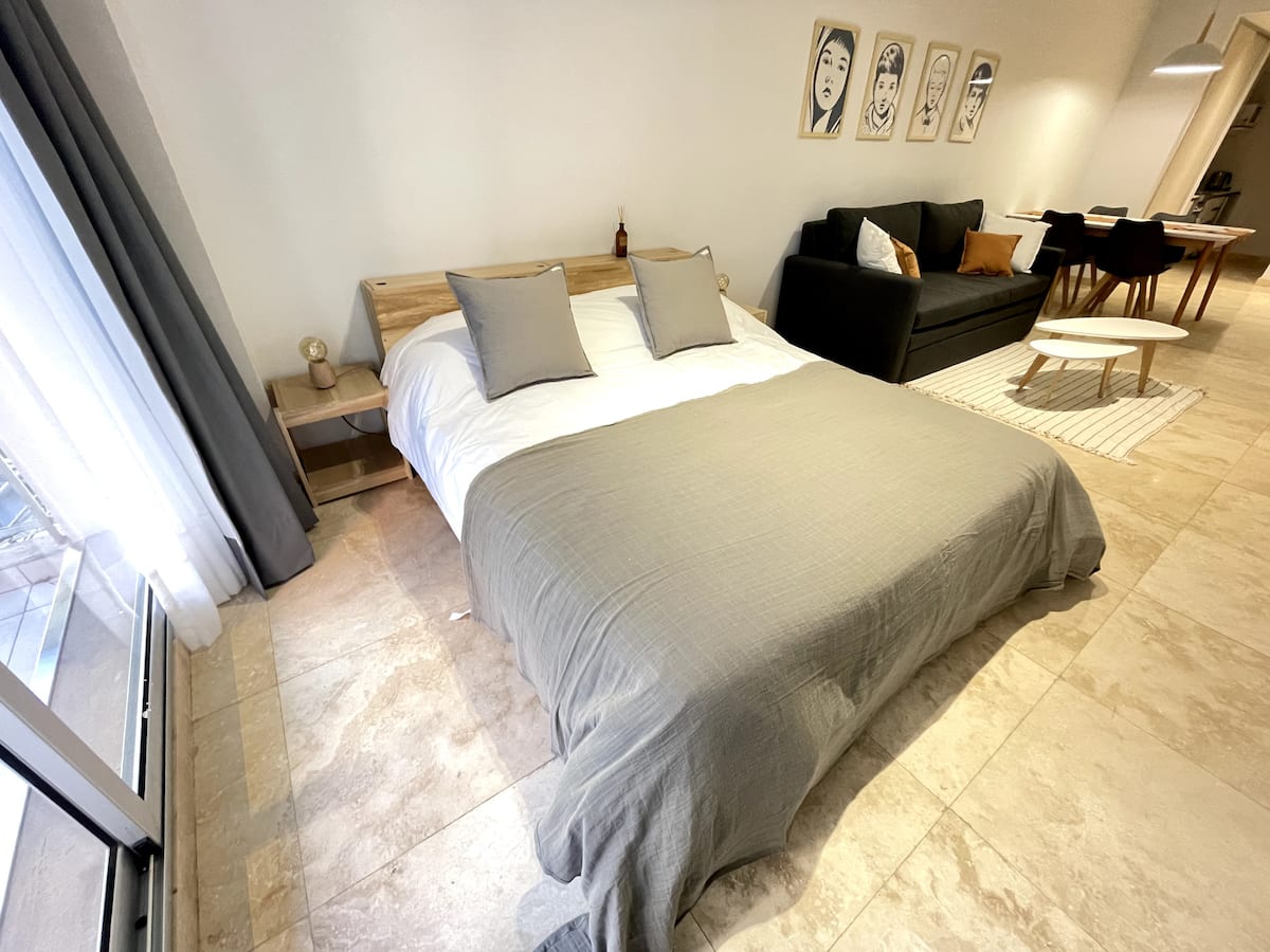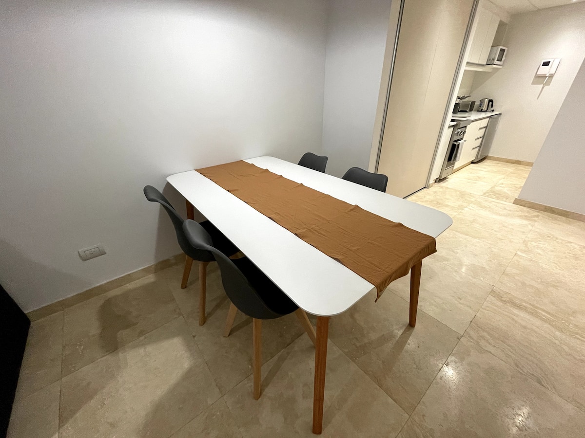 Apartamento tipo kitnet/monoambiente de 40 m² em Colegiales. Unidade mobiliada e equipada para até 4 hóspedes, com cama queen e sofá-cama para 2 hóspedes. Possui ar-condicionado frio-quente, TV Smart e mesa de jantar, além de utensílios de cozinha completos. A acomodação é facilmente acessível por diferentes pontos de Buenos Aires por carro, ônibus ou metrô.
