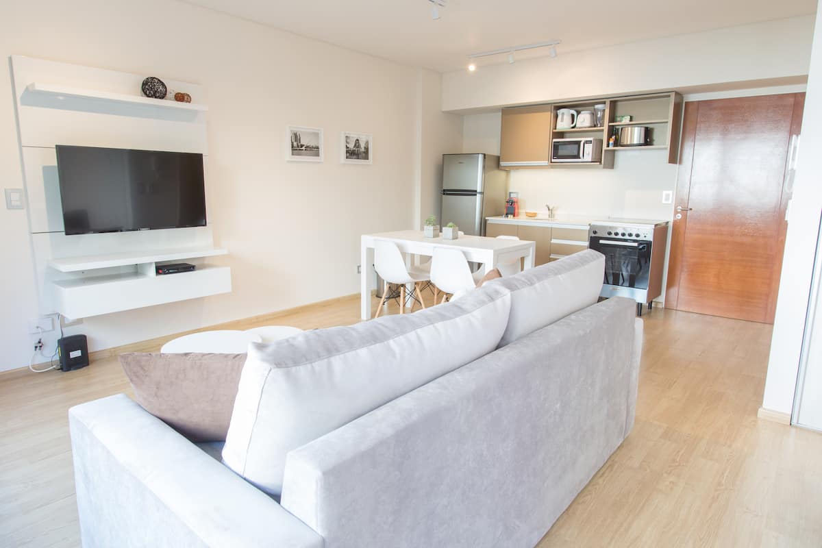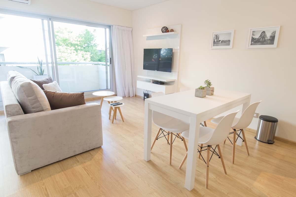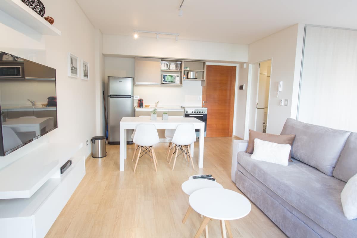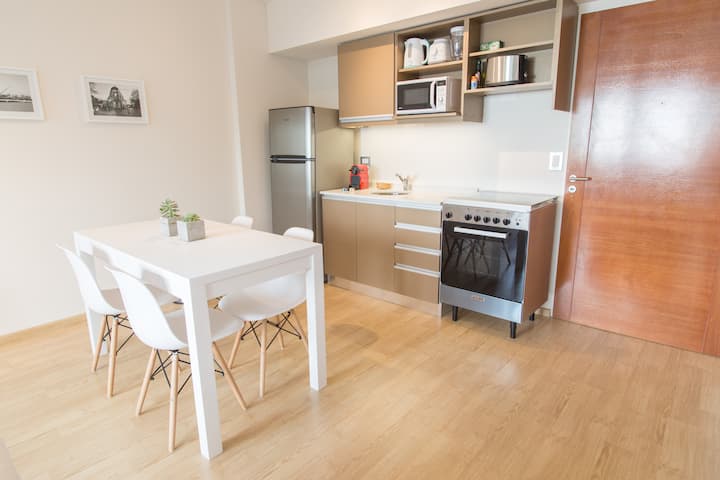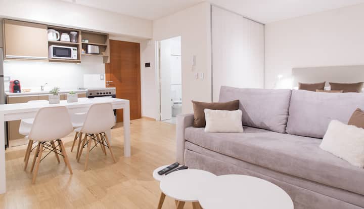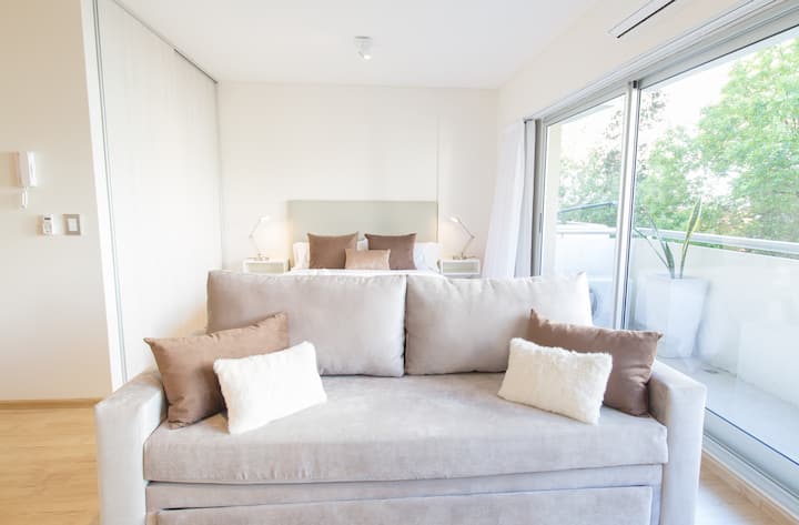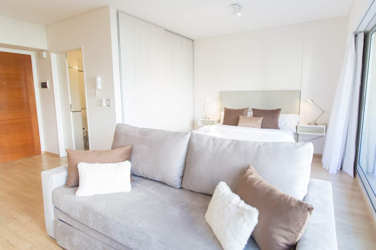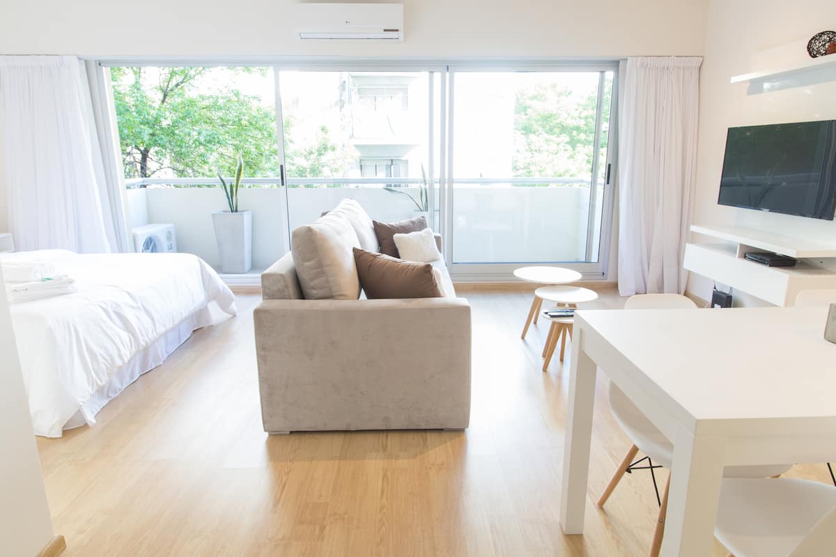 Apartamento de 46 m² em Colegiales, com varanda de frente para a rua. Estúdio mobiliado e equipado, com cama queen e sofá que se converte em 2 camas de solteiro, além de 1 banheiro completo. Tem ar-condicionado (quente/frio), TV Smart de 43”, TV a cabo HD e Wi-Fi. A cozinha inclui geladeira, micro-ondas, chaleira elétrica, cafeteira Nespresso, liquidificador e torradeira, com ferro e secador de cabelo. Horários de check-in e check-out são flexíveis conforme a agenda; em caso de troca no mesmo di