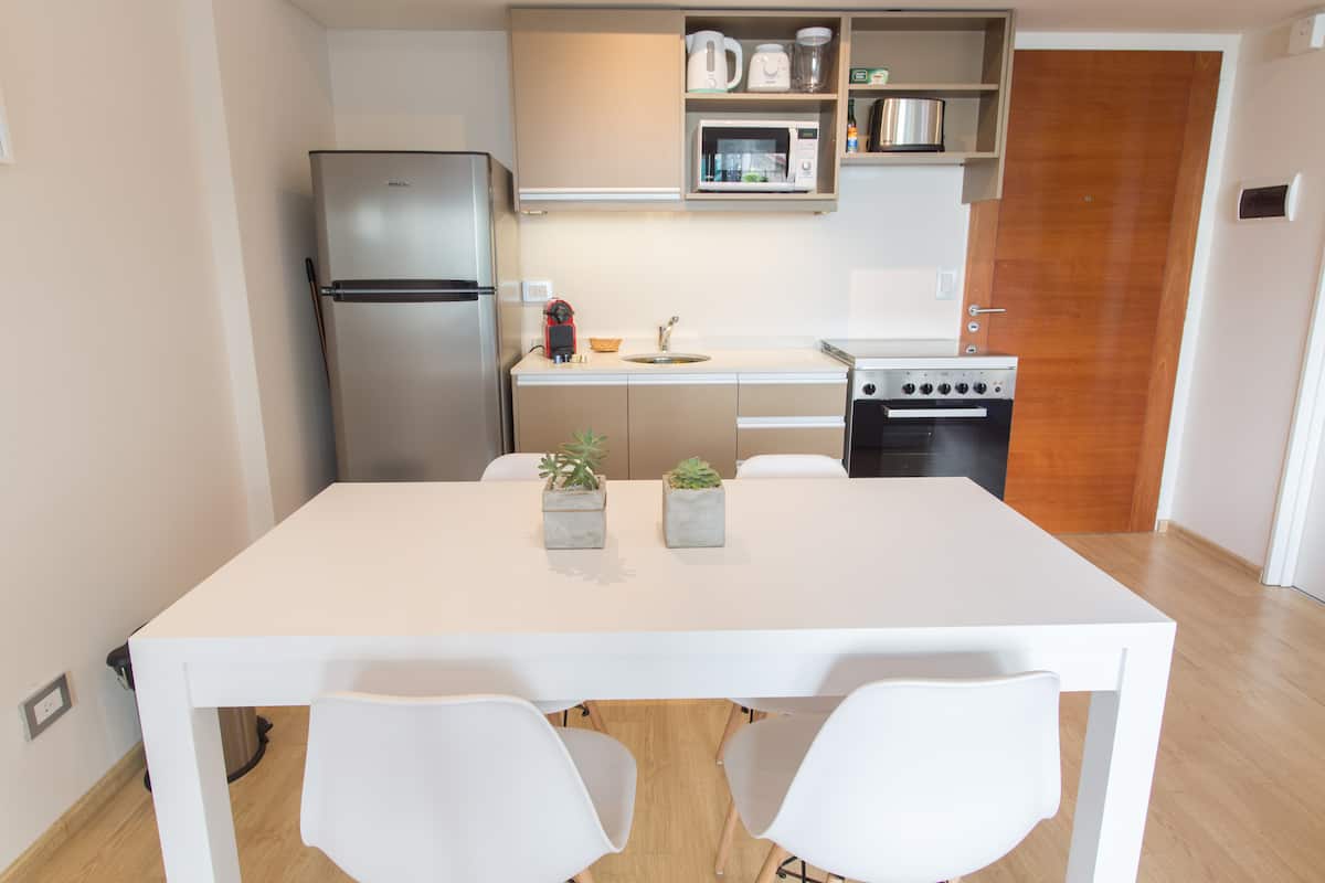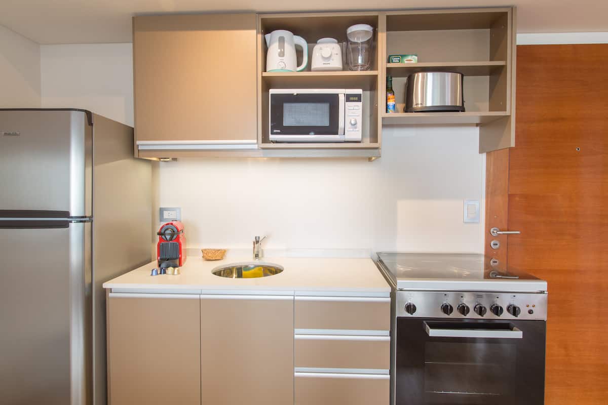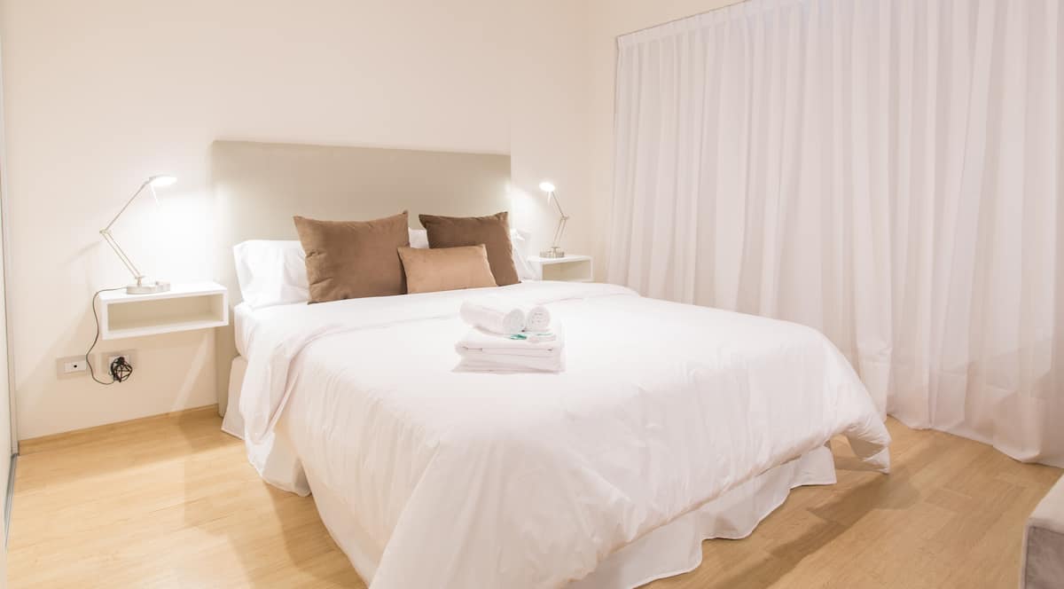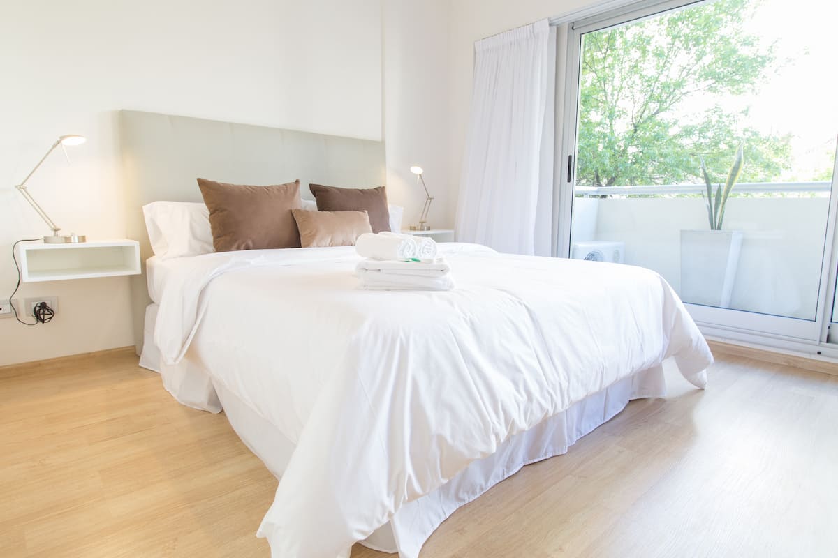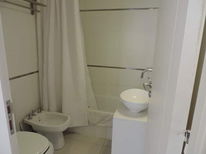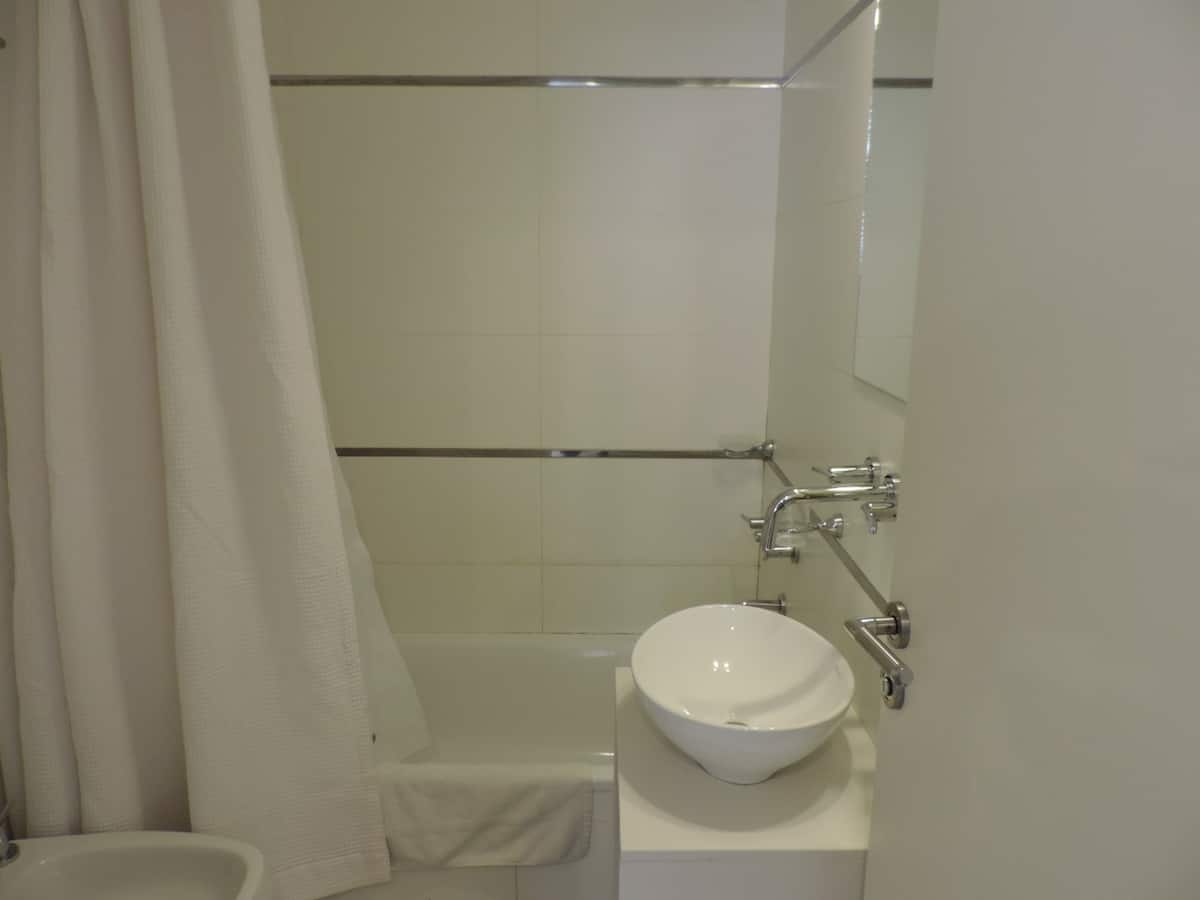 Apartamento de 46 m² em Colegiales, com varanda de frente para a rua. Estúdio mobiliado e equipado, com cama queen e sofá que se converte em 2 camas de solteiro, além de 1 banheiro completo. Tem ar-condicionado (quente/frio), TV Smart de 43”, TV a cabo HD e Wi-Fi. A cozinha inclui geladeira, micro-ondas, chaleira elétrica, cafeteira Nespresso, liquidificador e torradeira, com ferro e secador de cabelo. Horários de check-in e check-out são flexíveis conforme a agenda; em caso de troca no mesmo di