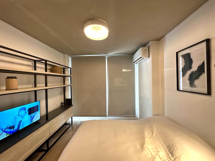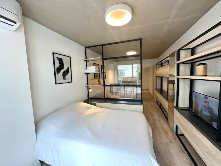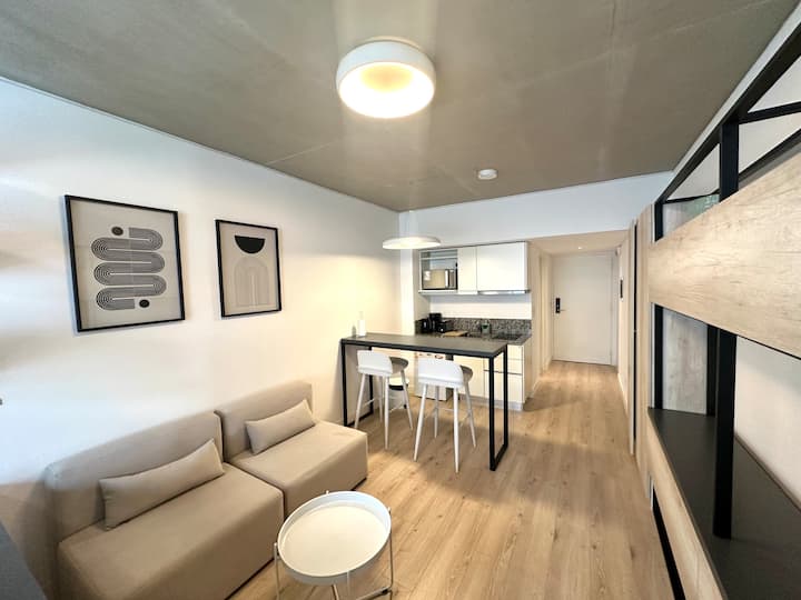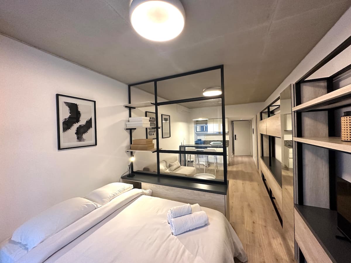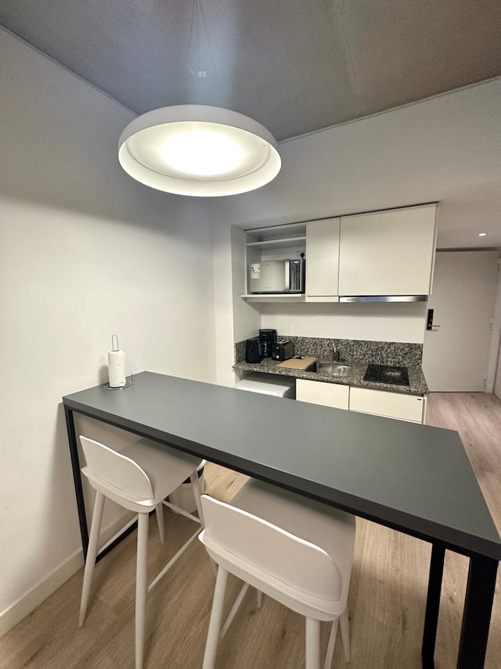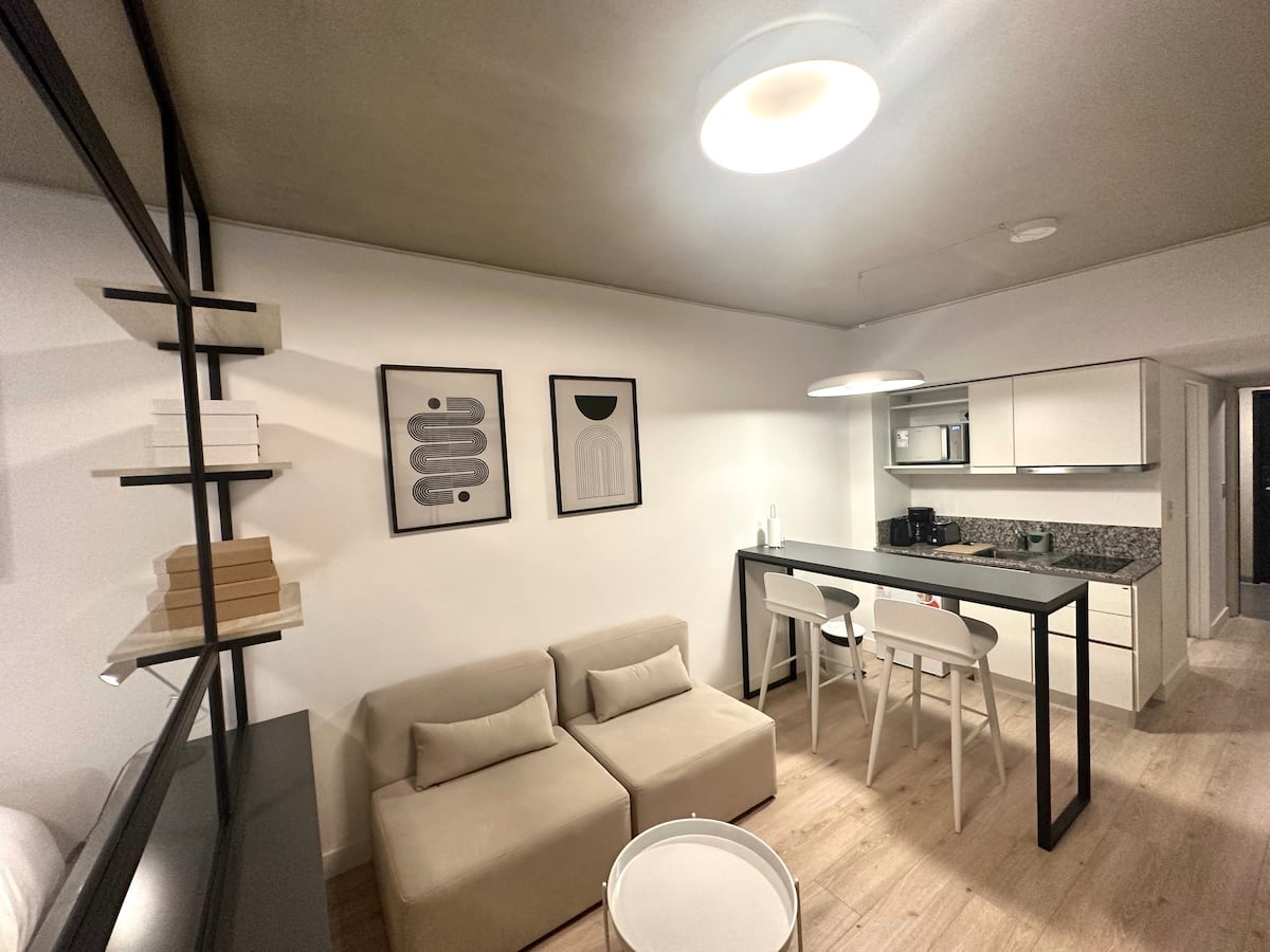 Studio em edifício voltado a apartamentos temporários, com varanda. Descreve opções de Smart TV para contas de streaming como Netflix e Amazon, além de Wi-Fi de alta velocidade. Em janeiro de 2025, uma obra de construção ao lado pode gerar ruídos entre 7h e 17h.