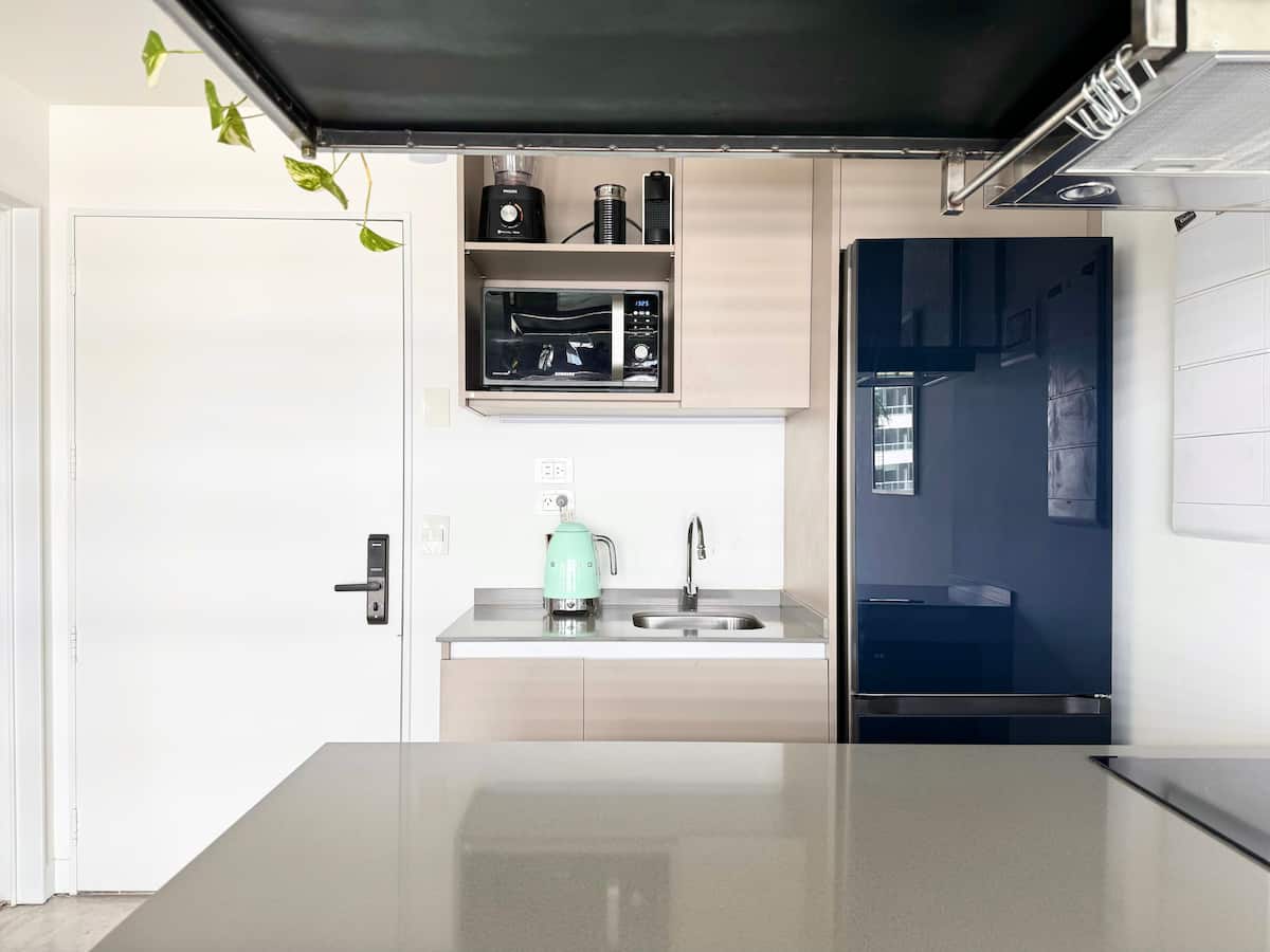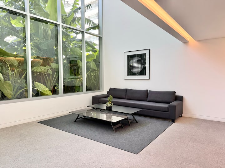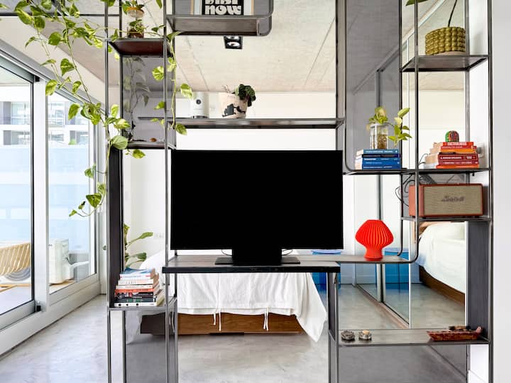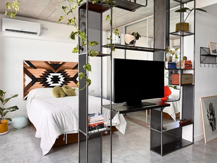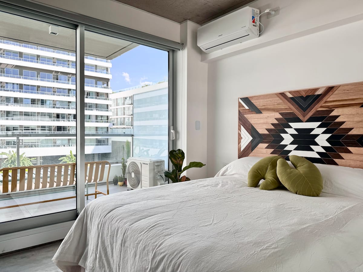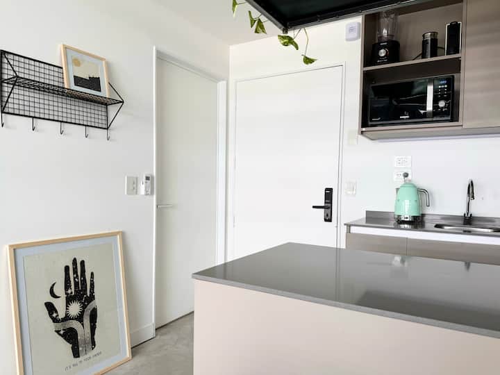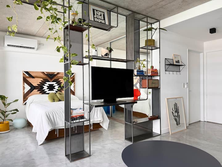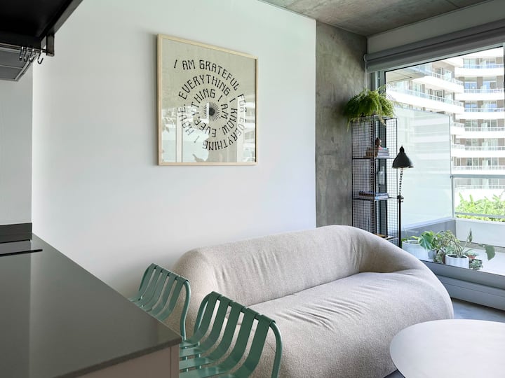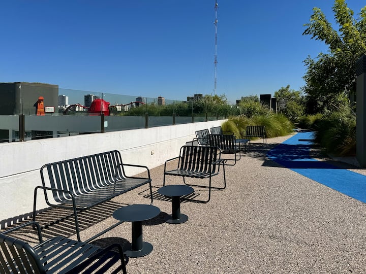 Kitnet mobiliada em um complexo residencial. Estúdio totalmente equipado para 2 pessoas. Fica na fronteira entre Palermo Hollywood e Colegiales. O complexo tem co-working no 1º andar para maiores de 18 anos, com pátios internos e mesas comunitárias. A área de bem-estar fica no 6º andar, com piscina de 25 m, whirlpool escandinavo, jacuzzi, sauna, sala de massagens e sala de relaxamento, além de academia e salas para pilates e yoga, e uma pista para corrida e caminhada em área parquizada de 350 m.
