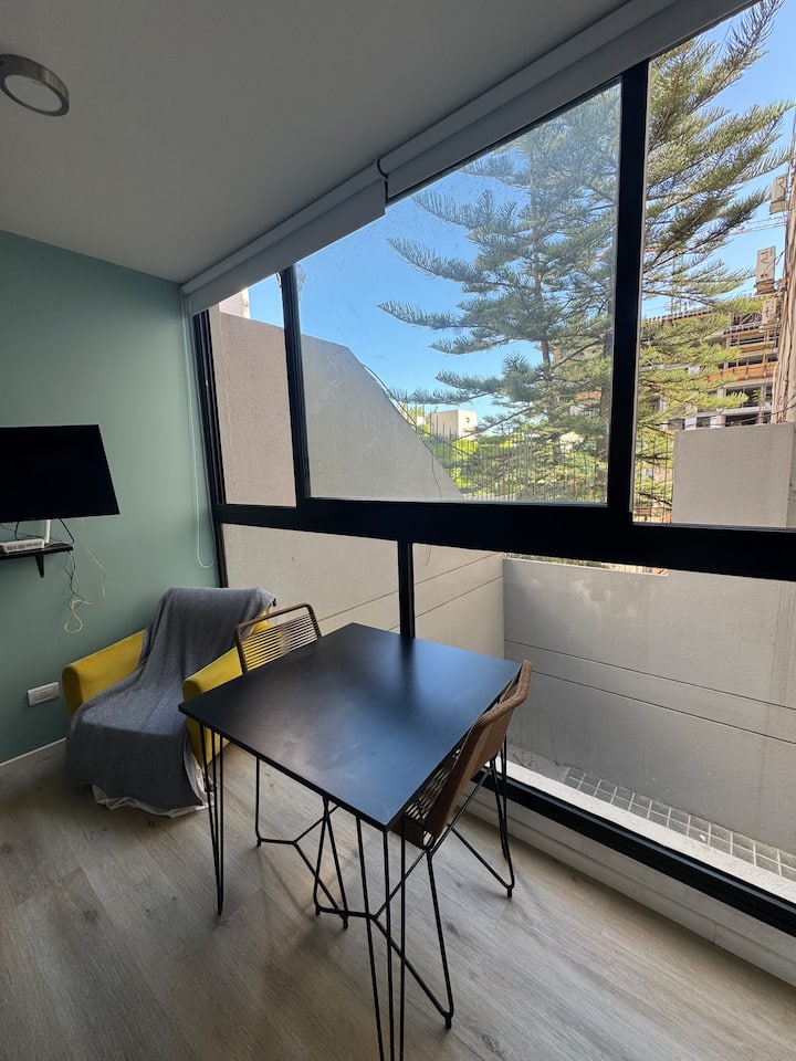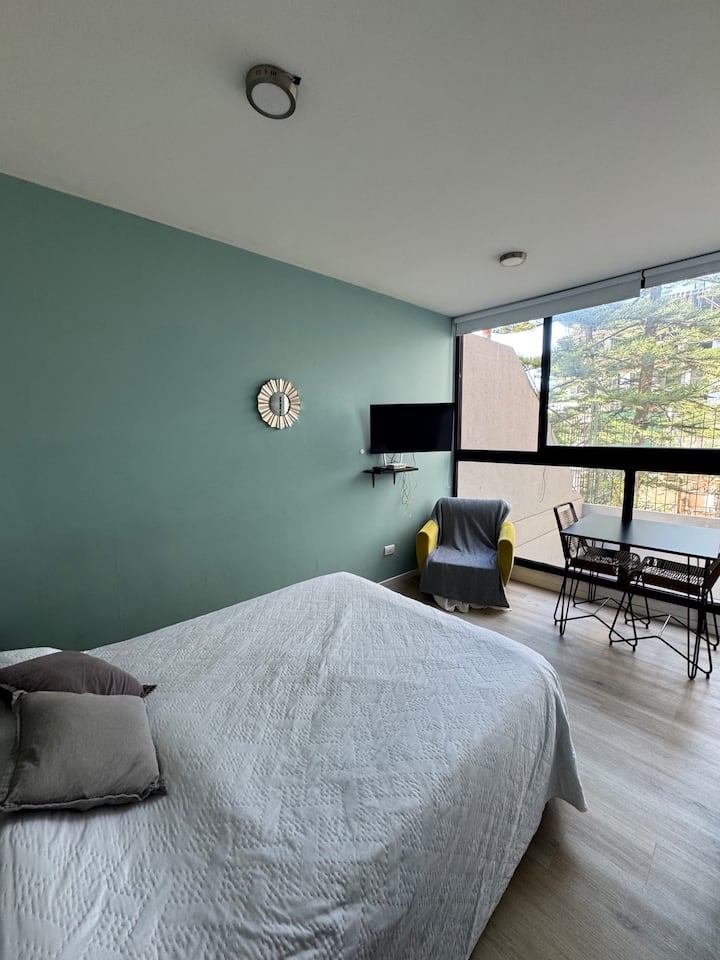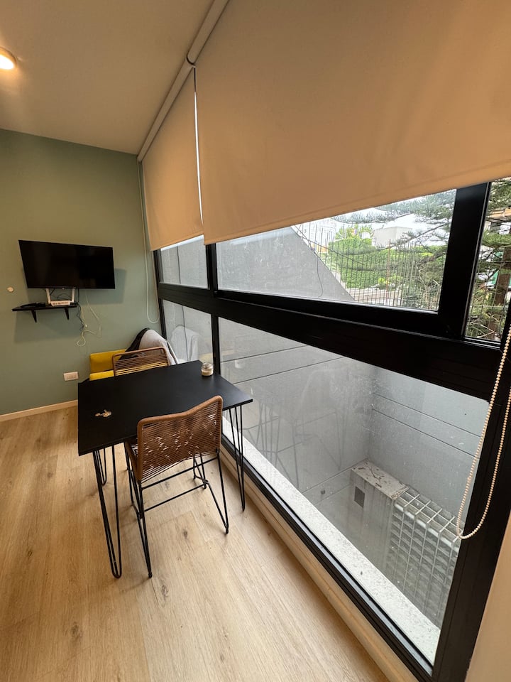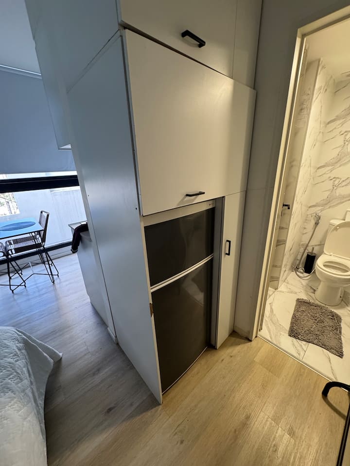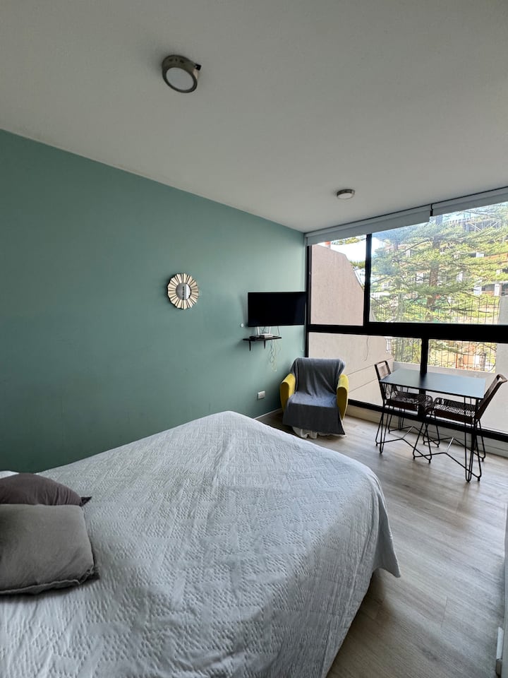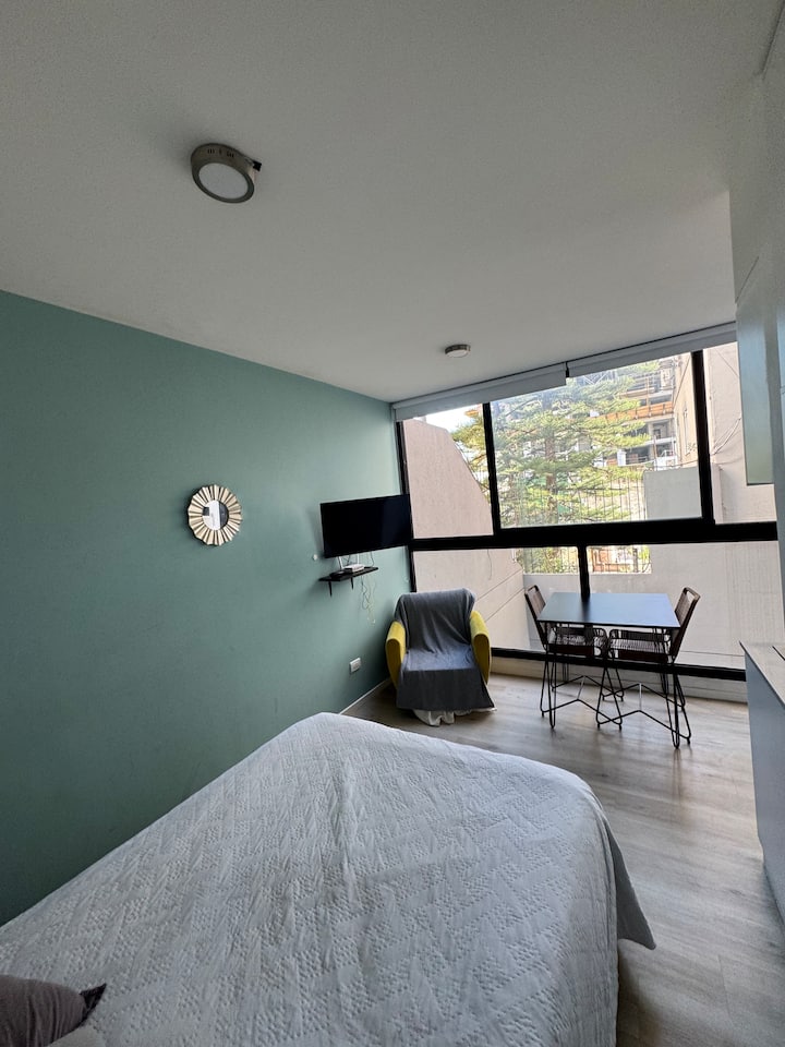 Kitnet em Colegiales, com ambiente único, mobiliada com cama de casal. Inclui Smart TV, Wi-Fi de alta velocidade, ar-condicionado e cozinha equipada com air fryer, cafeteira e geladeira, além de utensílios. O prédio tem piscina e câmeras de segurança. Não são permitidas festas e não é permitido fumar.