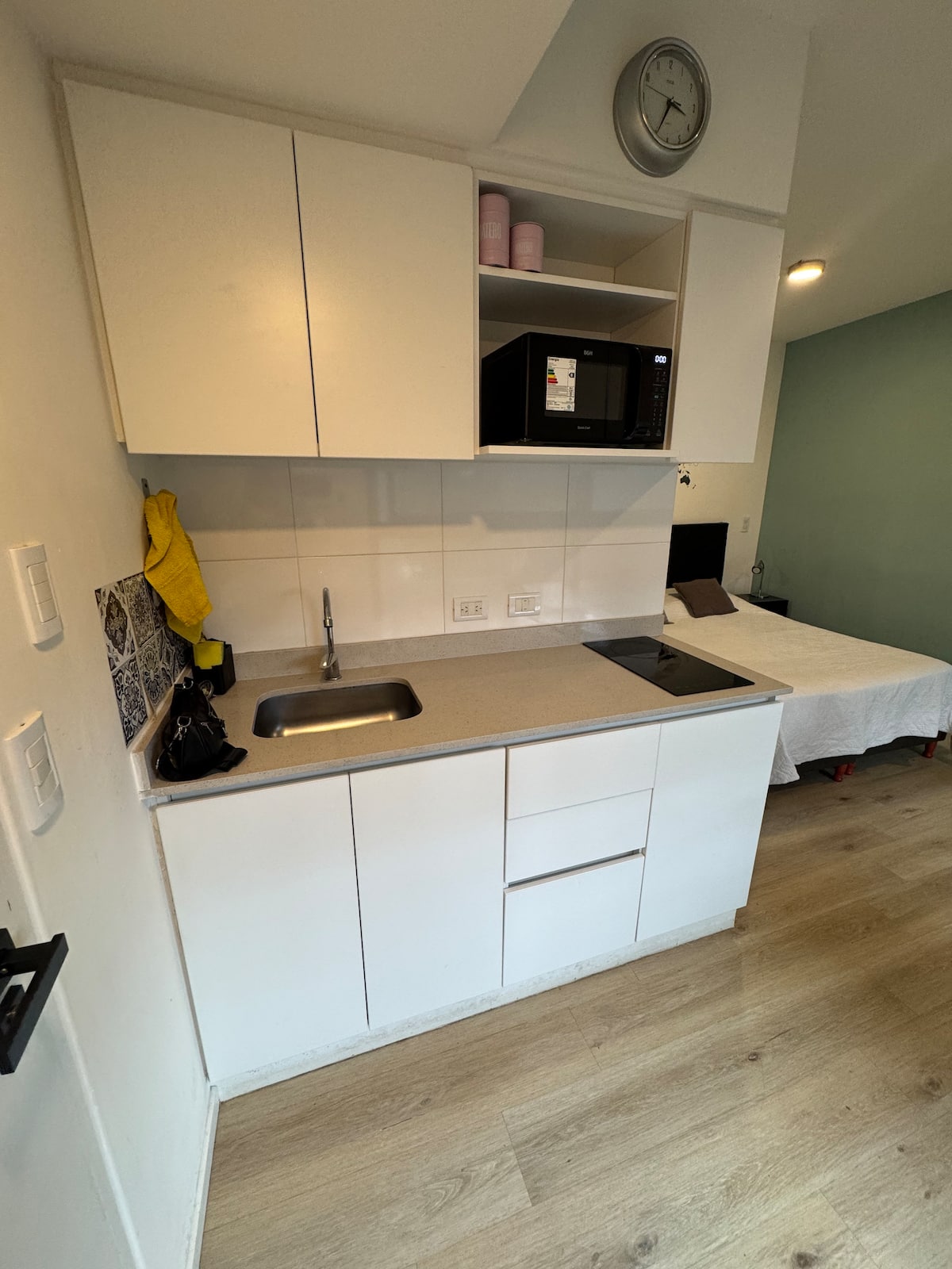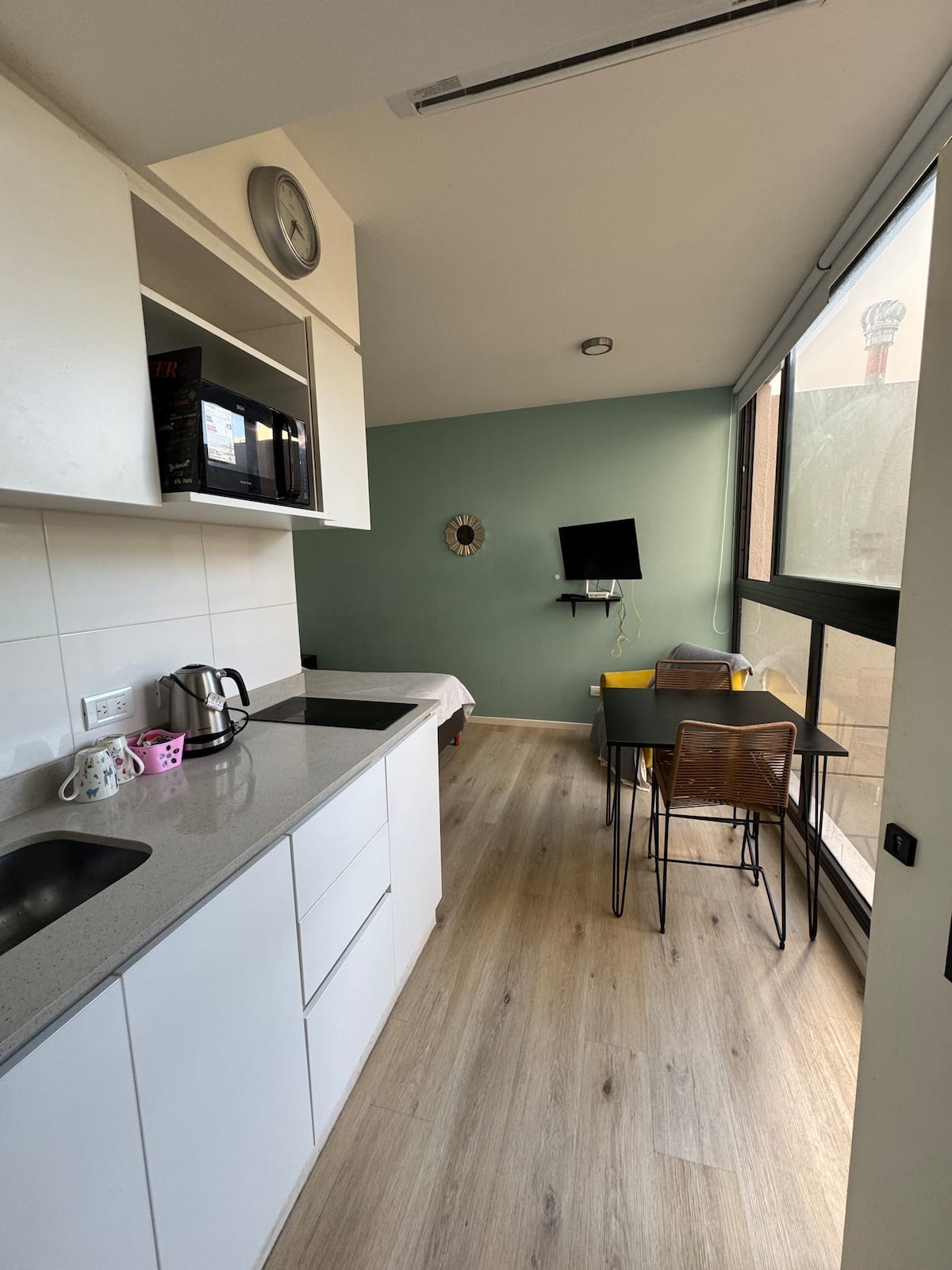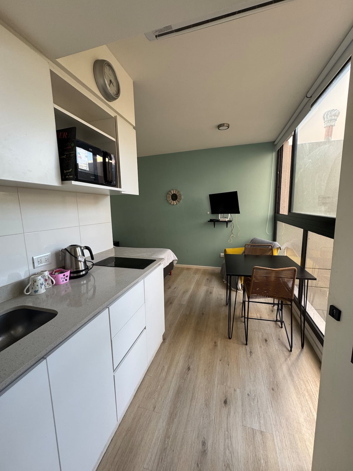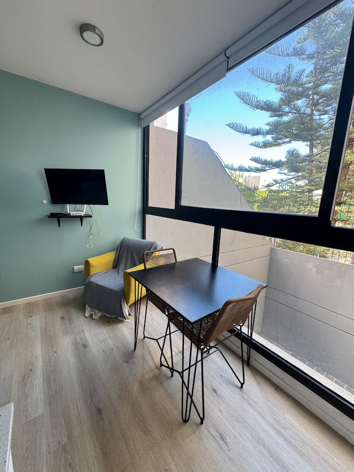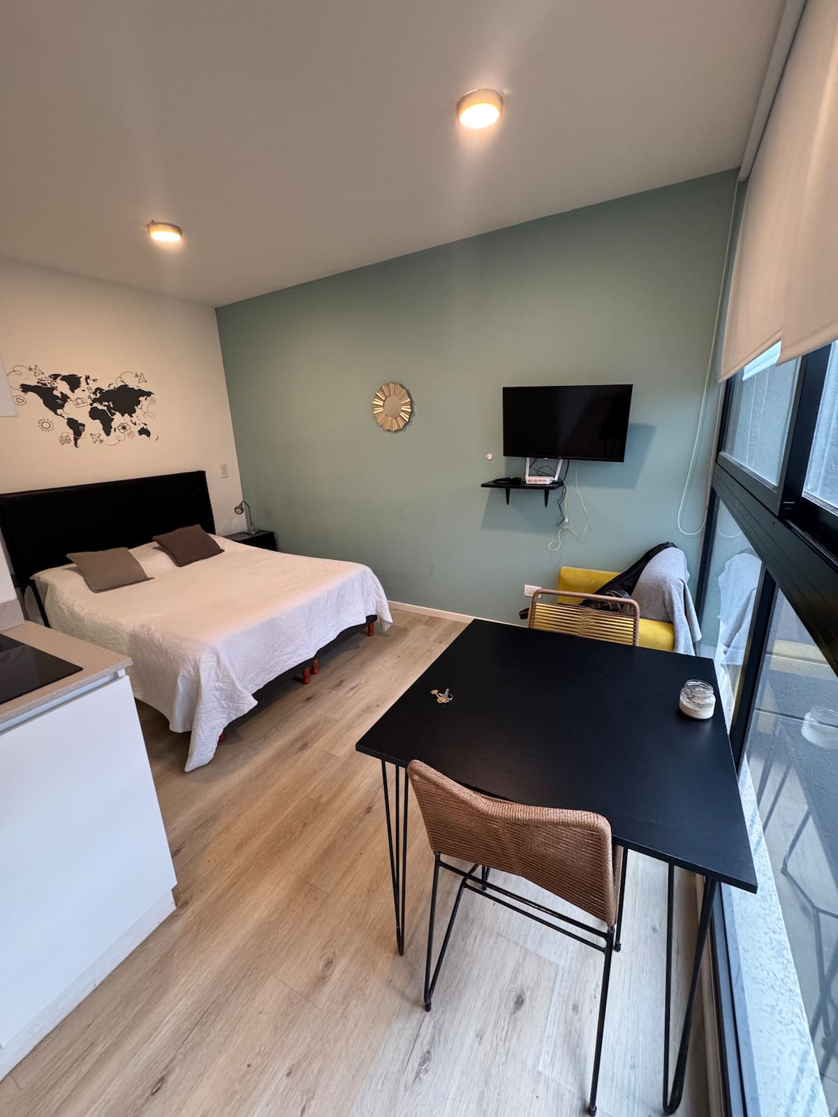 Kitnet em Colegiales, com ambiente único, mobiliada com cama de casal. Inclui Smart TV, Wi-Fi de alta velocidade, ar-condicionado e cozinha equipada com air fryer, cafeteira e geladeira, além de utensílios. O prédio tem piscina e câmeras de segurança. Não são permitidas festas e não é permitido fumar.