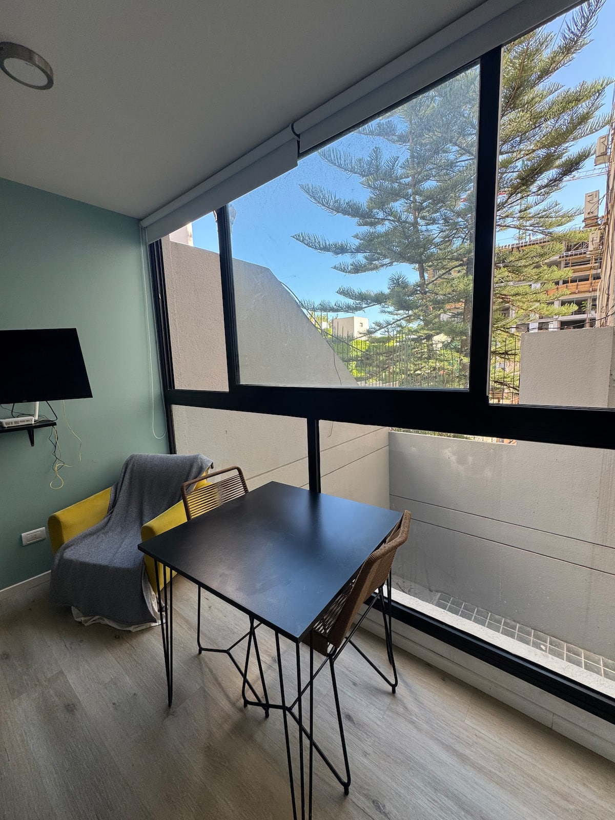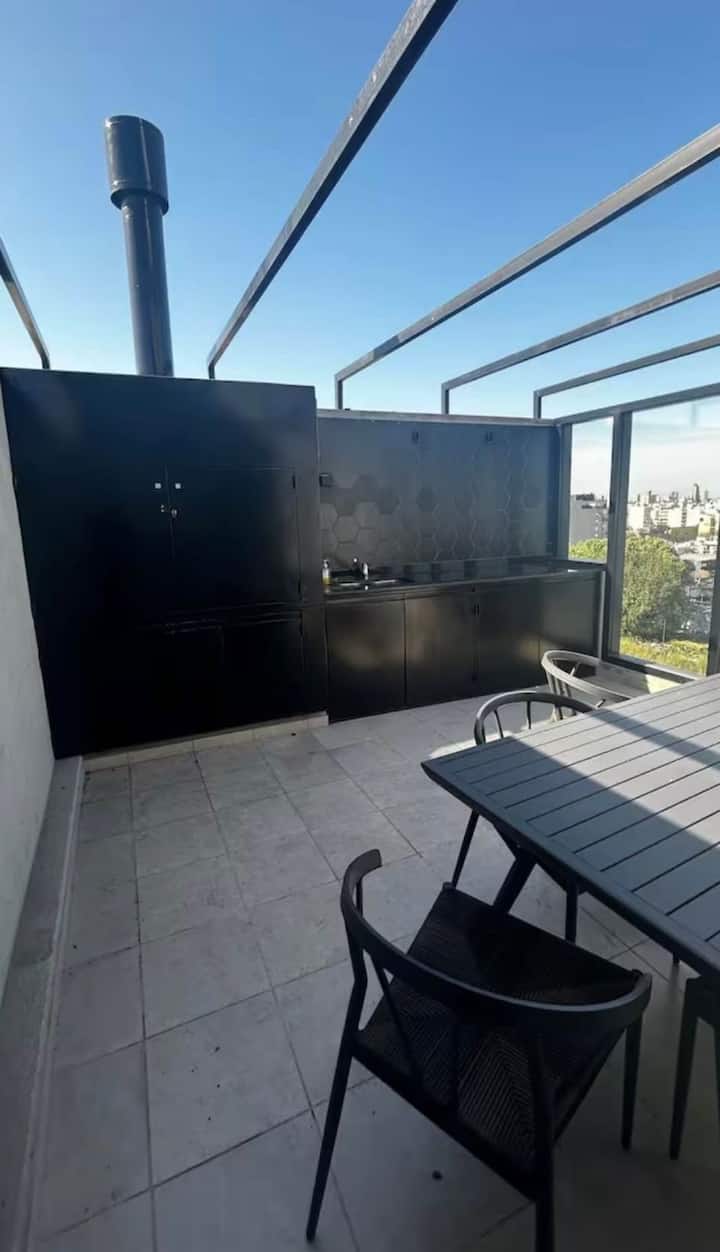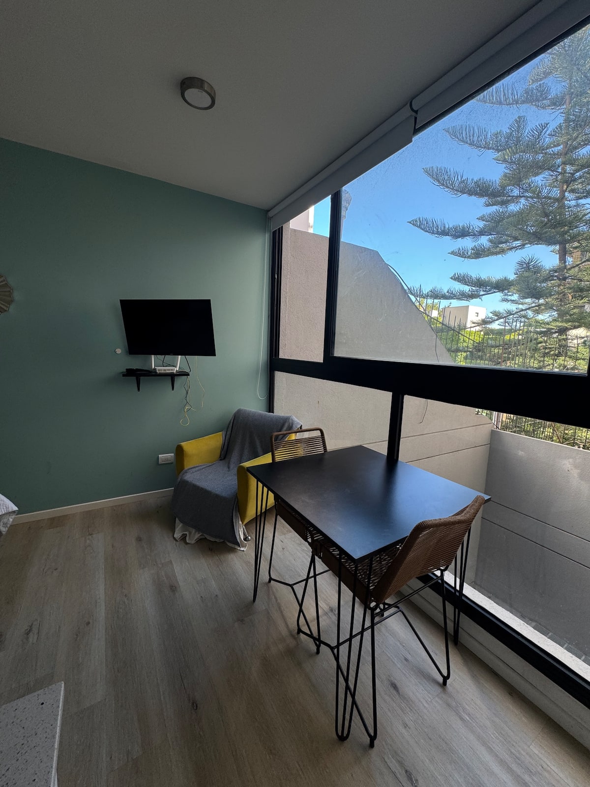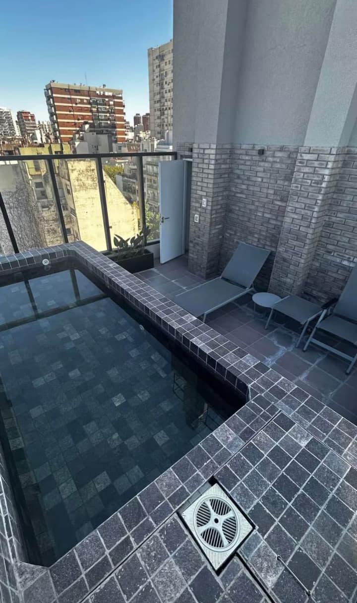 Kitnet em Colegiales, com ambiente único, mobiliada com cama de casal. Inclui Smart TV, Wi-Fi de alta velocidade, ar-condicionado e cozinha equipada com air fryer, cafeteira e geladeira, além de utensílios. O prédio tem piscina e câmeras de segurança. Não são permitidas festas e não é permitido fumar.