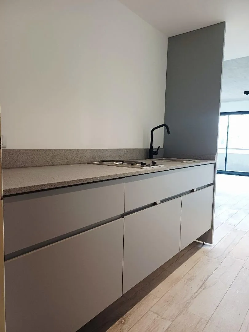 Kitnet novo (nunca habitado) de 40 m² totais, de fundos, com varanda em área de terraço voltada para o leste, com deck. Cozinha com cooktop de 2 bocas e banheiro completo com ducha, além de split frio/calor. O prédio tem piscina no 15º andar com solarium, laundry, salão de festas no 15º andar, academia no 1º subsolo com luz natural, espaço de cowork na planta baixa, área para bicicletas, elevadores inteligentes, circuito de TV com câmeras e conexão de alarme.