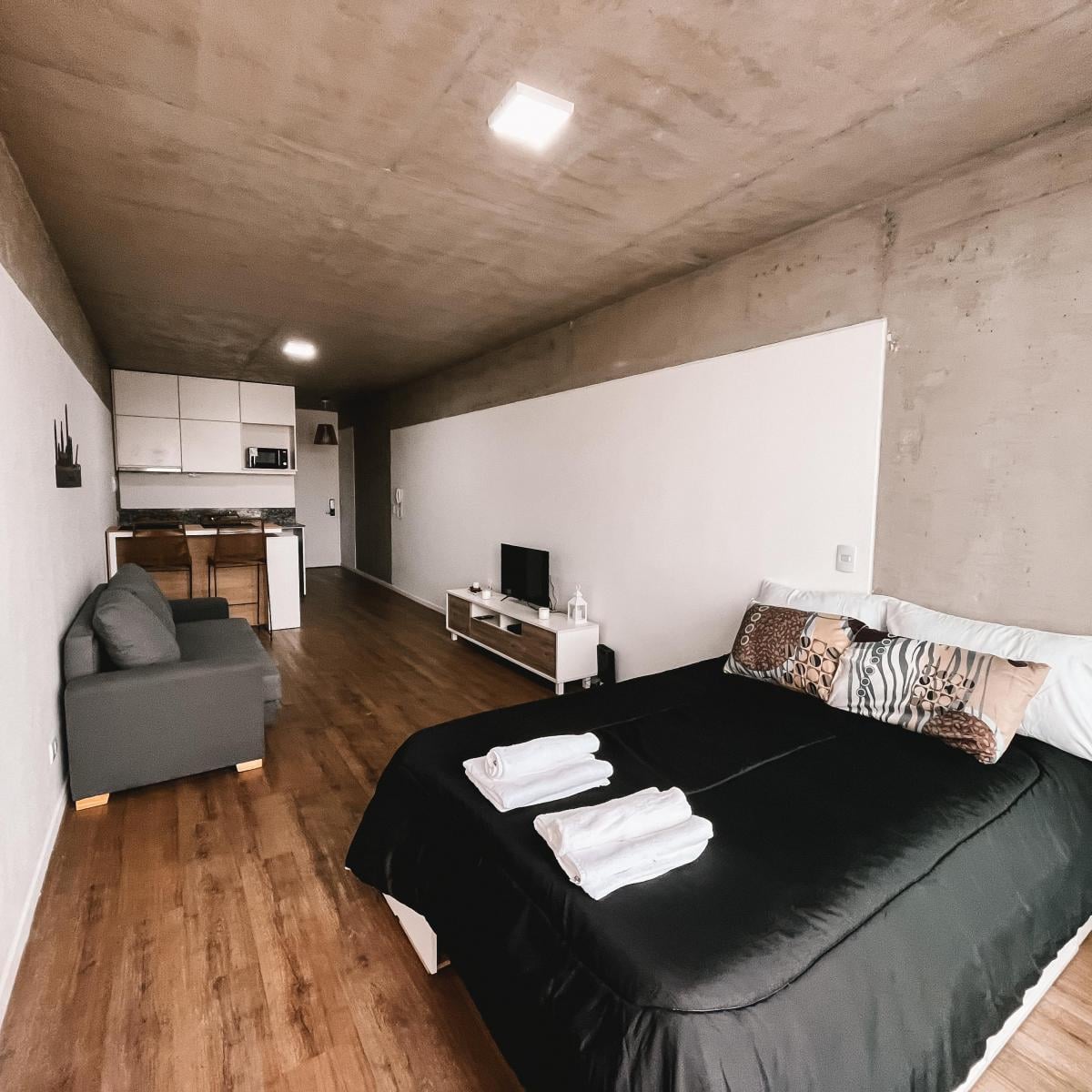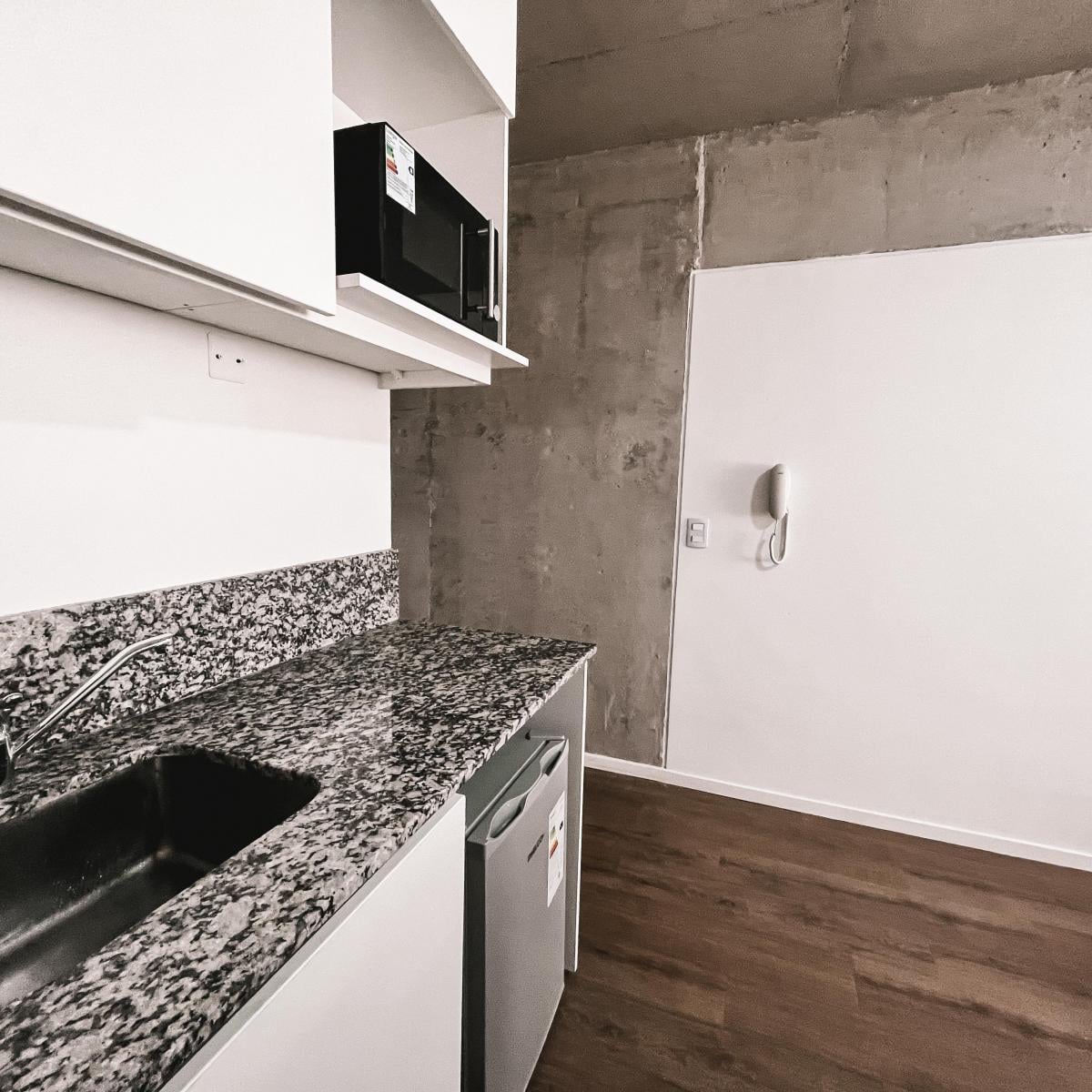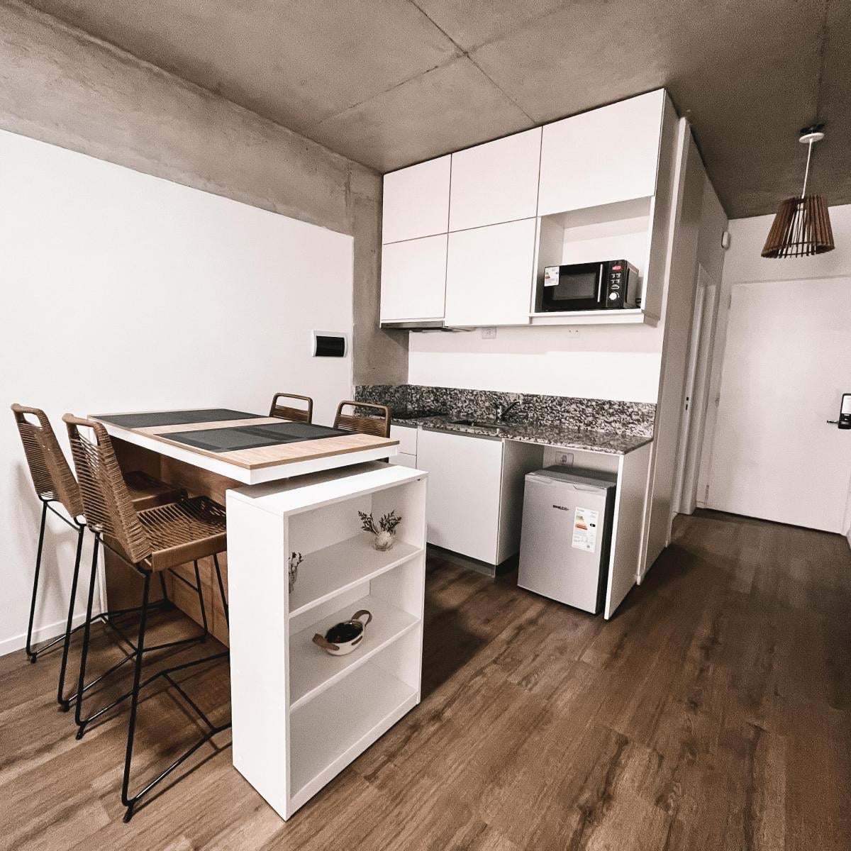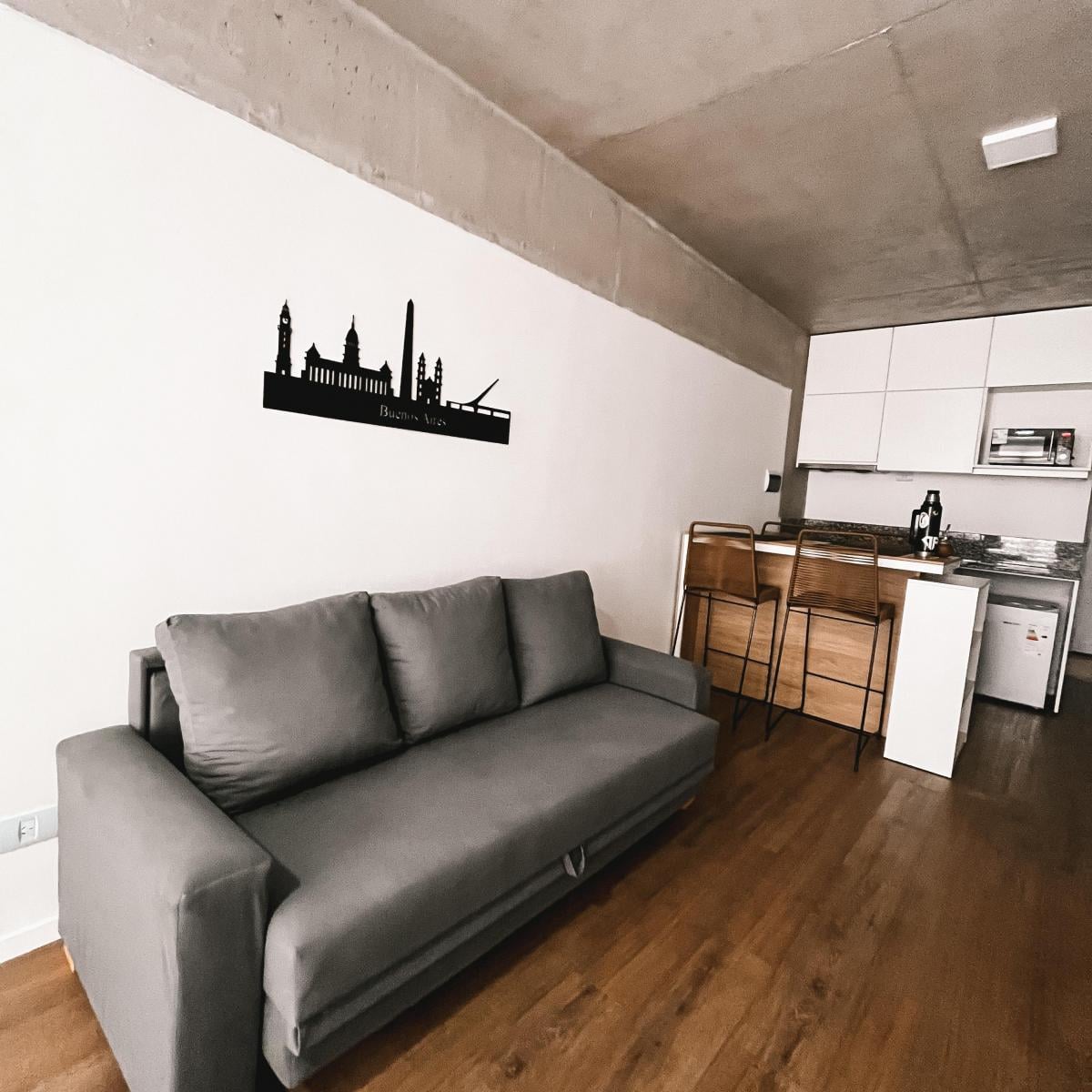 Kitnet (monoambiente) em San Telmo, Buenos Aires. Cozinha integrada com bancada tipo “bar” para café da manhã. O prédio oferece serviço de laundry, solário e salão de usos múltiplos (SUM) equipado com área de churrasco (parrilla). Contrato temporário mensal, trimestral ou semestral, com 1 mês de adiantamento; não são aceitos animais.