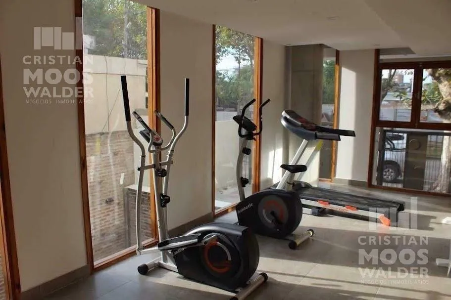 Apartamento tipo monoambiente em aluguel, mobiliado, com ar-condicionado. Inclui cozinha com eletrodomésticos e banheiro com bidê e ducha. O imóvel tem varanda. O prédio informa disponibilidade de academia e fica em Belén de Escobar.
