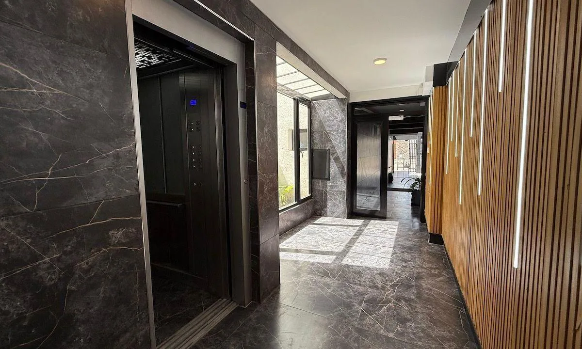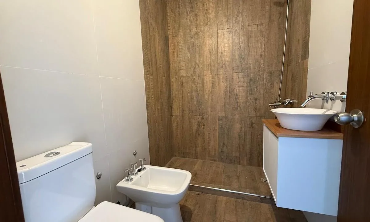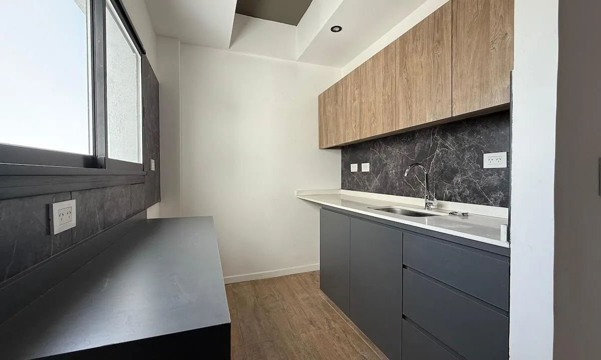 Kitnet novo (nunca habitado) em Av. Julio A. Roca, em Hurlingham. Disponível no 4º, 5º e 6º andares, unidades B (de frente para a rua) e D (de fundos). Planta com ambiente único, cozinha separada com bancada de mármore e móveis de cozinha, banheiro completo com ducha e lavatório suspenso, além de varanda com churrasqueira. Piso em porcelanato imitando madeira e sistema de aquecimento por laje radiante; pré-instalação para ar-condicionado.