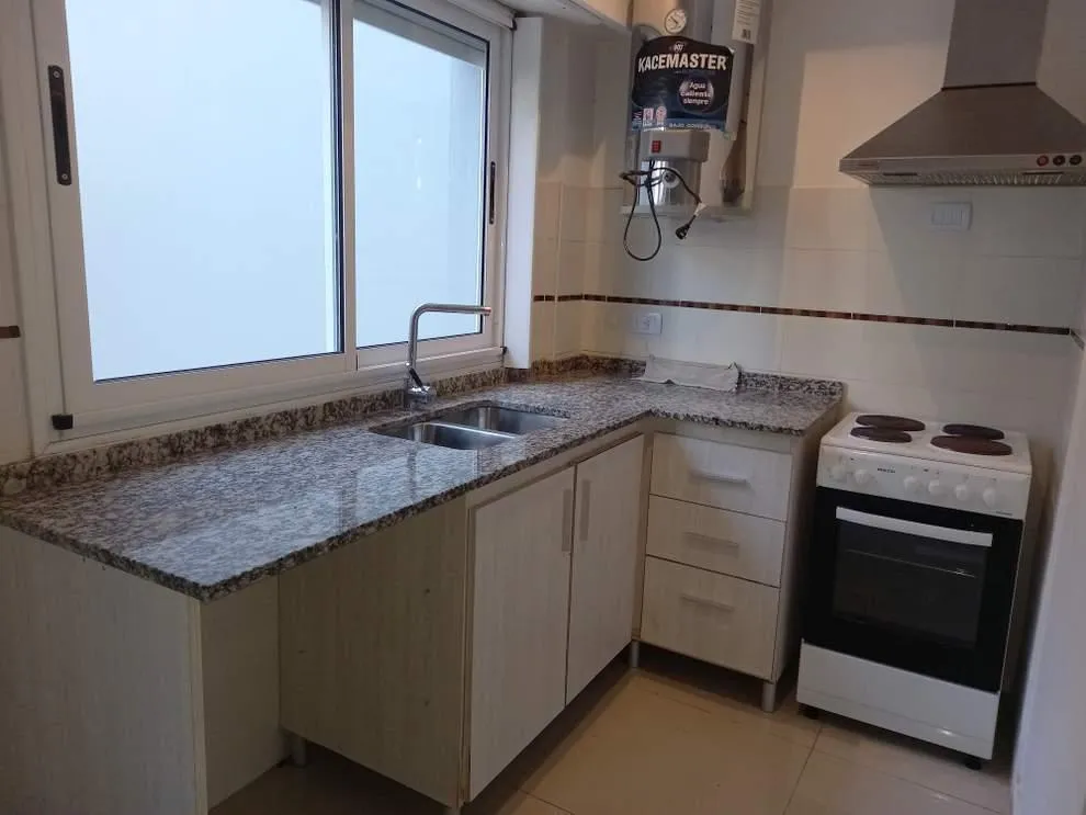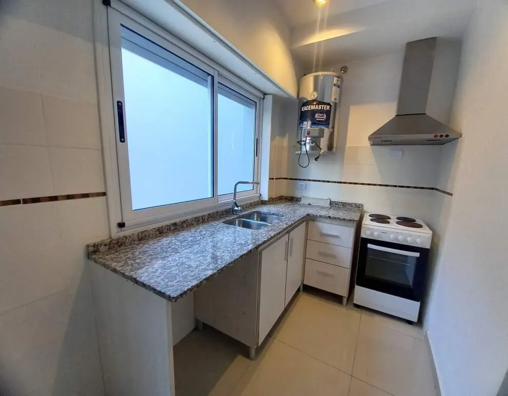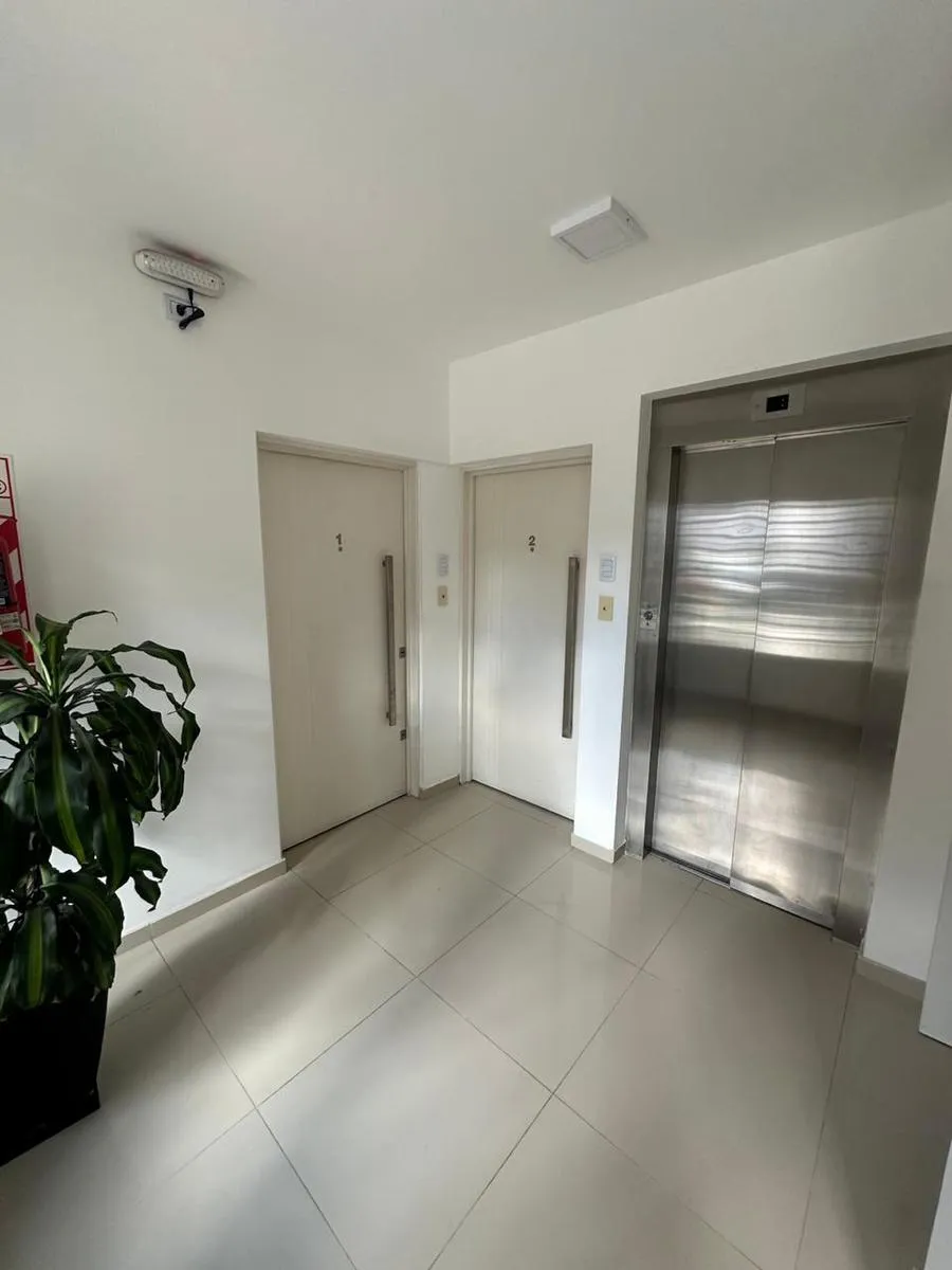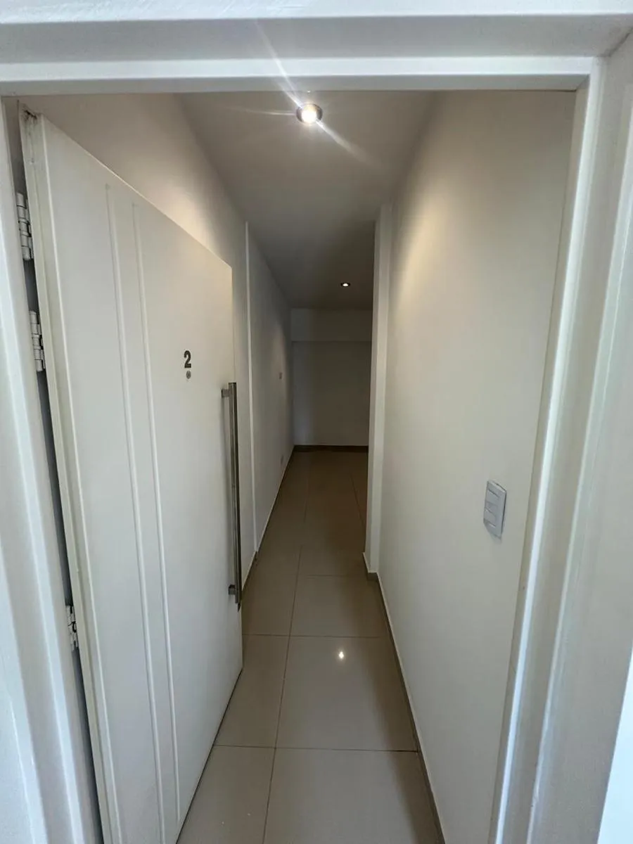 Kitnet (monoambiente) com cozinha integrada, móveis sob a bancada e ventilação natural. Banheiro completo com banheira e saída para pátio próprio, que pode ser usado como área externa ou para lavanderia. Pisos de porcelanato e boa iluminação natural.