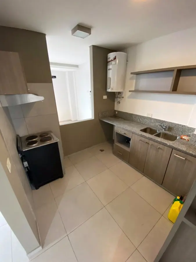Kitnet com 1 ambiente, varanda de frente e cozinha integrada. Possui armários inferiores e alacena, fogão elétrico e aquecedor de água elétrico, além de banheiro completo com banheira e área de dormitório com guarda-roupa com interior. O imóvel tem garagem e elevador em um prédio com 12 unidades.