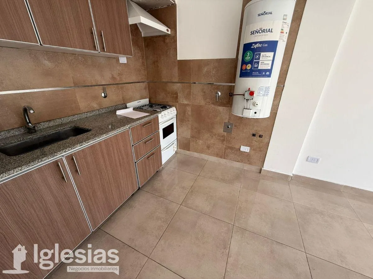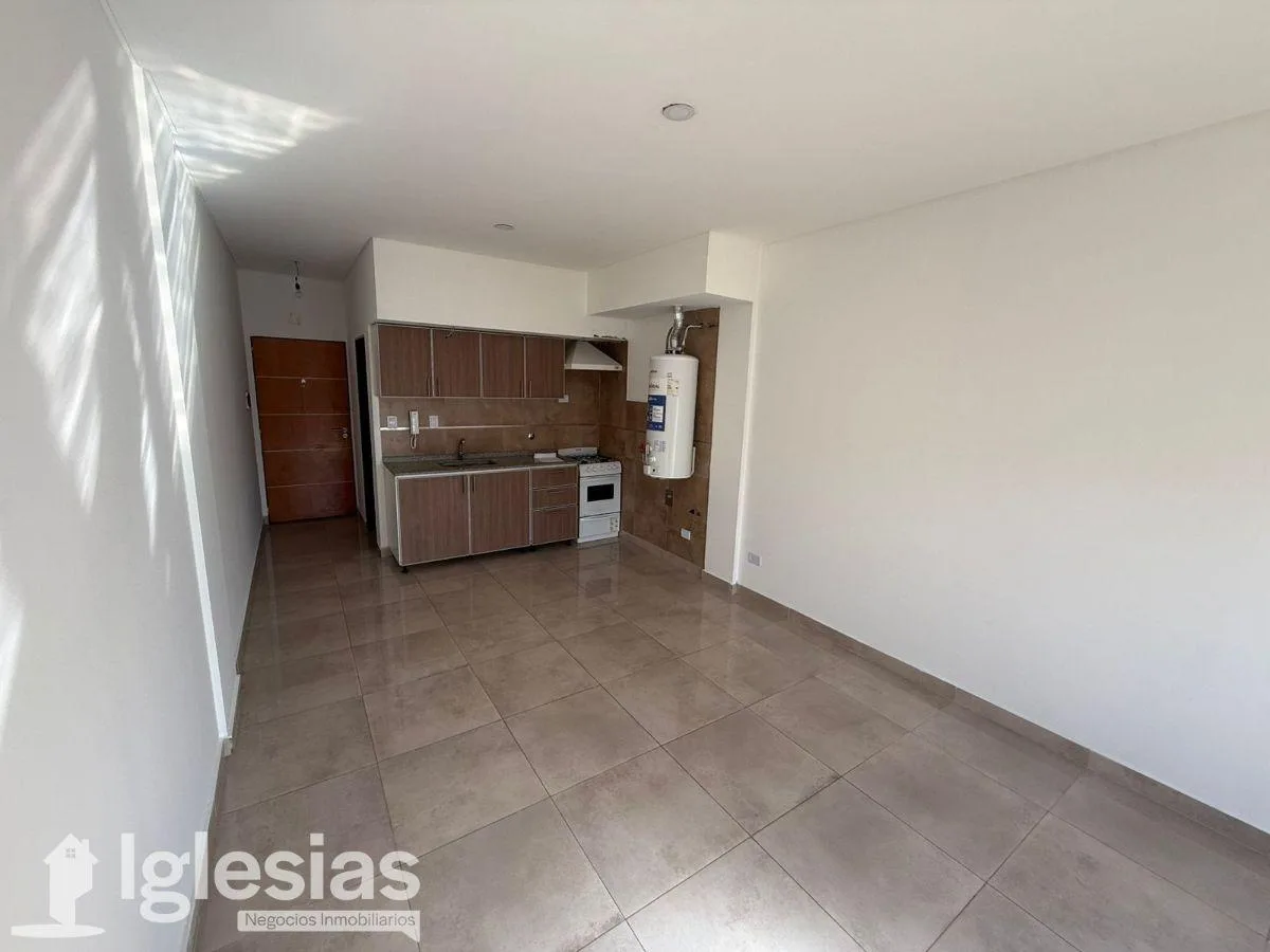 Apartamento de 1 ambiente (kitnet) em Ciudad Madero, com dormitório único. O imóvel tem mobília de armário inferior e armário superior na cozinha, cozinha com forno, instalação para máquina de lavar roupa, estufa de tiro balanceado, banheiro completo e varanda de frente para a rua.
