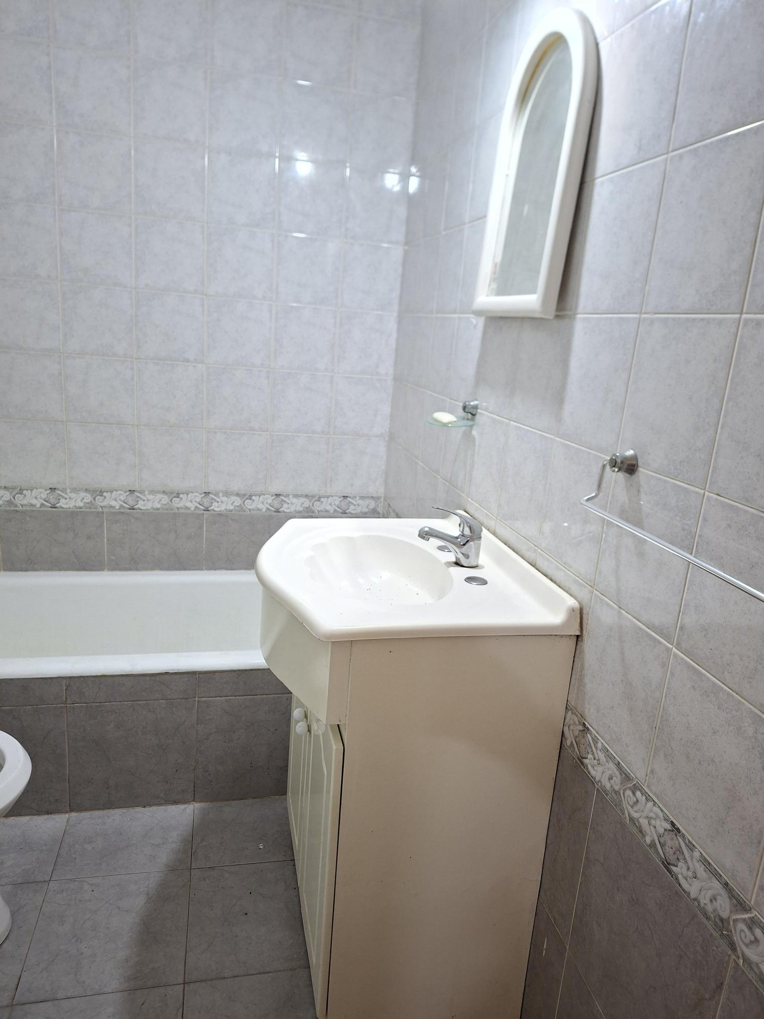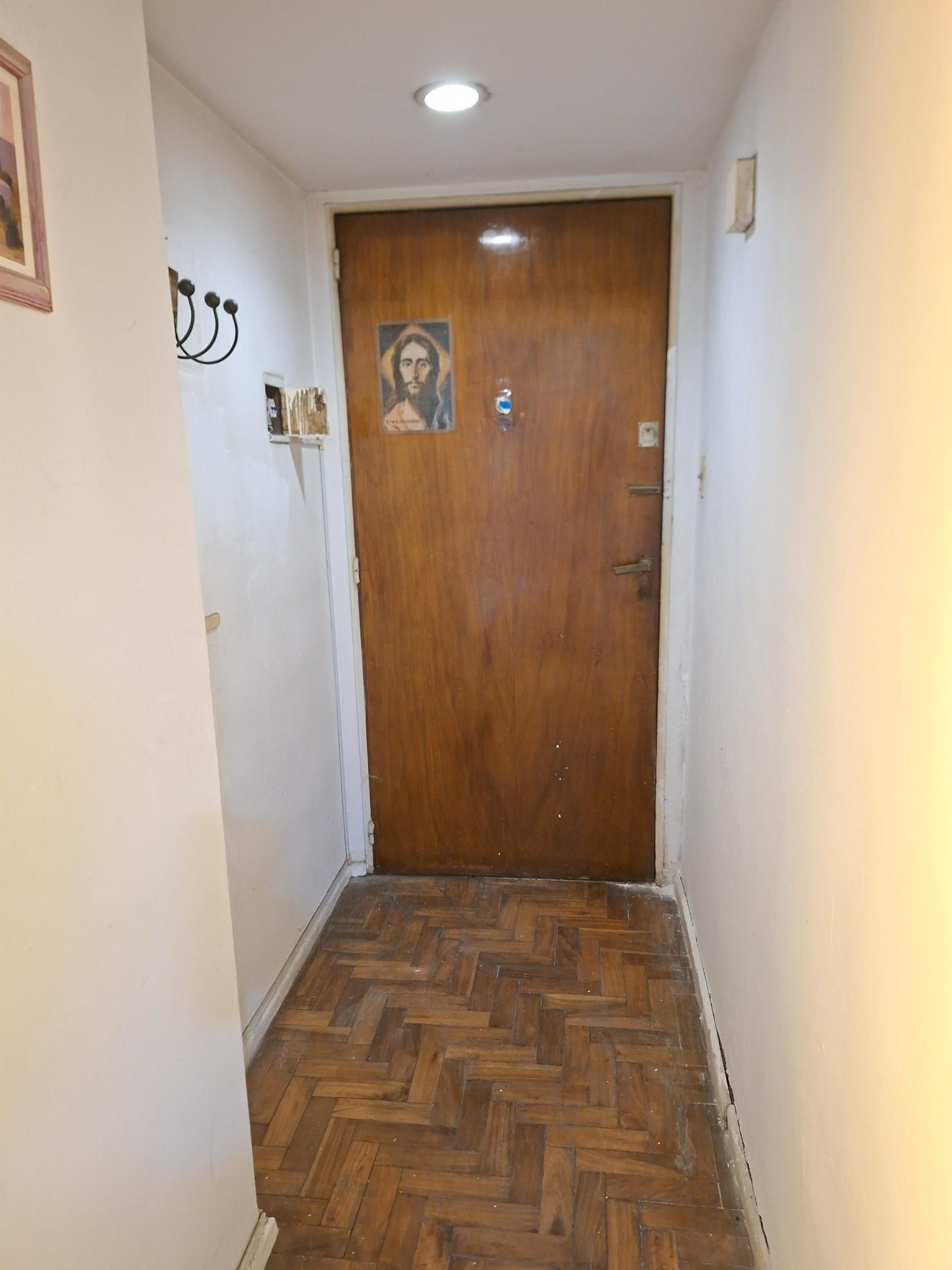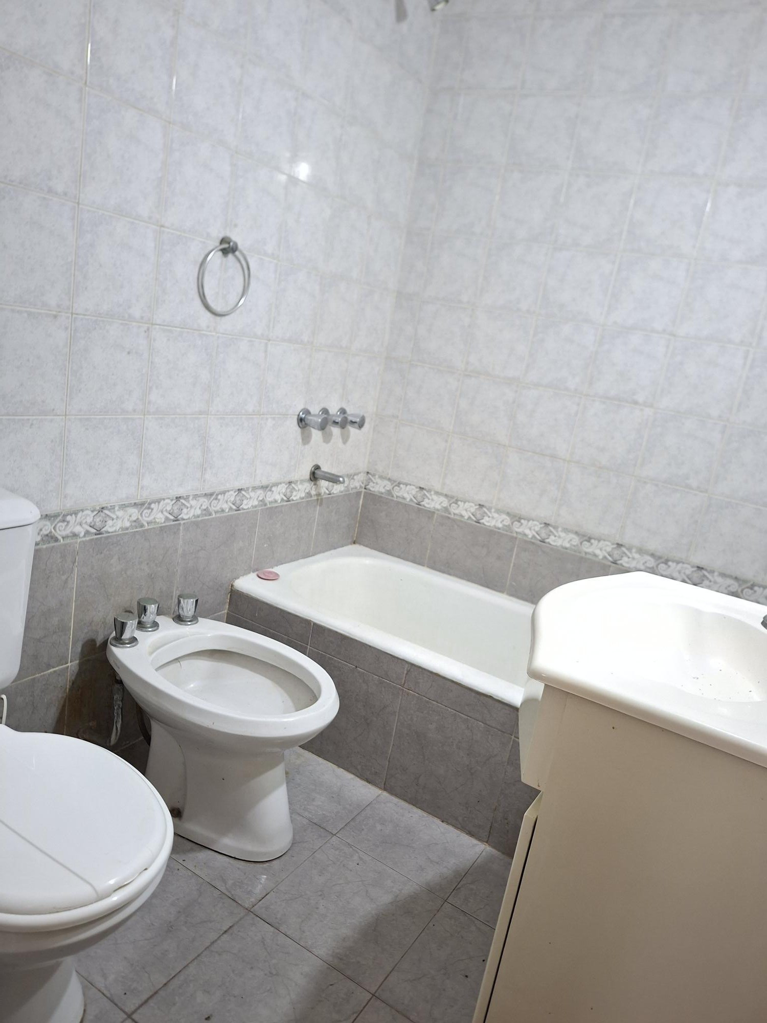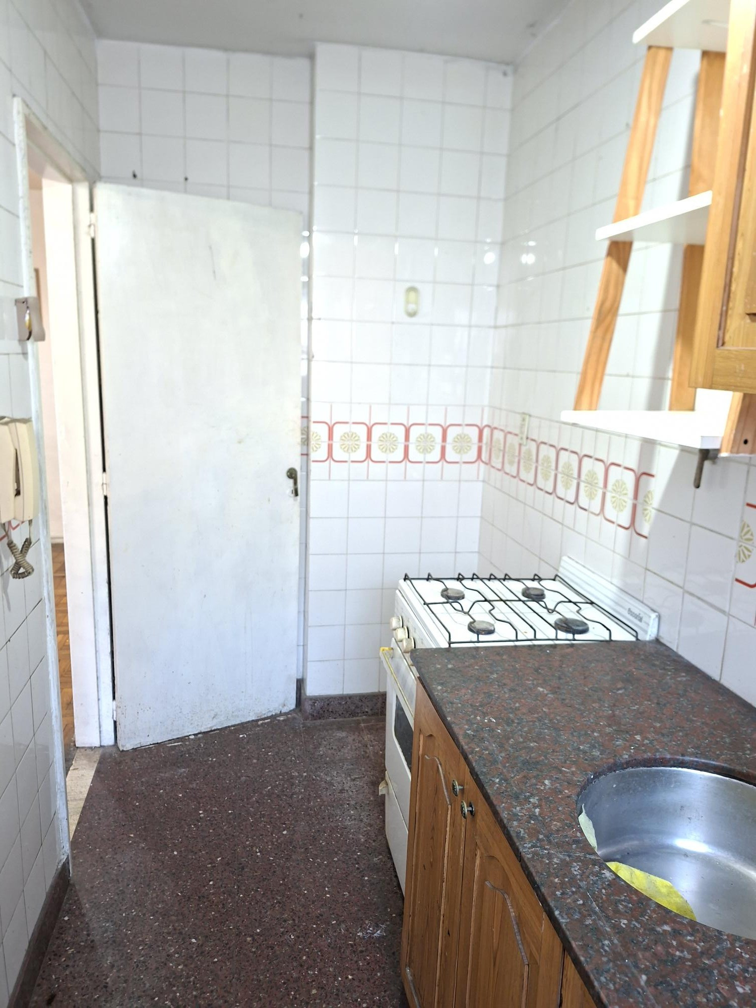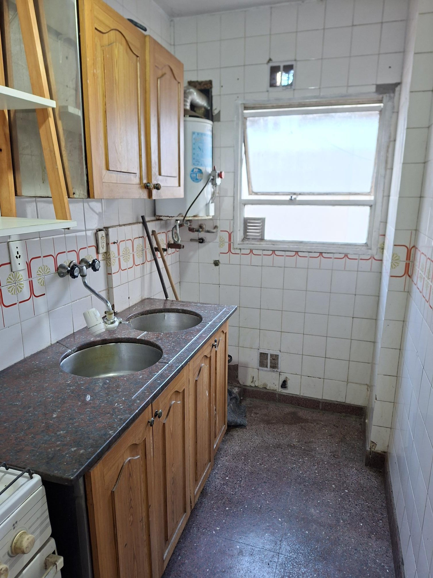 Apartamento de 1 ambiente com 25 m² cobertos, no 1º andar, de fundos (contrafrente). A planta tem cozinha e living com área de jantar, além de 1 banheiro completo. Está orientado para noroeste, sem mobília. O prédio tem cerca de 40 anos e dispõe de elevador.