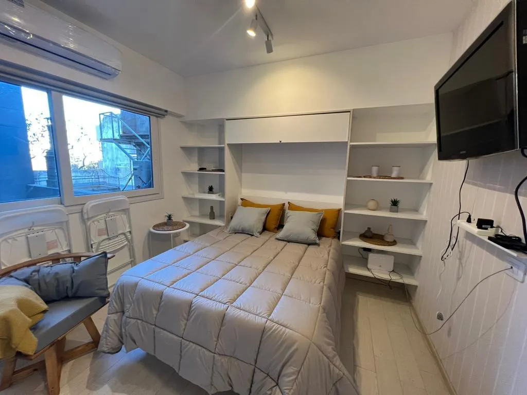 Aluguel temporário de kitnet mobiliada em La Paternal. Unidade monoambiente com 20 m² totais, 1 banheiro completo e split frio/quente. Inclui geladeira, cama e outros itens para entrada imediata, além de Wi-Fi. O aluguel pode ser feito de 3 noites a 3 meses, com opção de renovação.