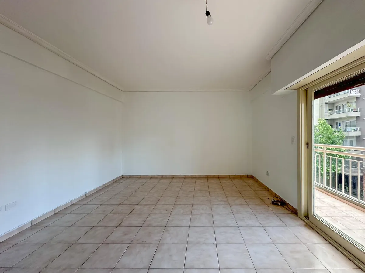 Kitnet de 3º andar em Lanús Oeste, com 1 ambiente e varanda. Cozinha com móveis sob a bancada, fogão a gás e aquecedor (calefón). Banheiro completo com banheira. Aluguel mais condomínio, serviços e TSG; não aceita animais de estimação.