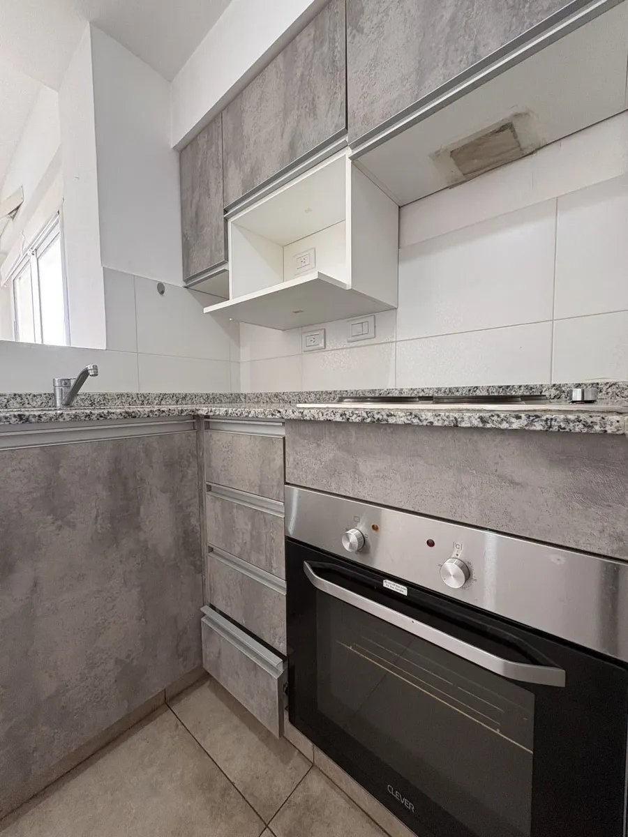 Apartamento tipo kitnet “divisible” com 38 m² no 4º andar, de disposição lateral. Possui ambiente único com setor de dormitório definido, sala de jantar integrada à cozinha, 1 banheiro completo e espaço para lavadora. Cozinha com armários inferiores e superiores, bancada em granito, forno embutido e cooktop elétrico; pisos cerâmicos em todos os ambientes e janelas de alumínio. Aquecimento por split frio e quente e água quente por termoacumulador. Vaga de garagem incluída; prédio com elevador. Lo