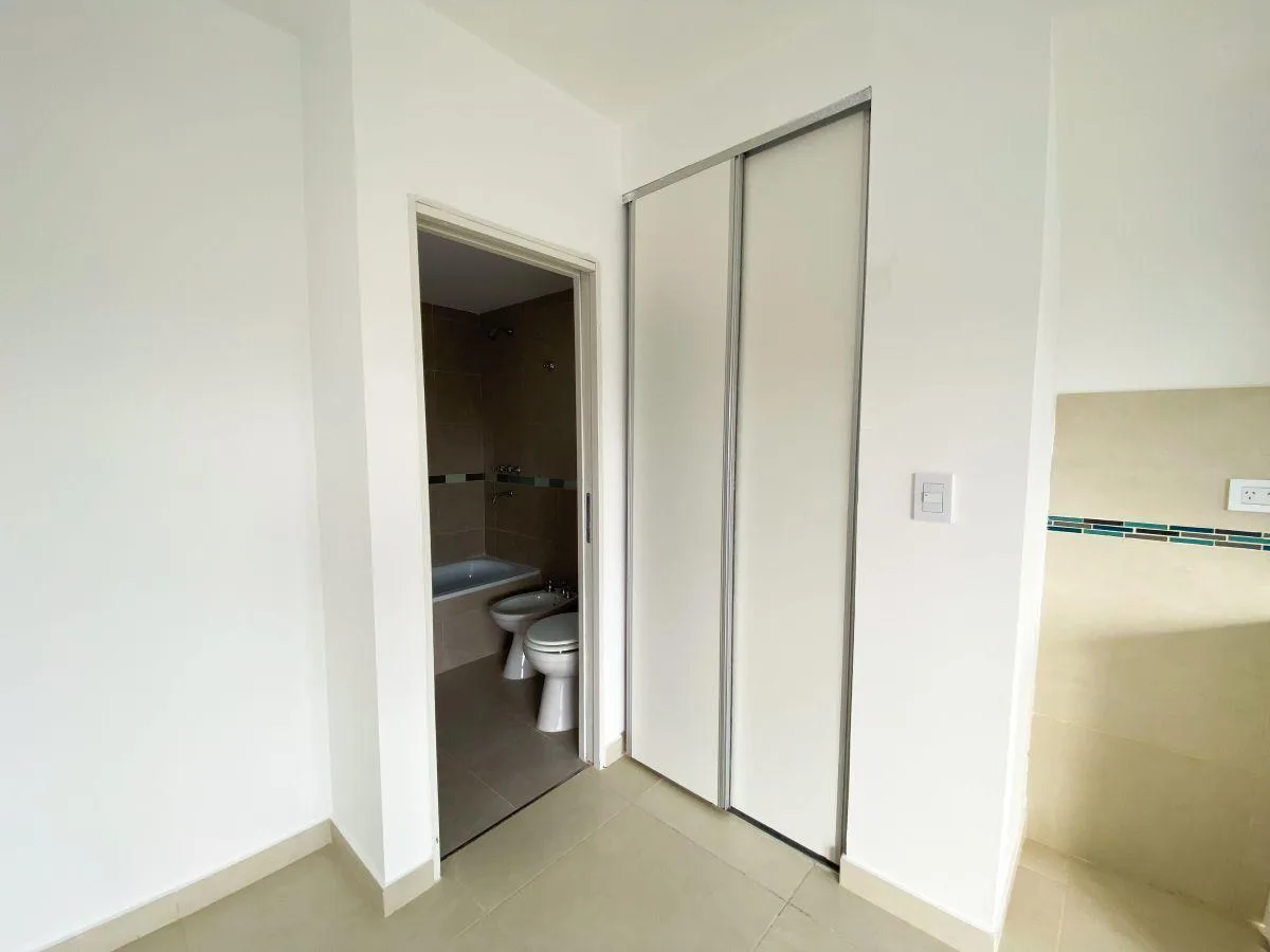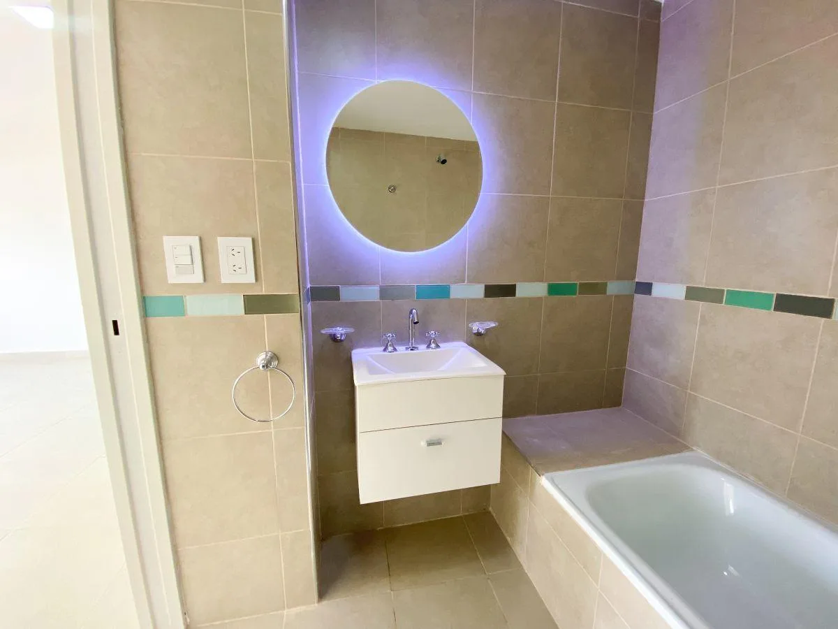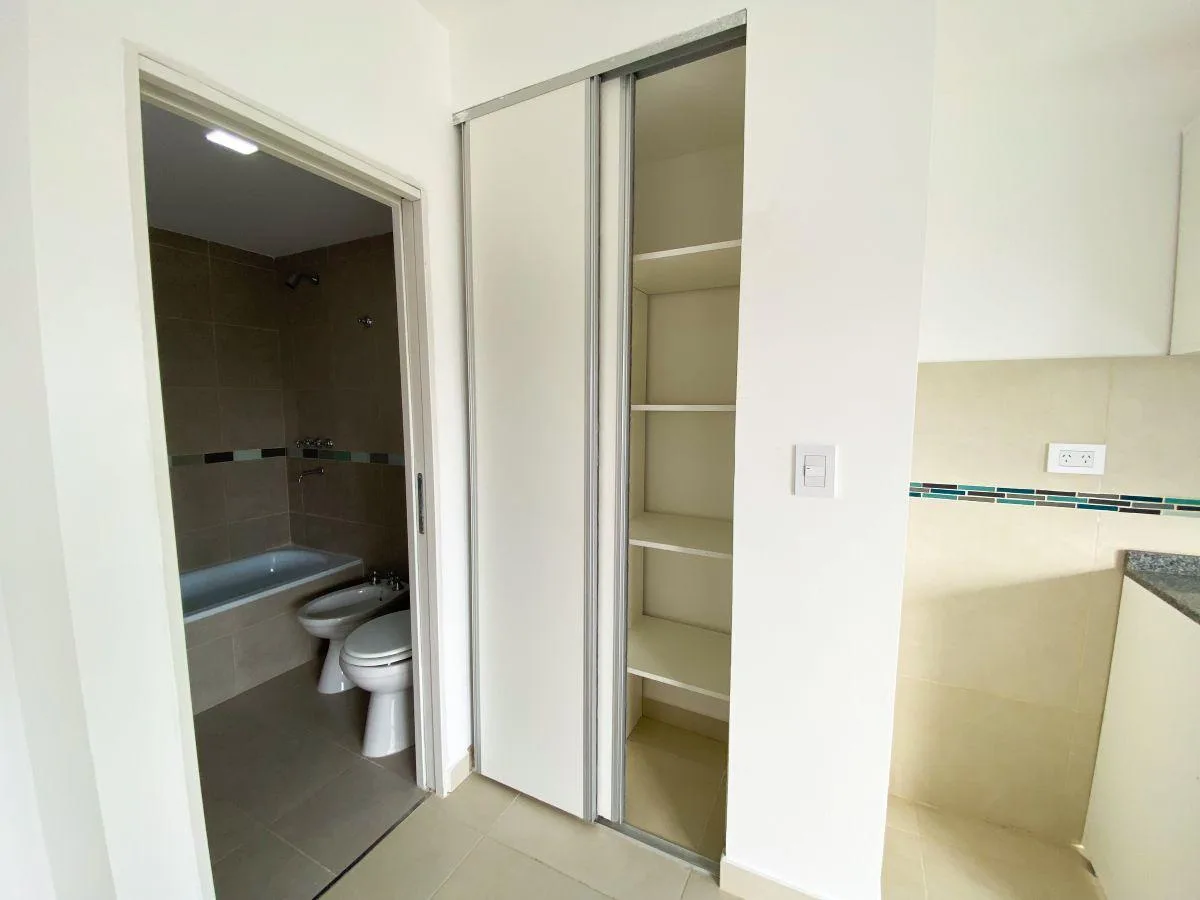 Kitnet de estúdio com varanda de frente, em Lanús Centro. A unidade tem piso cerâmico, armário embutido com interiores, aquecedor a gás tiro balanceado, conexão para ar-condicionado e janela com acesso à varanda. A cozinha fica com janela para a frente e inclui pia dupla de aço, bancadas de granito, armários (bancada inferior e aéreo) e conexões para extrator e para lavadora. O banheiro completo tem banheira, bidê, vaso sanitário, espelho com luz LED e revestimento em cerâmica. O prédio tem hall