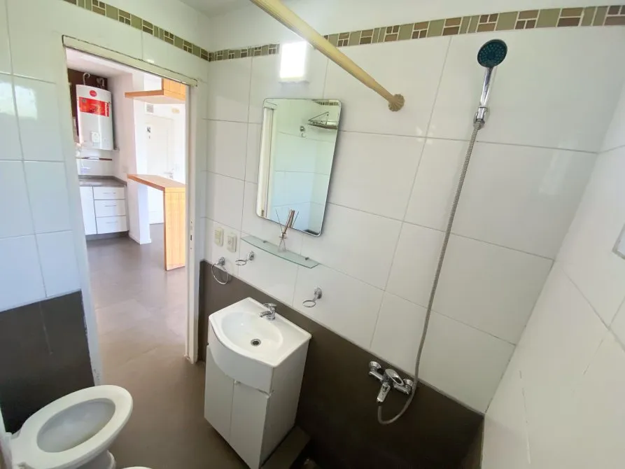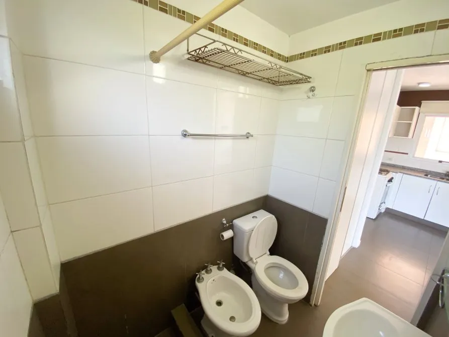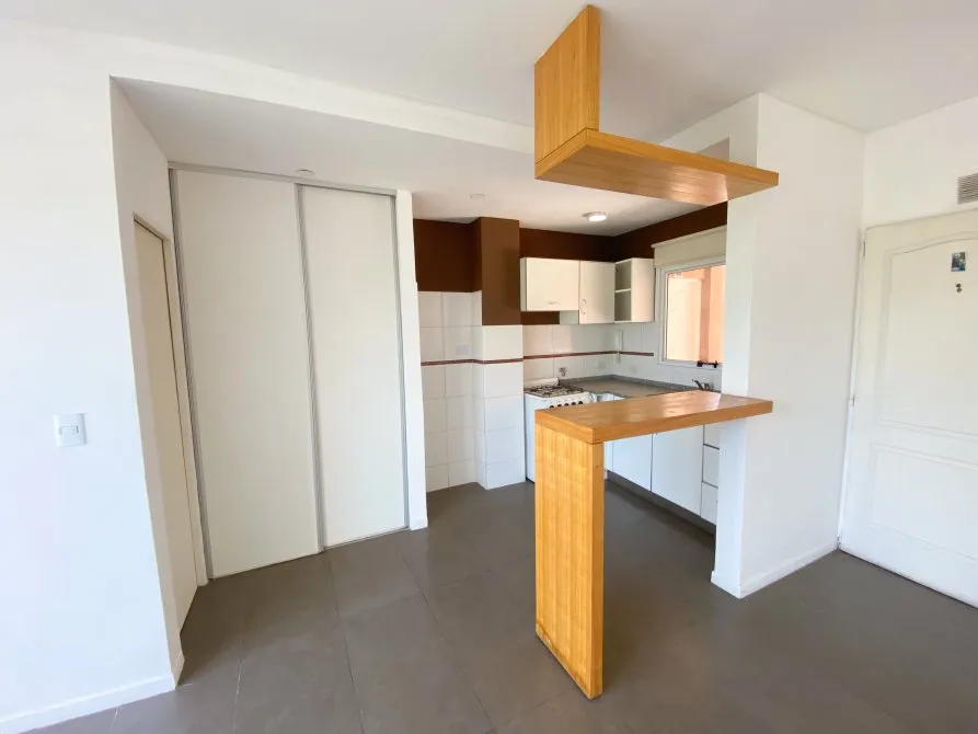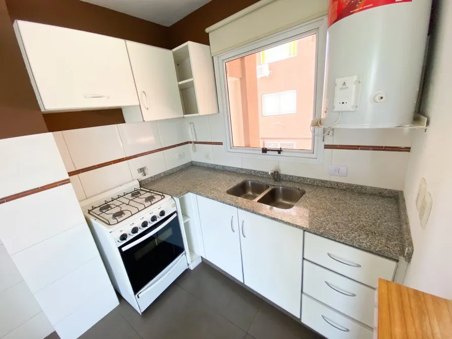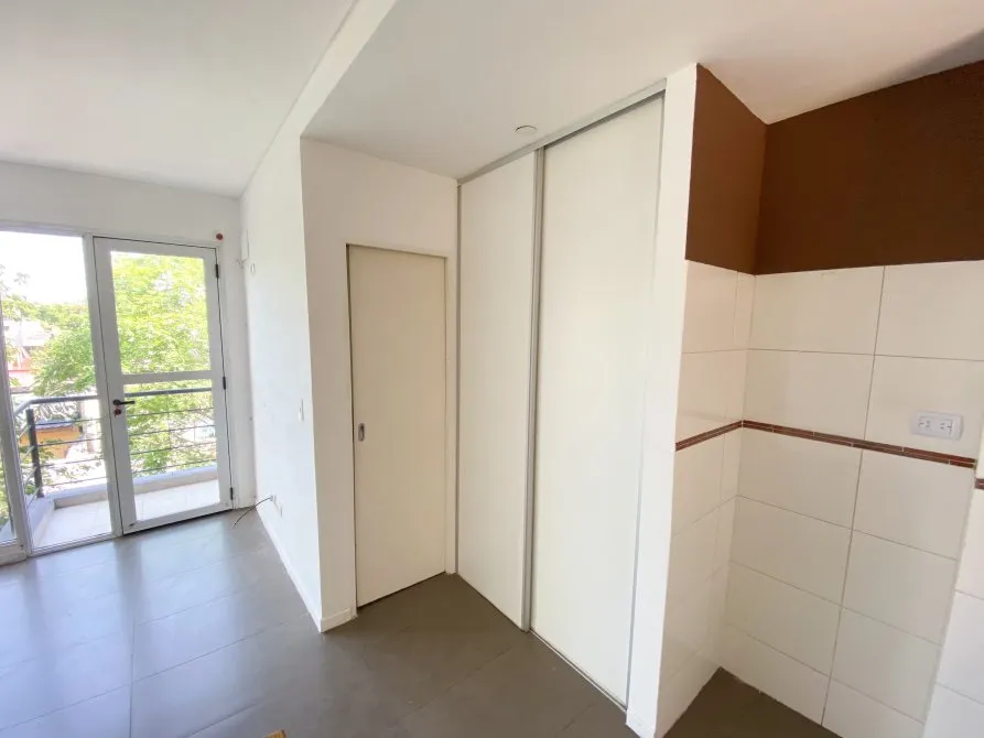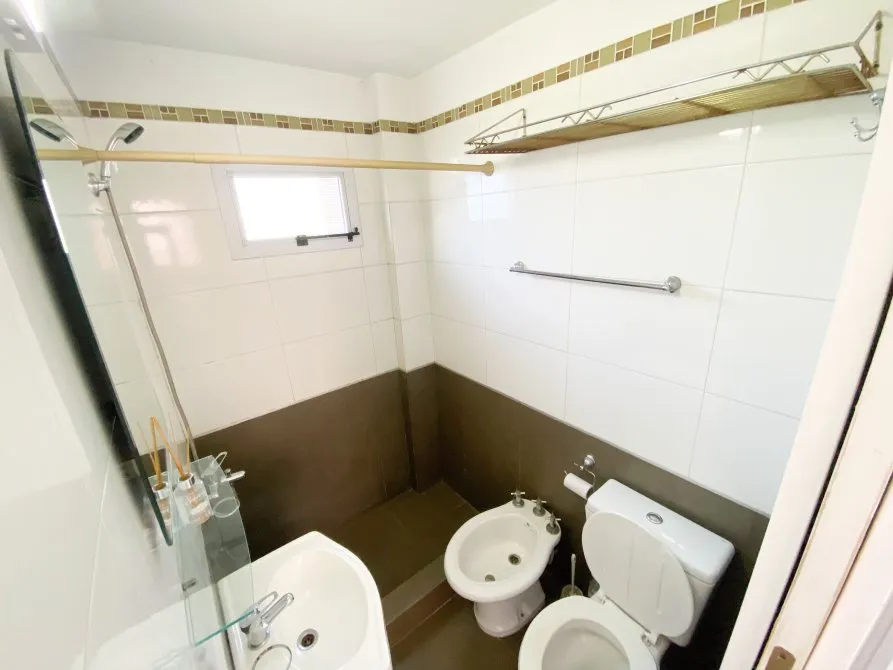 Kitnet (monoambiente) em Lanús Centro, 6º andar, orientação para o leste. Possui ambiente de 5,64 x 4,57 m com cozinha revestida em cerâmica, fogão, armário aéreo e base em melamina, bancada em granito, cuba dupla, aquecedor elétrico de 80 litros, janela com cortina roller black-out, barra para refeições e prateleira de madeira, além de armário embutido. O banheiro tem vaso sanitário, bidê, gabinete (vanitory), espelho e chuveiro com ducha e acessório organizador. Há envidraçamento amplo com por