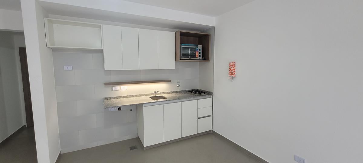 Apartamento tipo kitnet de 1 ambiente com varanda. Cozinha com espaço para geladeira e máquina de lavar, água quente central, banheiro completo com banheira. Fogão a gás de 2 bocas, forno elétrico e ar-condicionado com função frio/calor. Dois elevadores e espaço para guardar bicicletas. Terraço de uso comum com solário e área de churrasco. No aluguel, são exigidas fiança de 2 meses ou USD 500 de depósito e seguro de caução Finaer ou Respaldar; o contrato é de 24 meses com reajuste trimestral pel