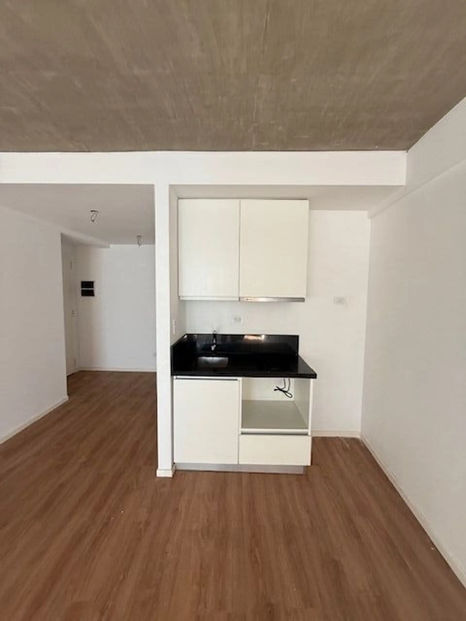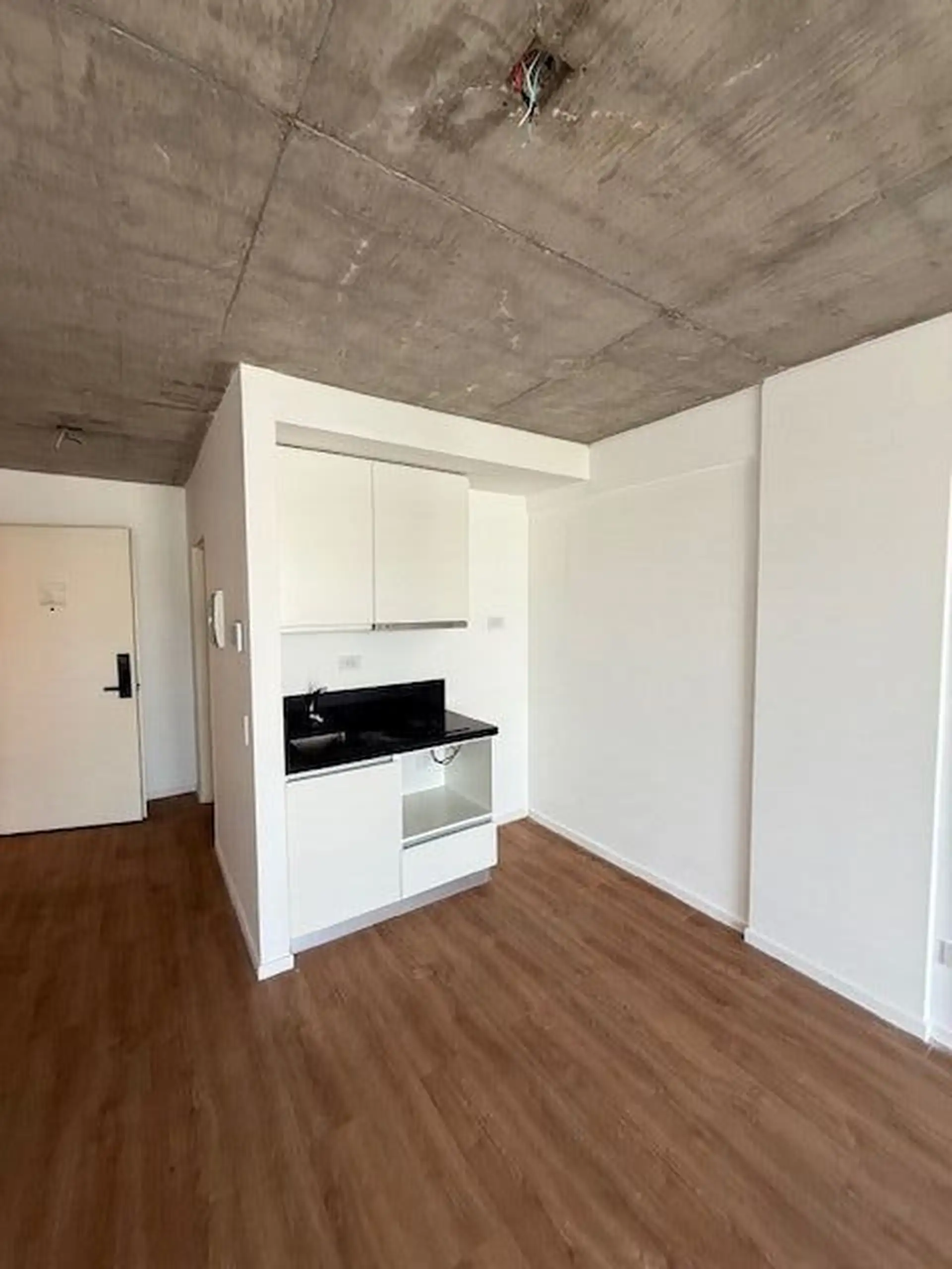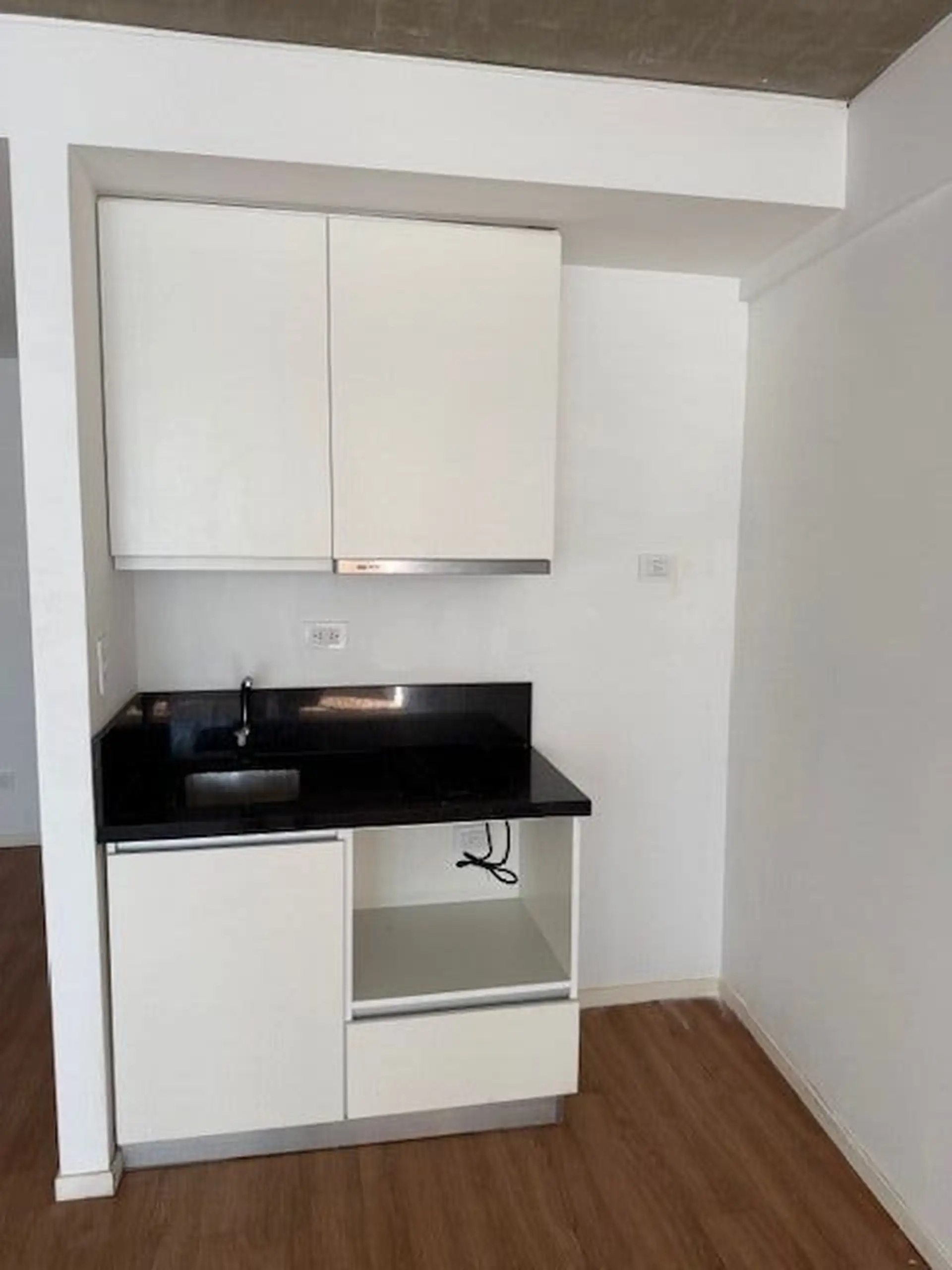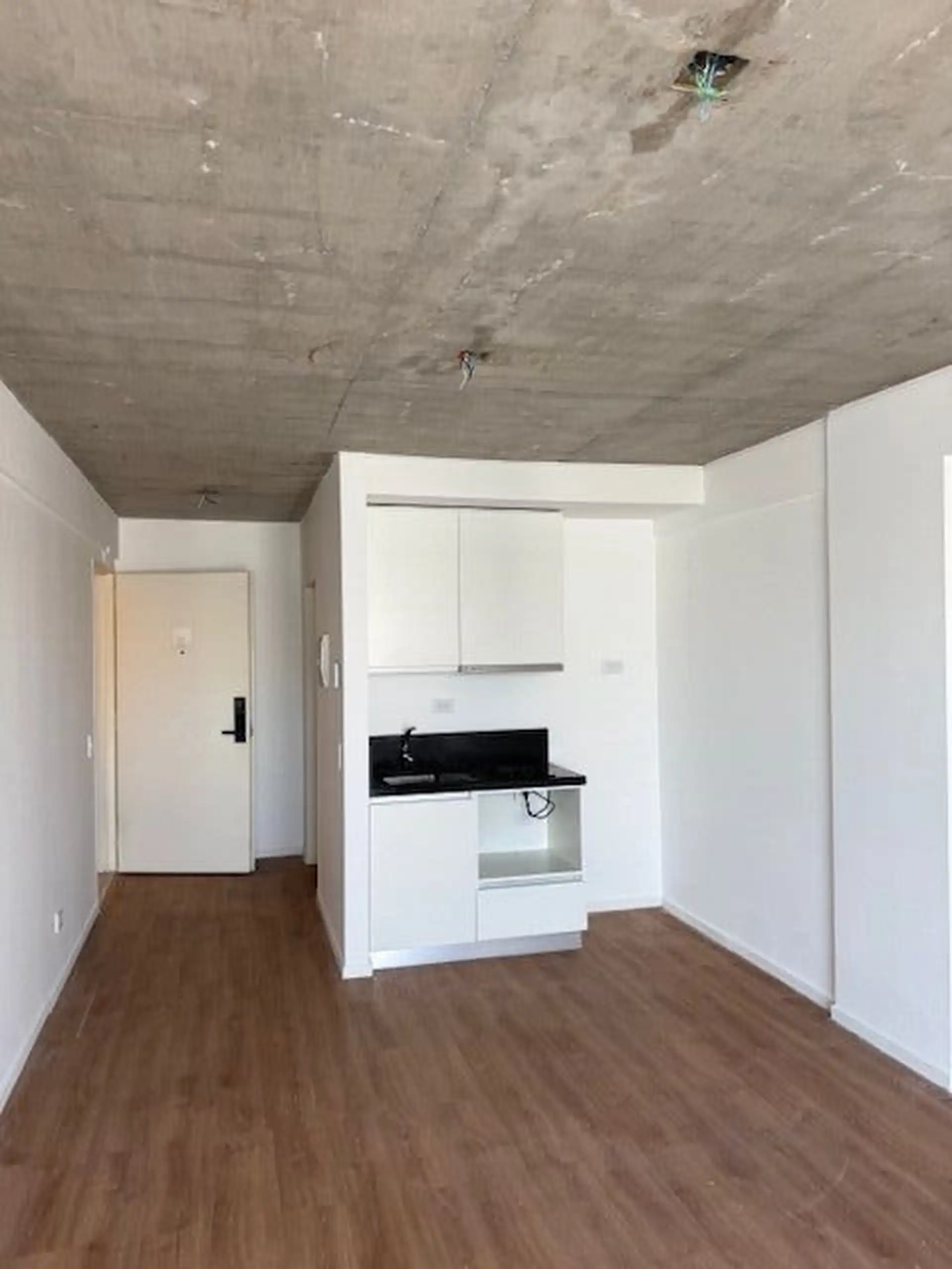 Kitnet de 1 ambiente com varanda de fundos (contrafrente), cozinha integrada e banheiro completo. A unidade tem ar-condicionado e está em bom estado de conservação. O edifício conta com lavanderia (laundry).