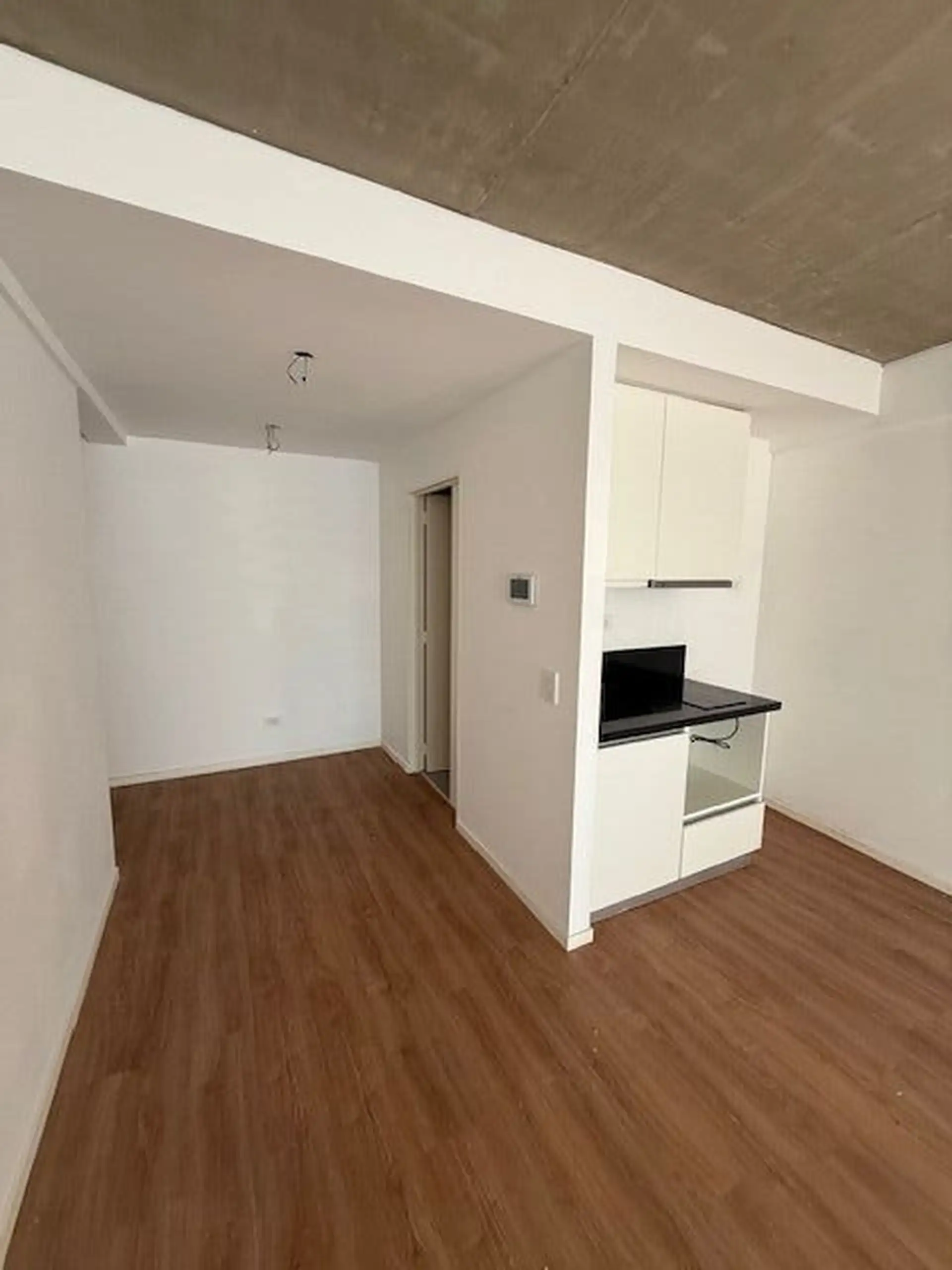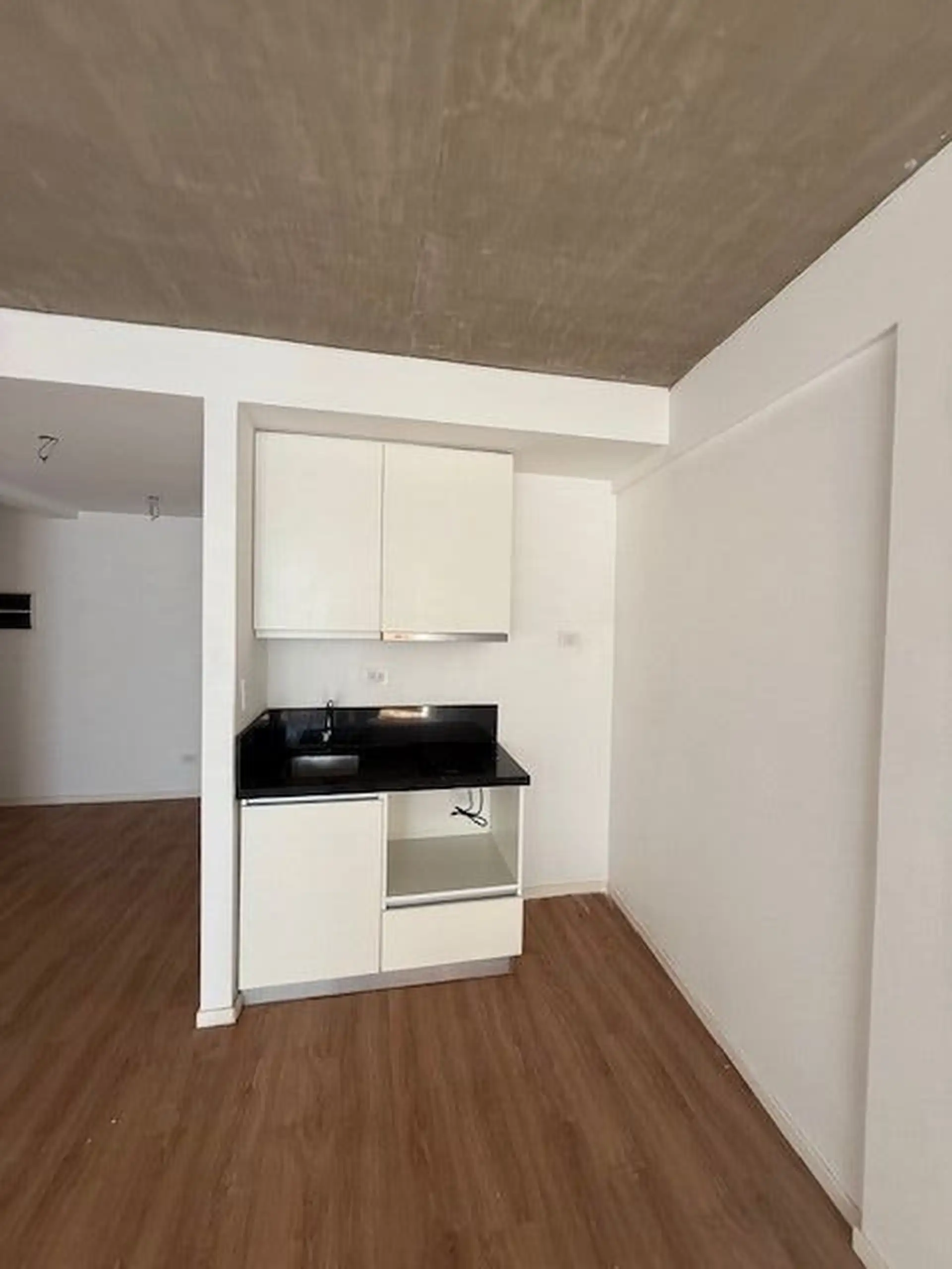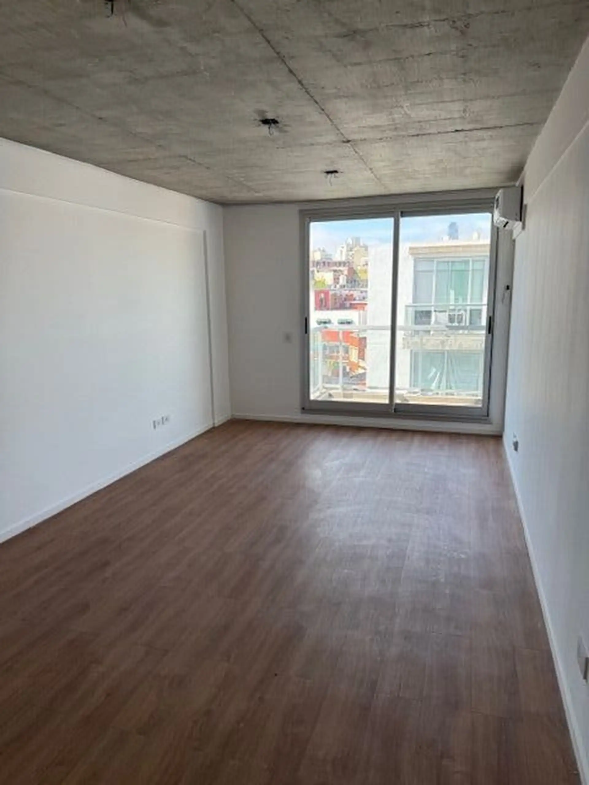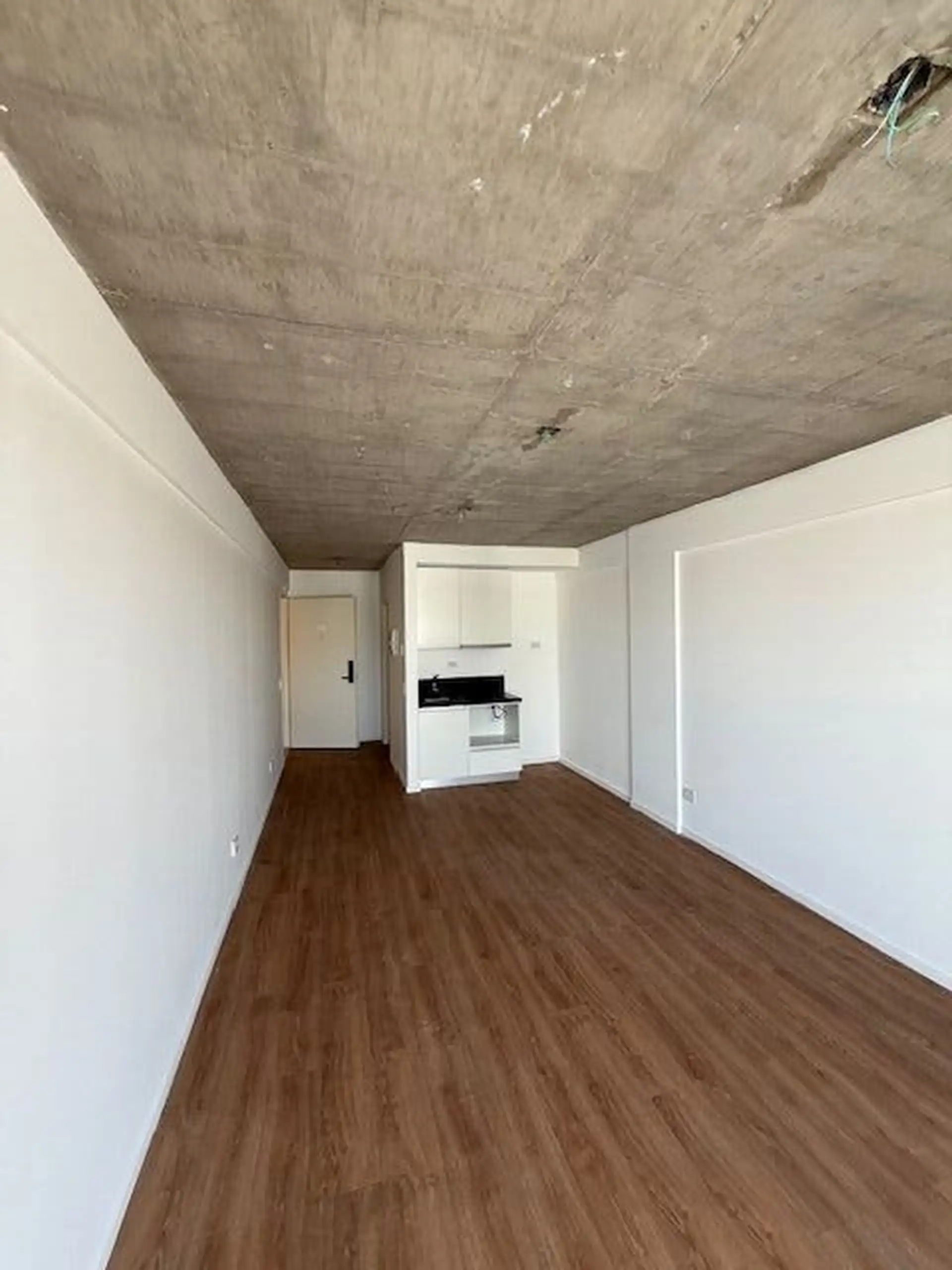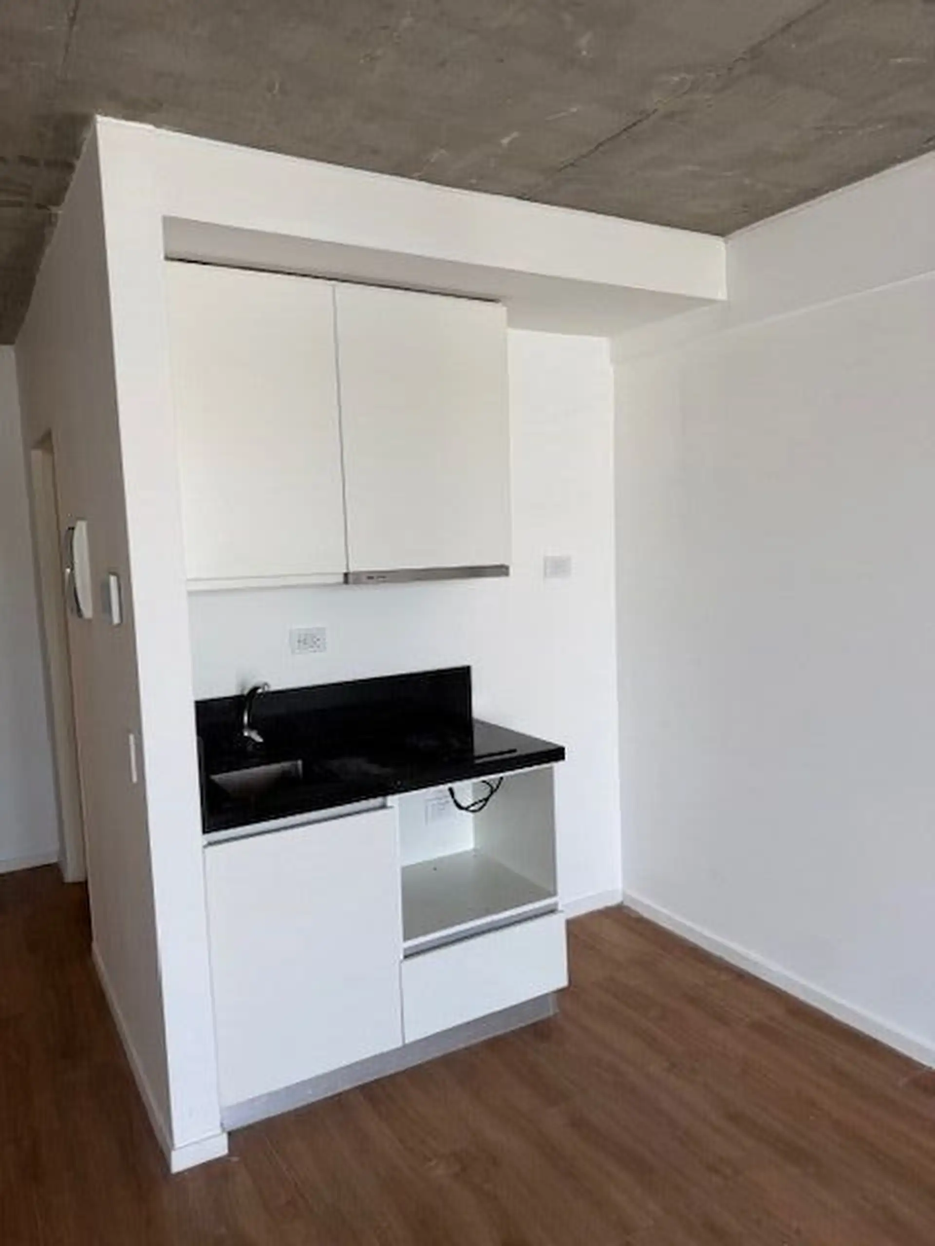 Kitnet de 1 ambiente com varanda de fundos (contrafrente), cozinha integrada e banheiro completo. A unidade tem ar-condicionado e está em bom estado de conservação. O edifício conta com lavanderia (laundry).