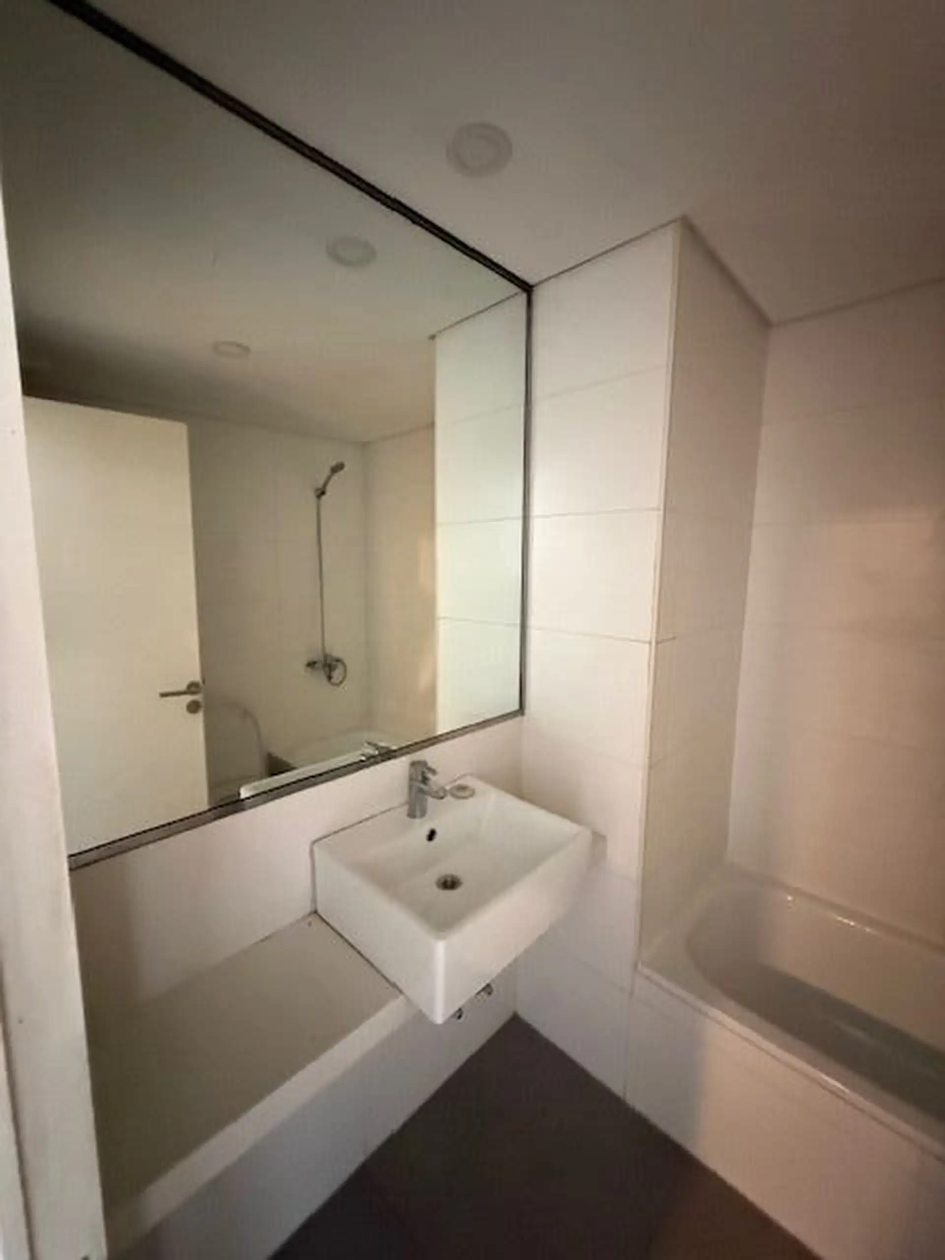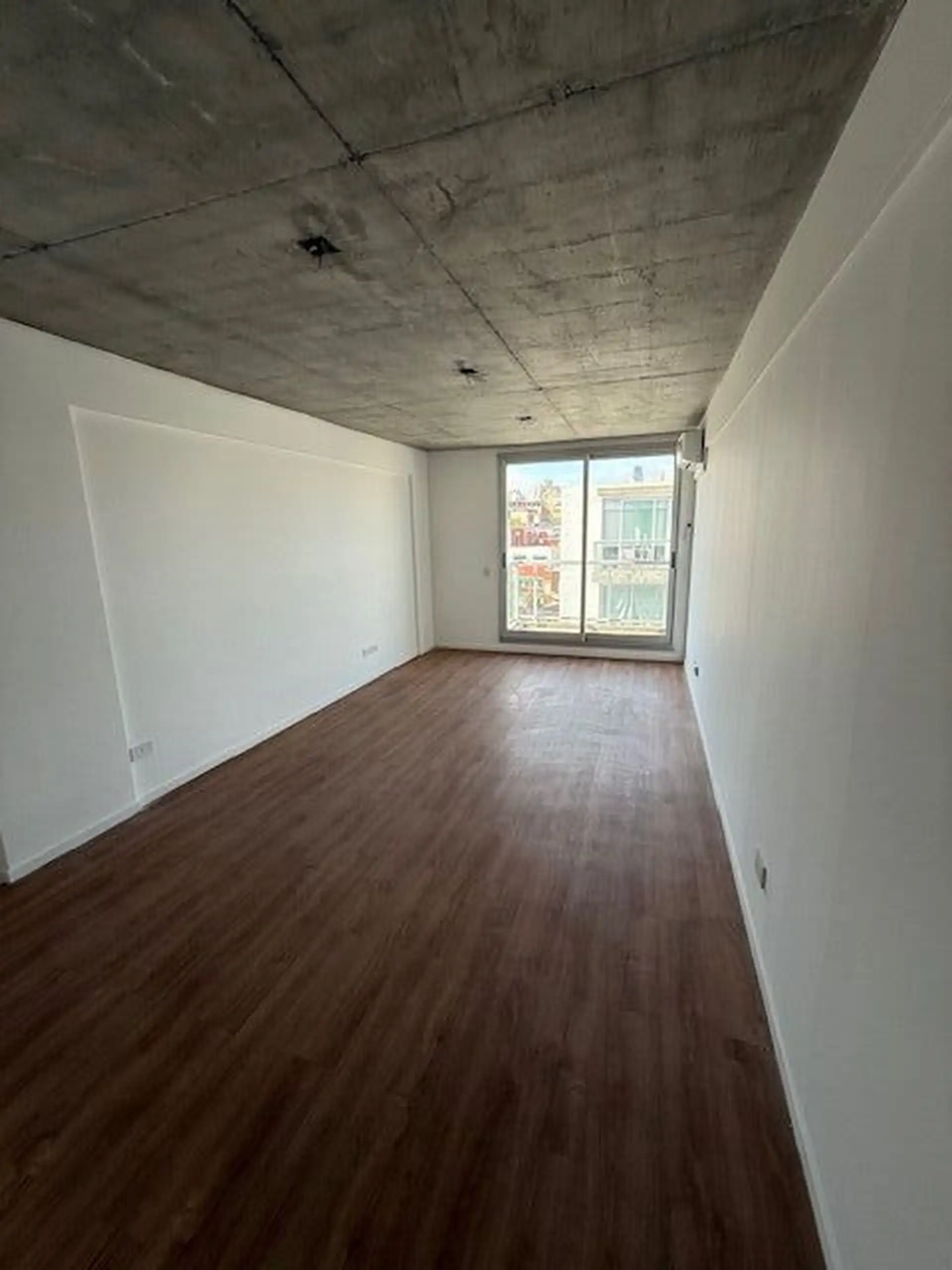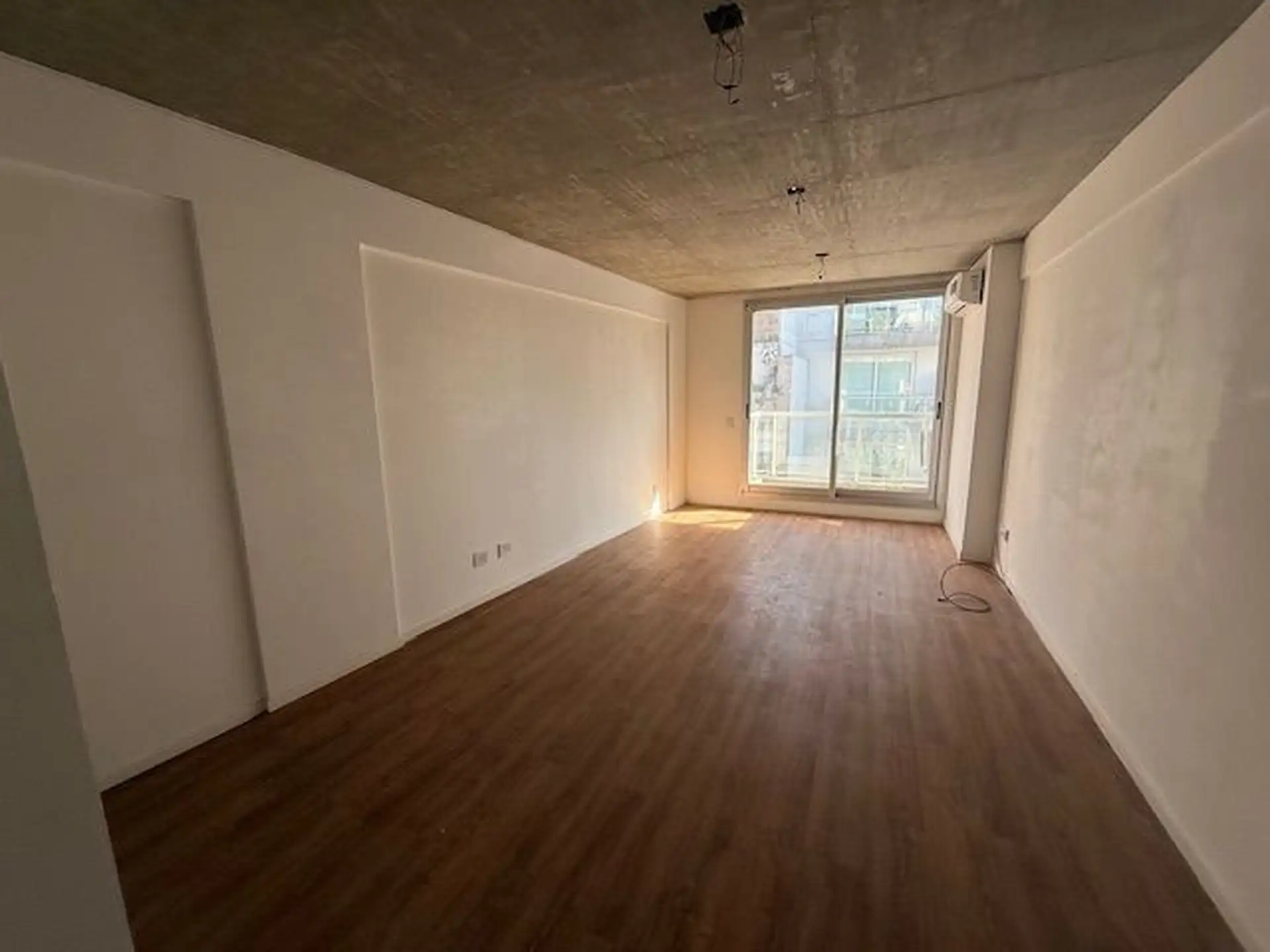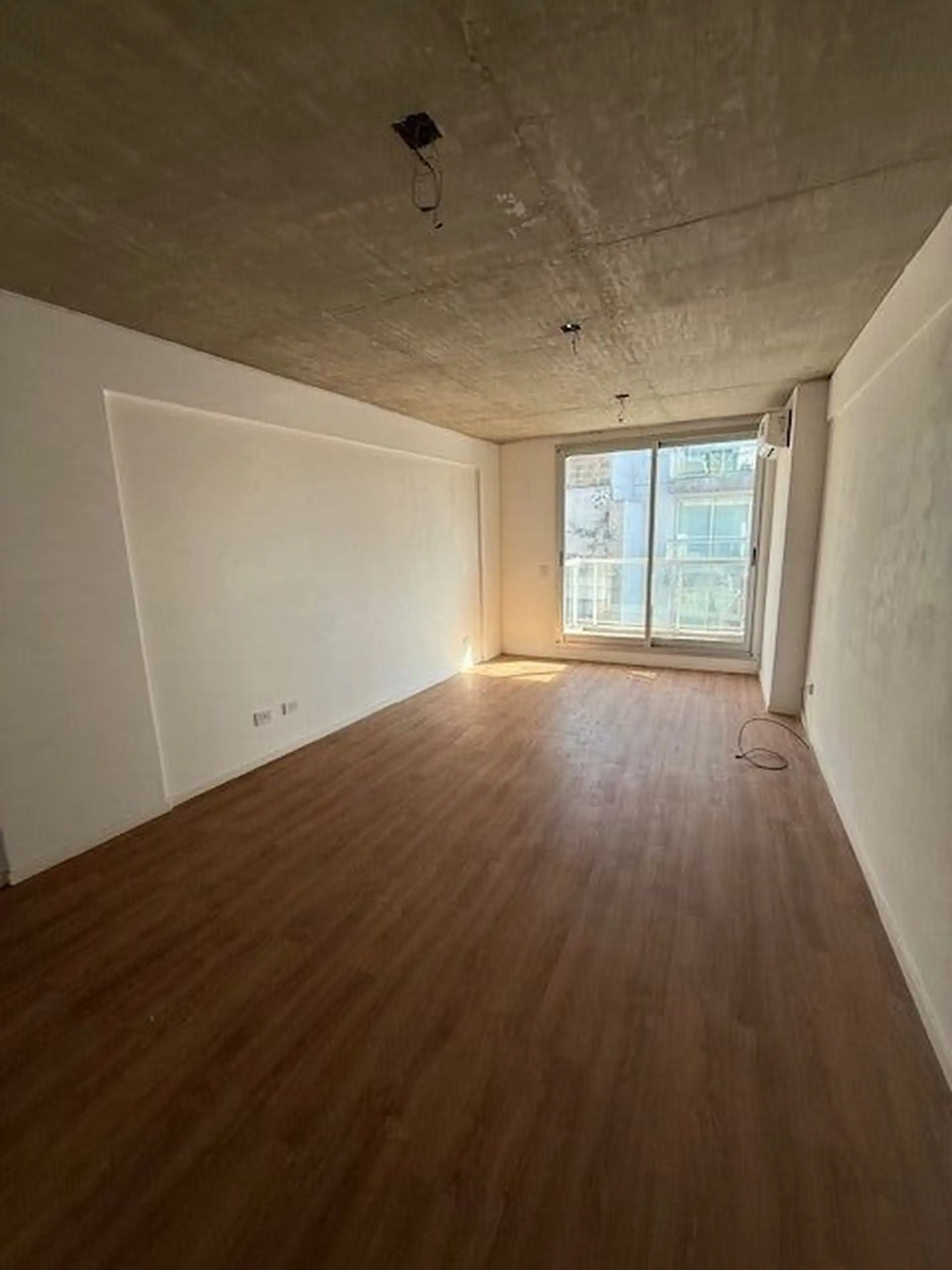 Kitnet de 1 ambiente com varanda de fundos (contrafrente), cozinha integrada e banheiro completo. A unidade tem ar-condicionado e está em bom estado de conservação. O edifício conta com lavanderia (laundry).