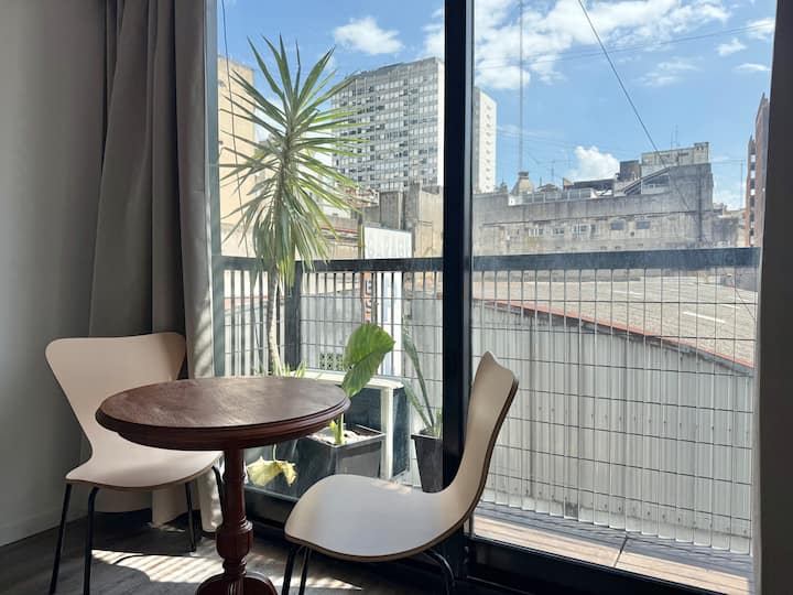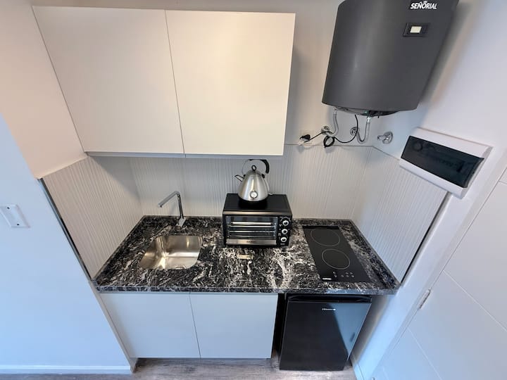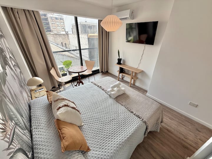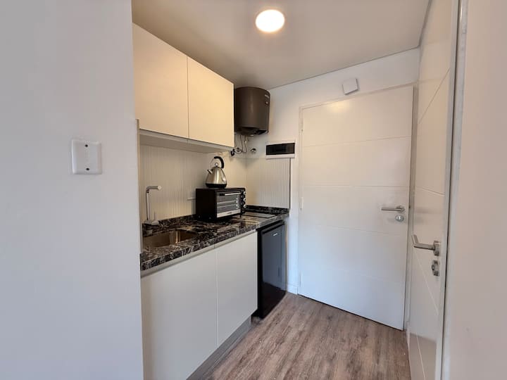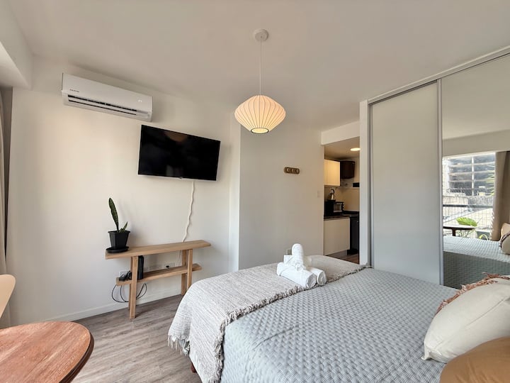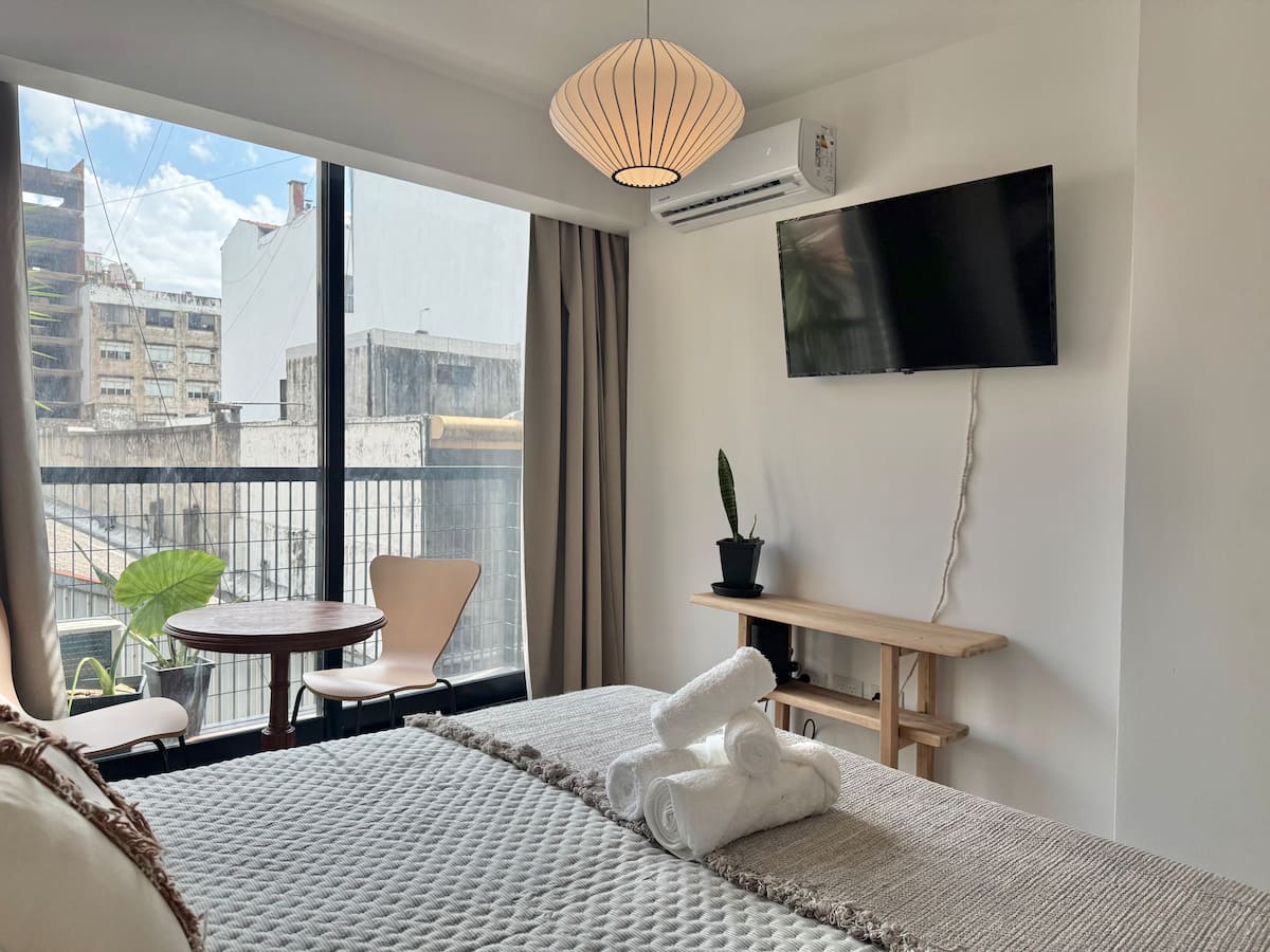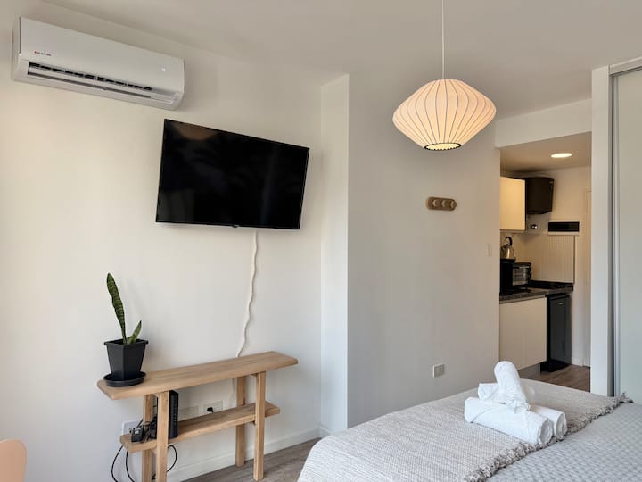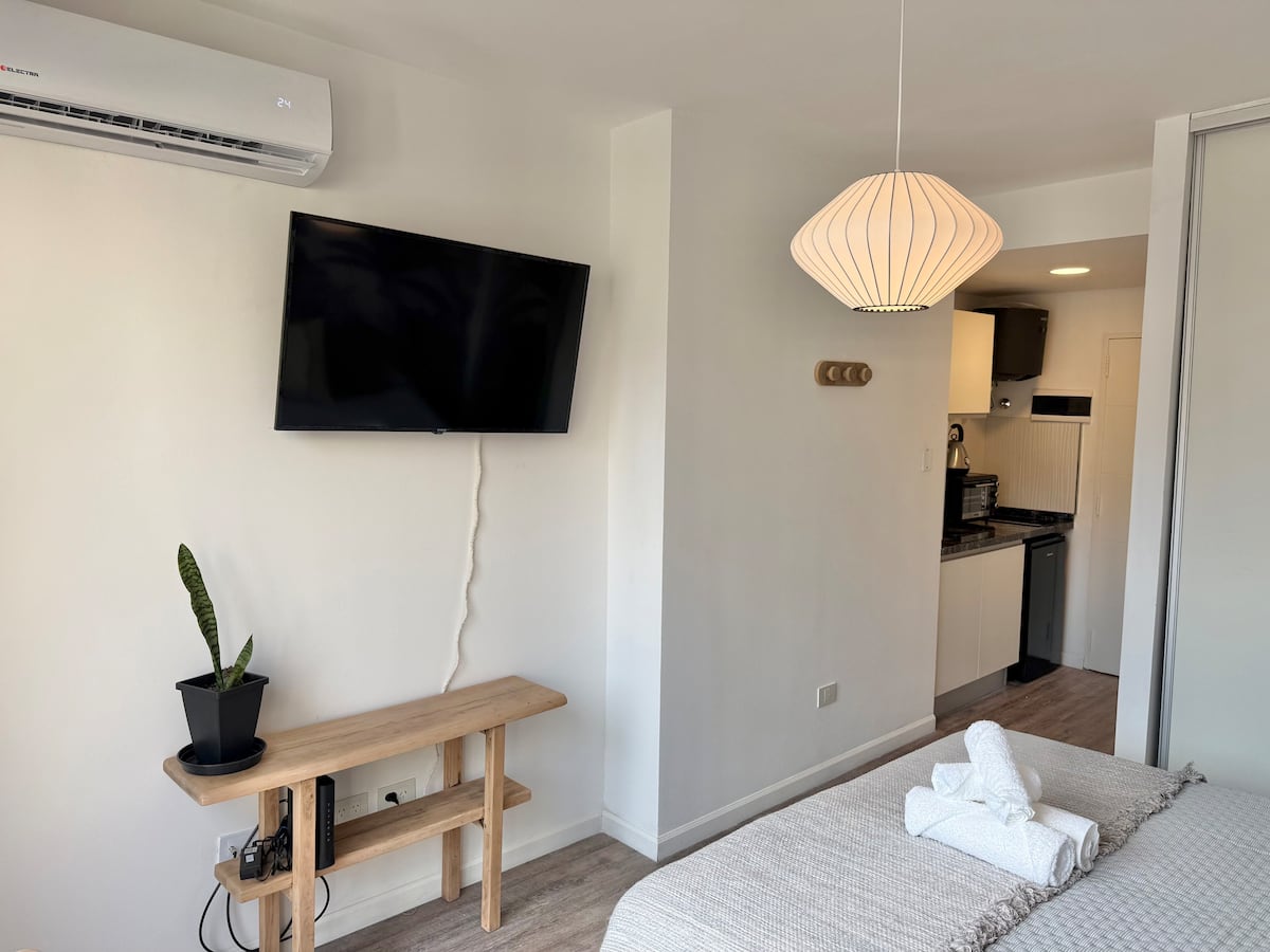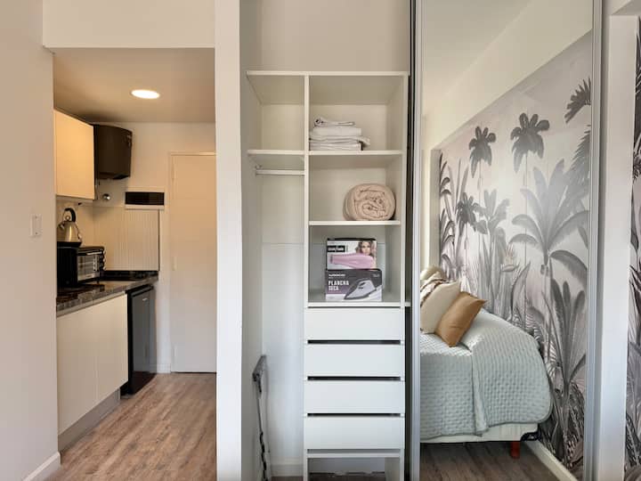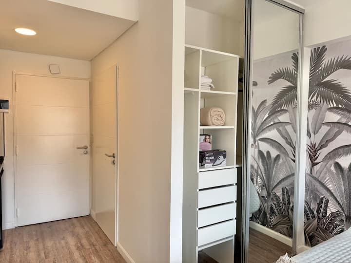 Studio novo, mobiliado e equipado, com ar-condicionado, cama de casal, Smart TV e cozinha integrada com fogão elétrico e utensílios. O apartamento tem cozinha e balcão voltados para a frente, com iluminação natural e vista urbana. O acesso é com check-in autônomo; a chave fica em um lockbox na porta do apartamento e as instruções são enviadas pela plataforma. Em caso de perda de chaves ou se ficarem dentro do apartamento, há cobrança adicional de USD 50 por assistência fora do horário.