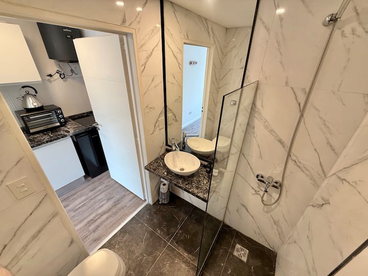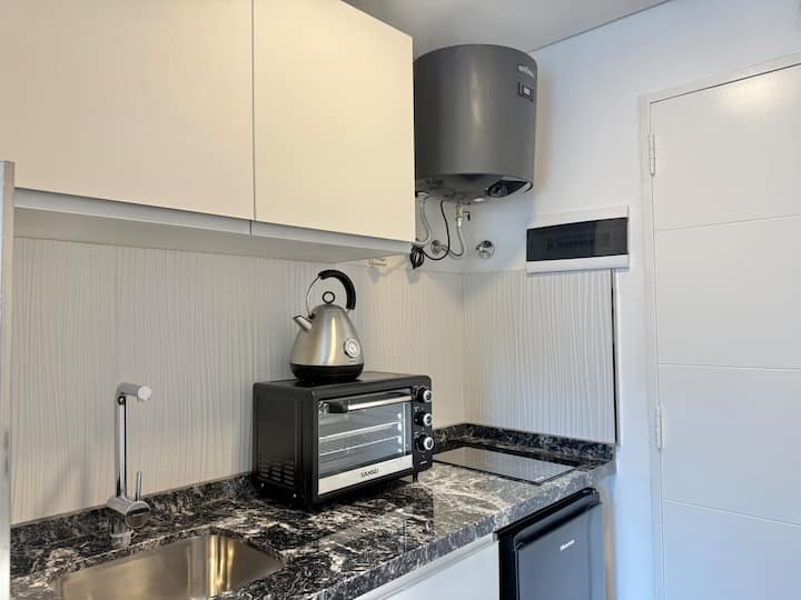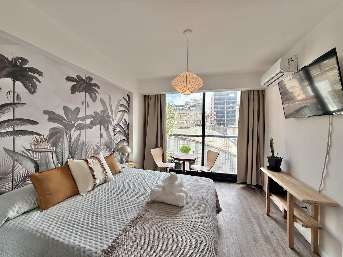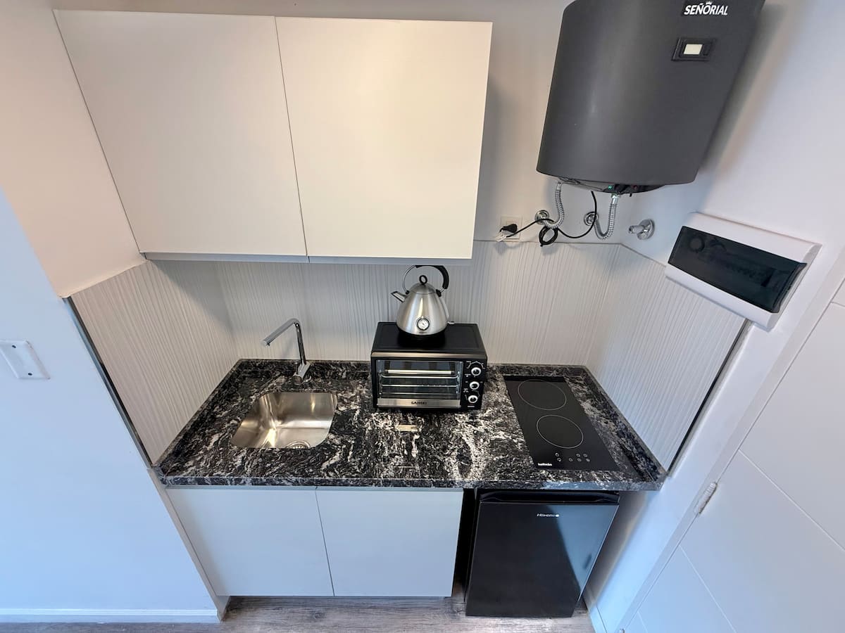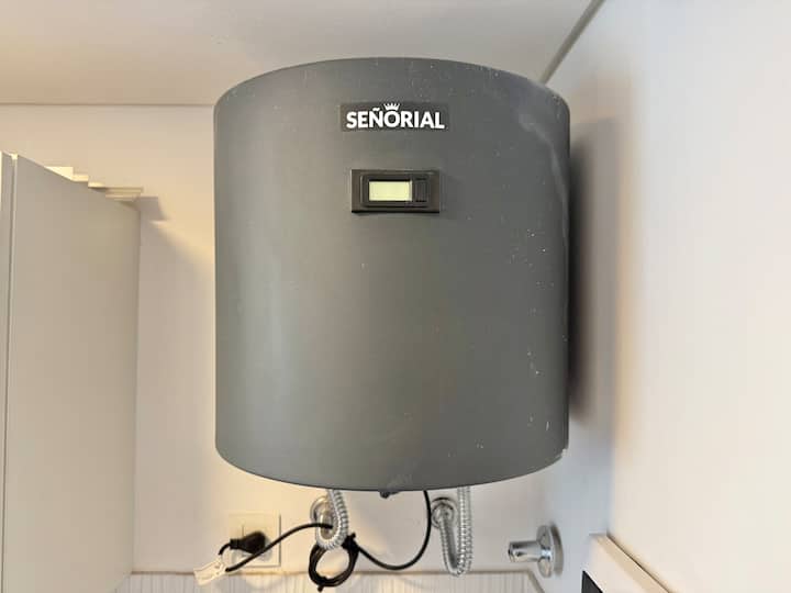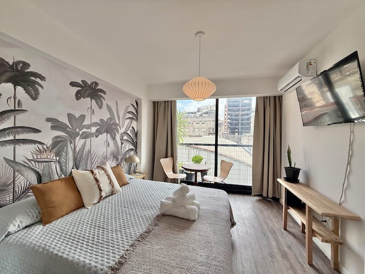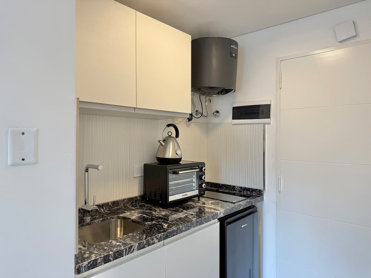 Studio novo, mobiliado e equipado, com ar-condicionado, cama de casal, Smart TV e cozinha integrada com fogão elétrico e utensílios. O apartamento tem cozinha e balcão voltados para a frente, com iluminação natural e vista urbana. O acesso é com check-in autônomo; a chave fica em um lockbox na porta do apartamento e as instruções são enviadas pela plataforma. Em caso de perda de chaves ou se ficarem dentro do apartamento, há cobrança adicional de USD 50 por assistência fora do horário.
