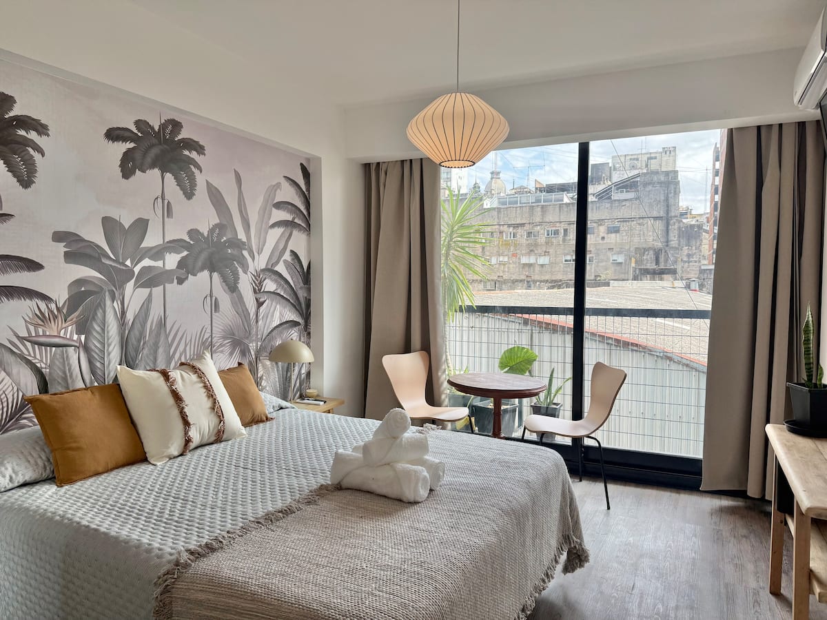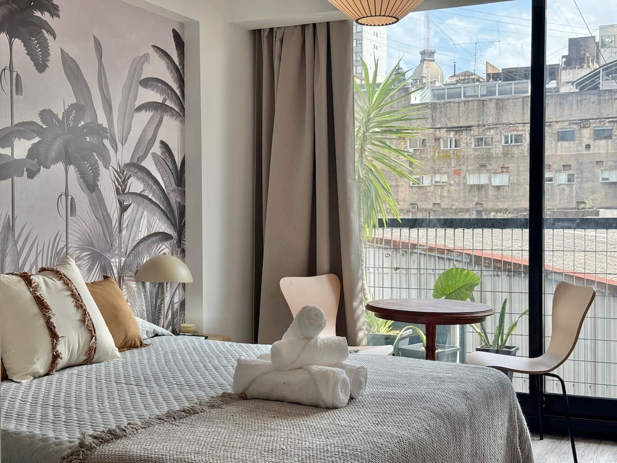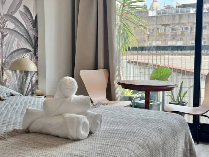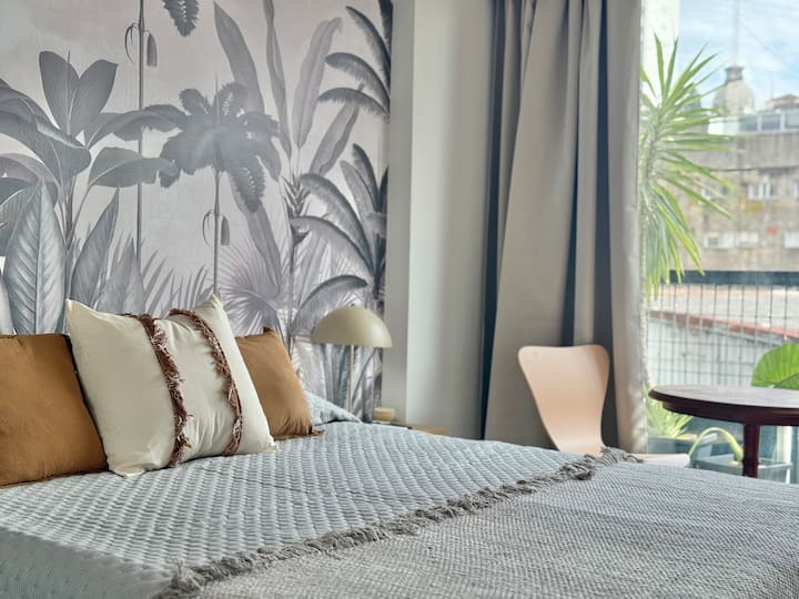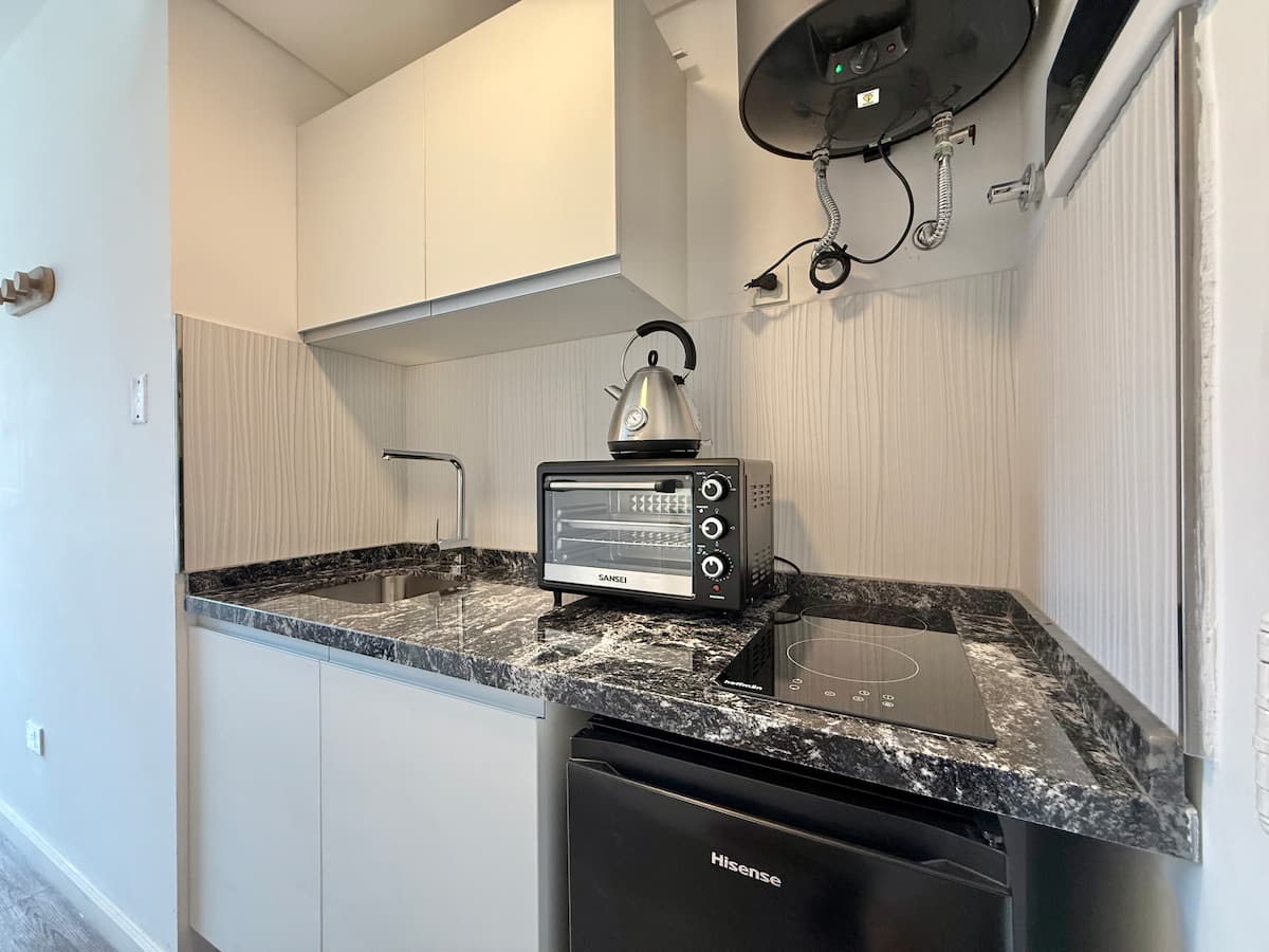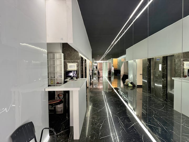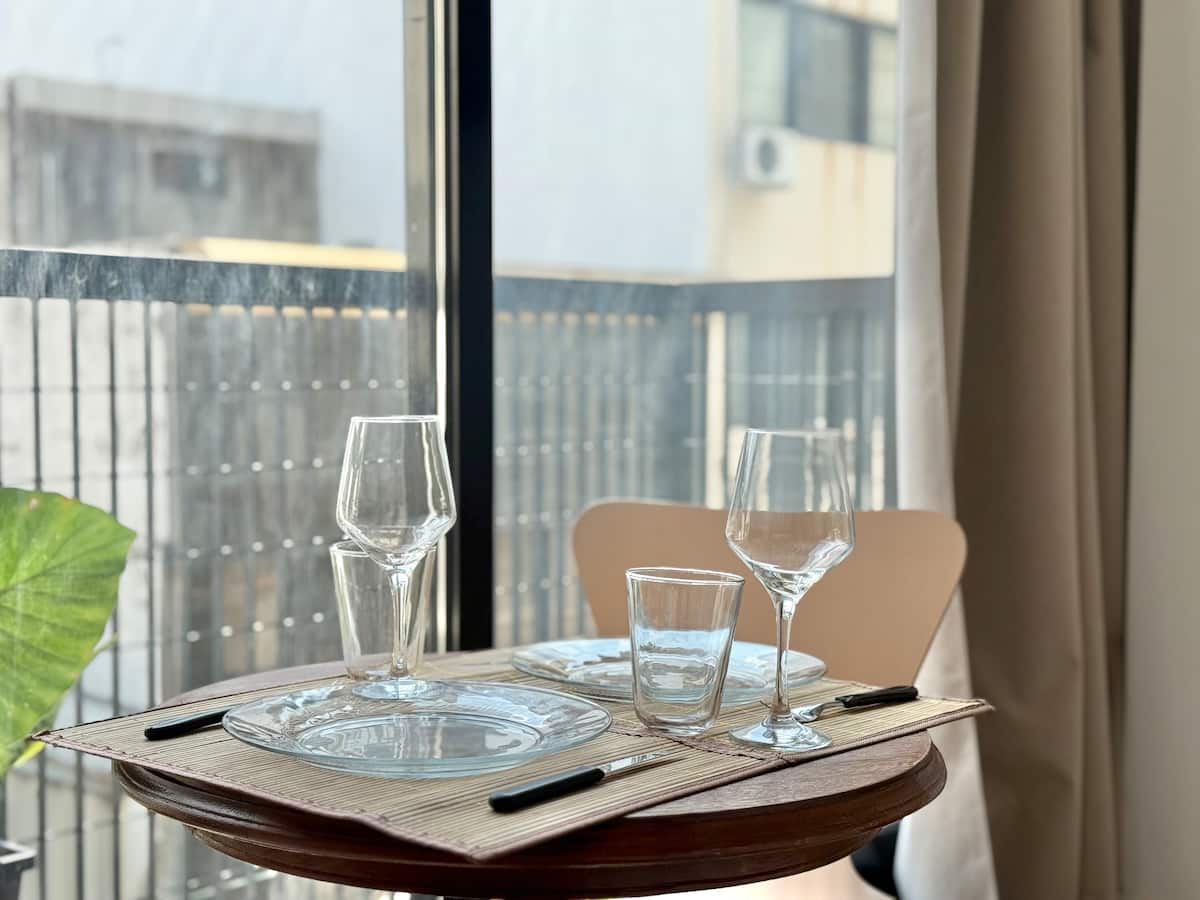 Studio novo, mobiliado e equipado, com ar-condicionado, cama de casal, Smart TV e cozinha integrada com fogão elétrico e utensílios. O apartamento tem cozinha e balcão voltados para a frente, com iluminação natural e vista urbana. O acesso é com check-in autônomo; a chave fica em um lockbox na porta do apartamento e as instruções são enviadas pela plataforma. Em caso de perda de chaves ou se ficarem dentro do apartamento, há cobrança adicional de USD 50 por assistência fora do horário.