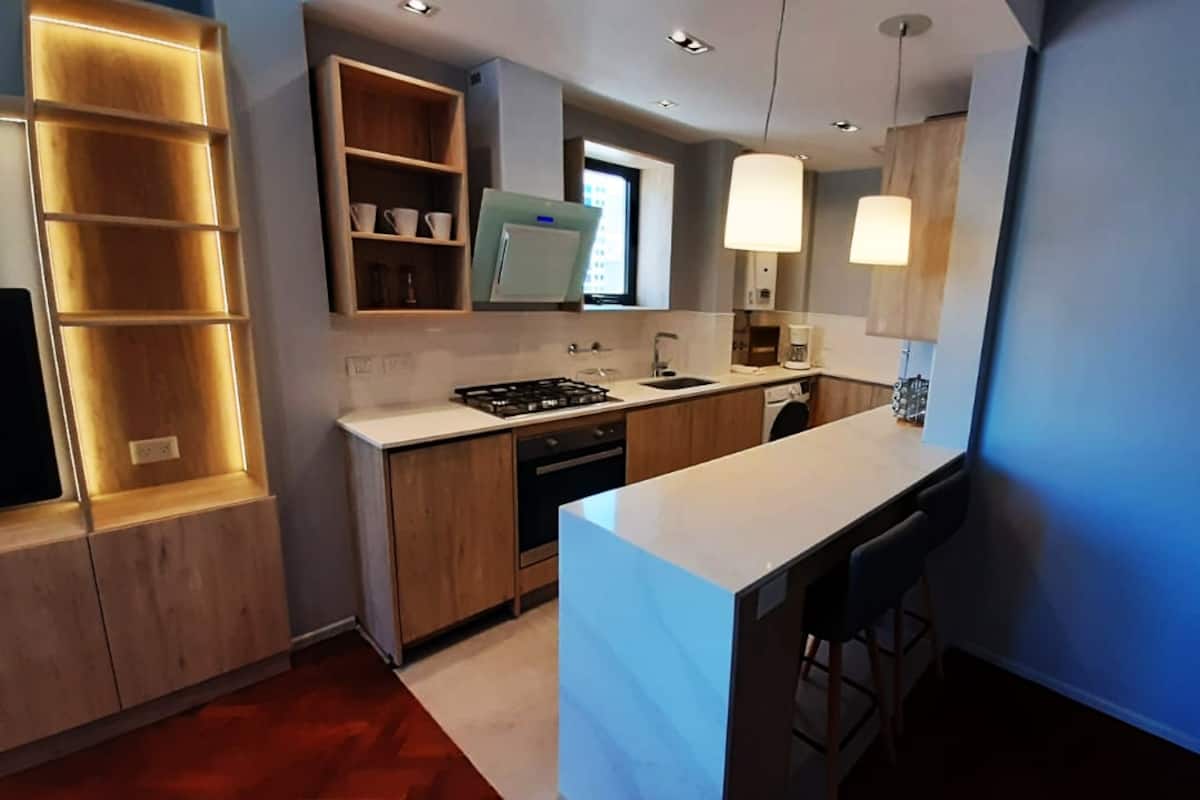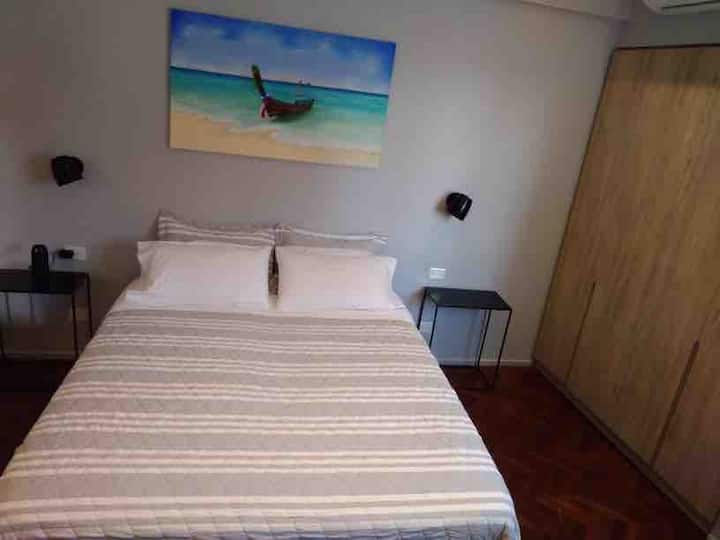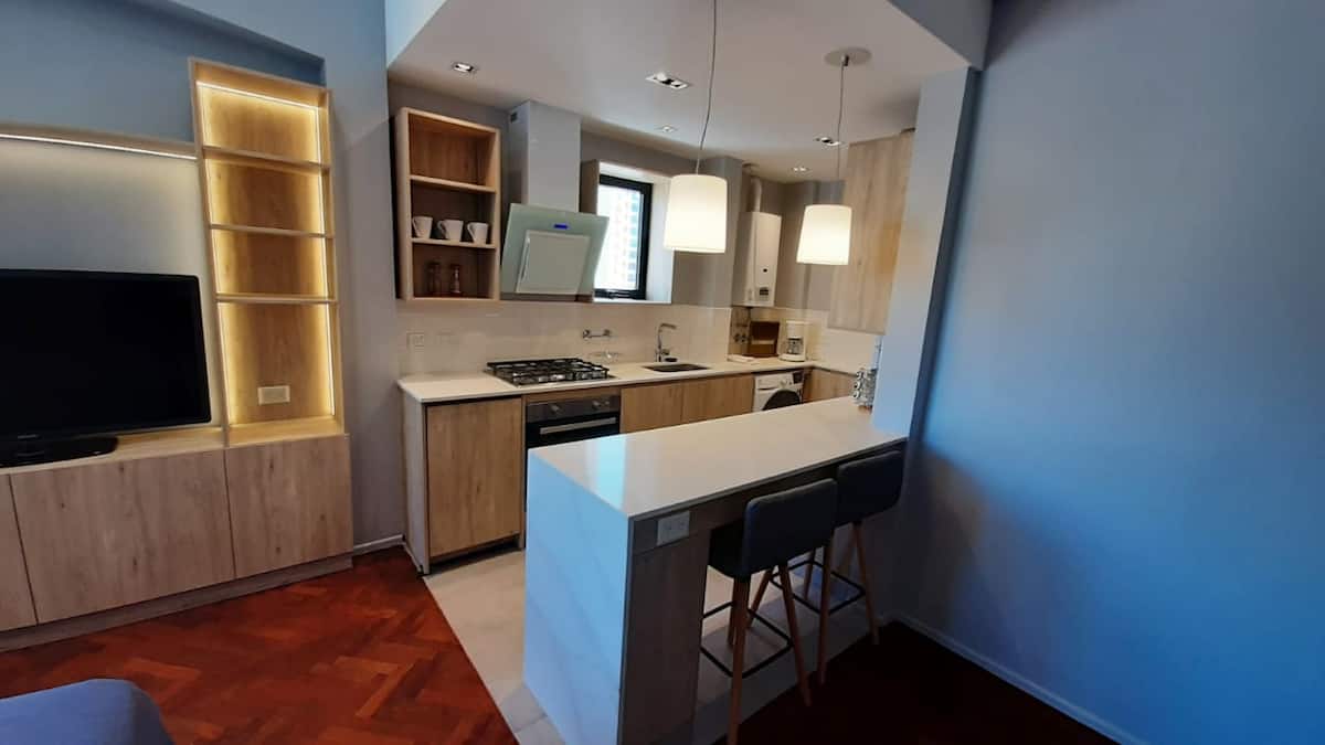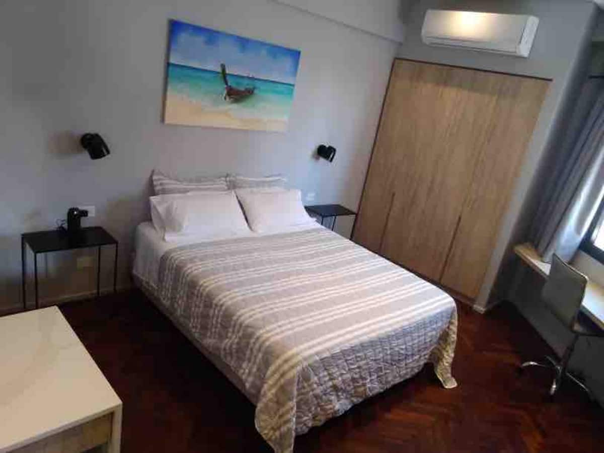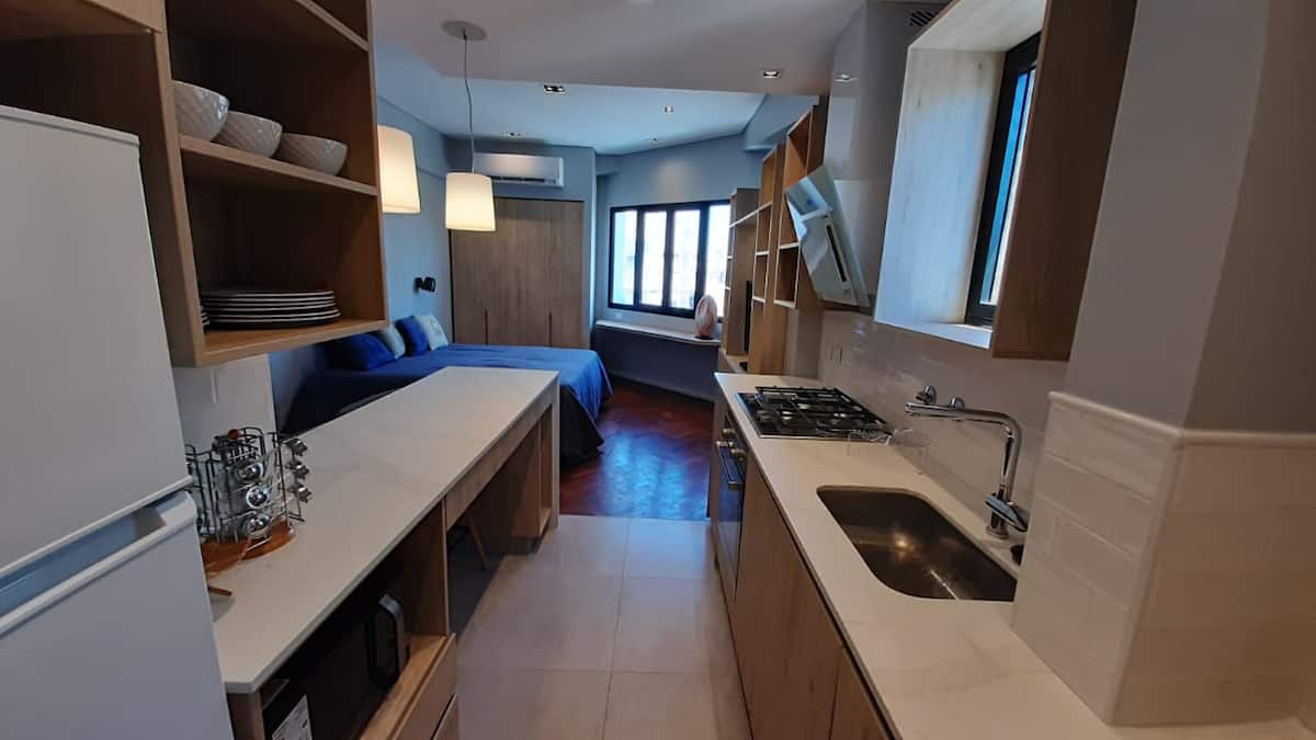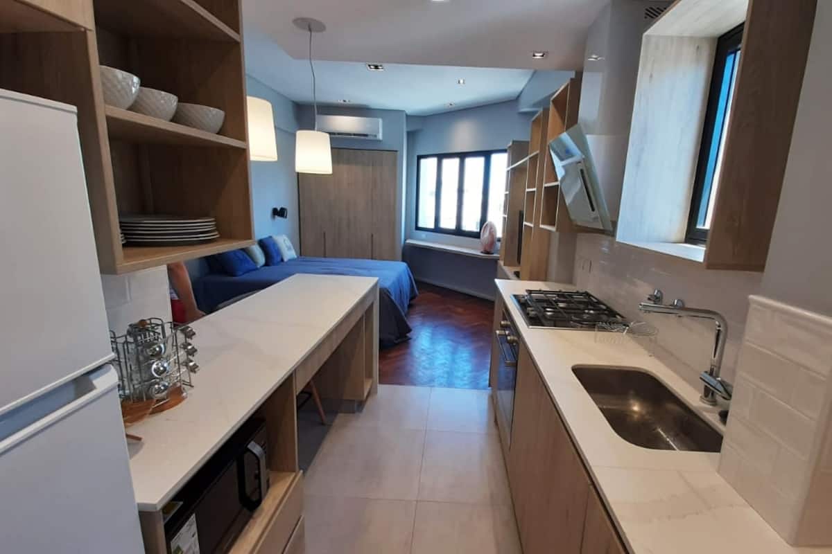 Kitnet em San Telmo, com cama queen ou duas camas de solteiro, com cofre. Possui banheiro completo com box de chuveiro, aquecimento e ar-condicionado. O espaço inclui área de trabalho e está equipado com máquina de lavar e secar, fogão e forno separado, micro-ondas, torradeira, panelas e geladeira, além de ferro e tábua de passar roupa.