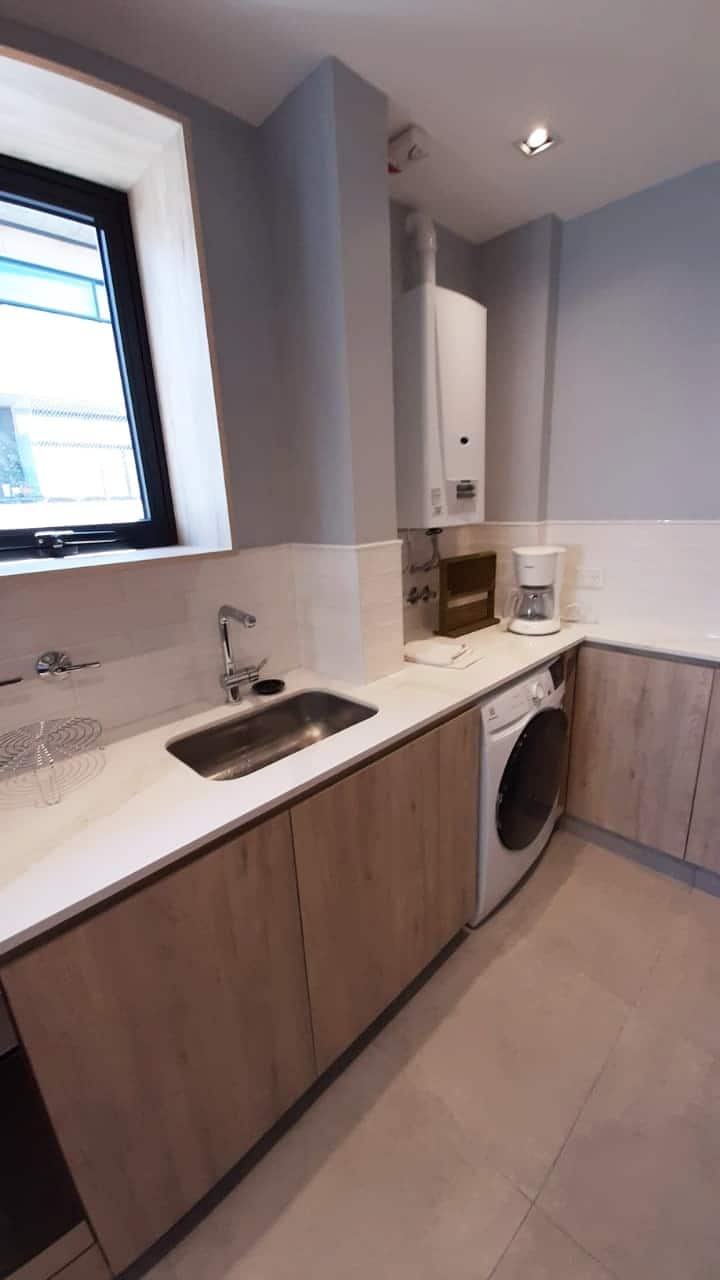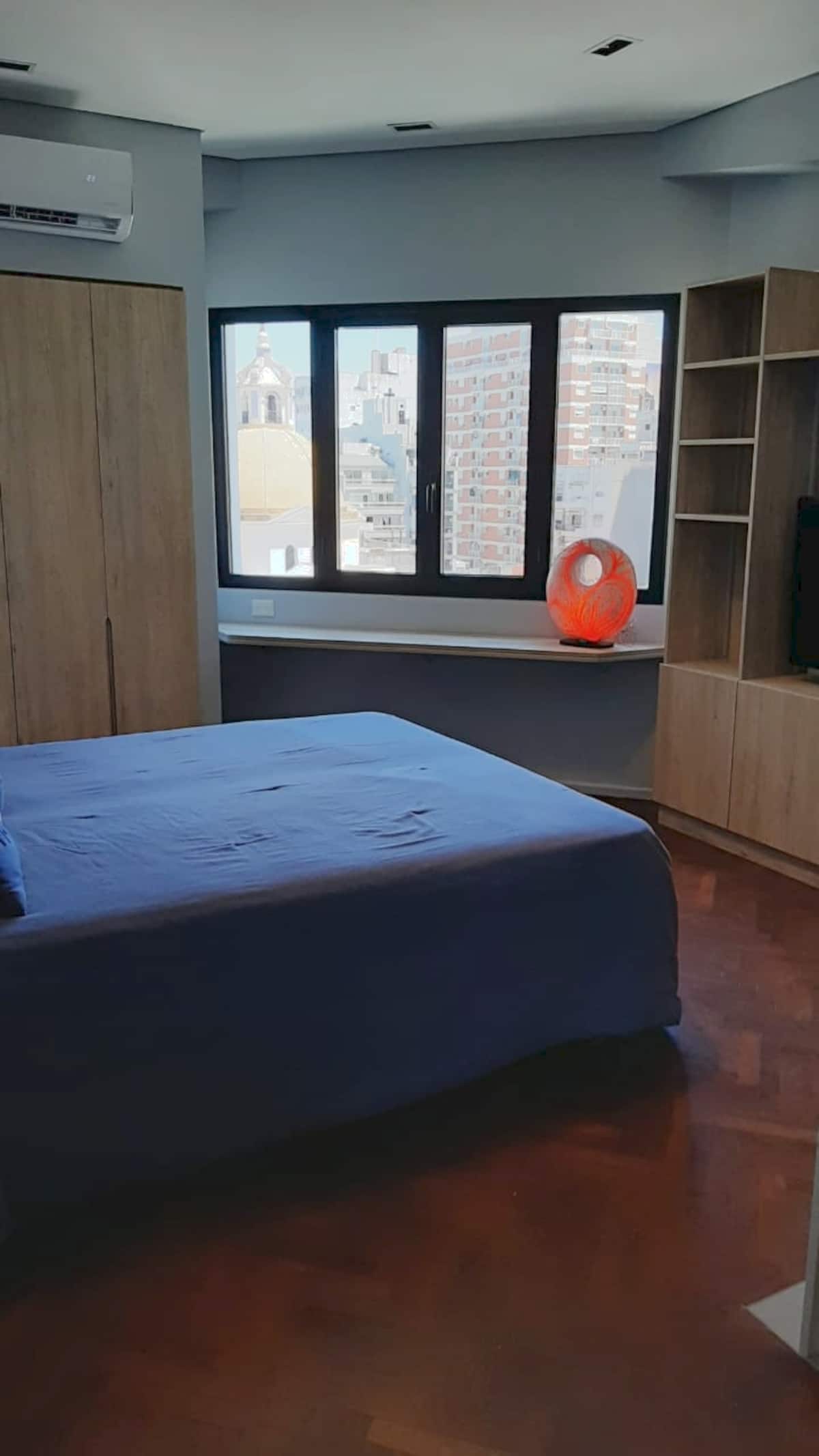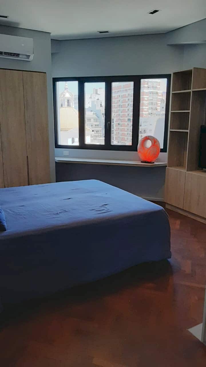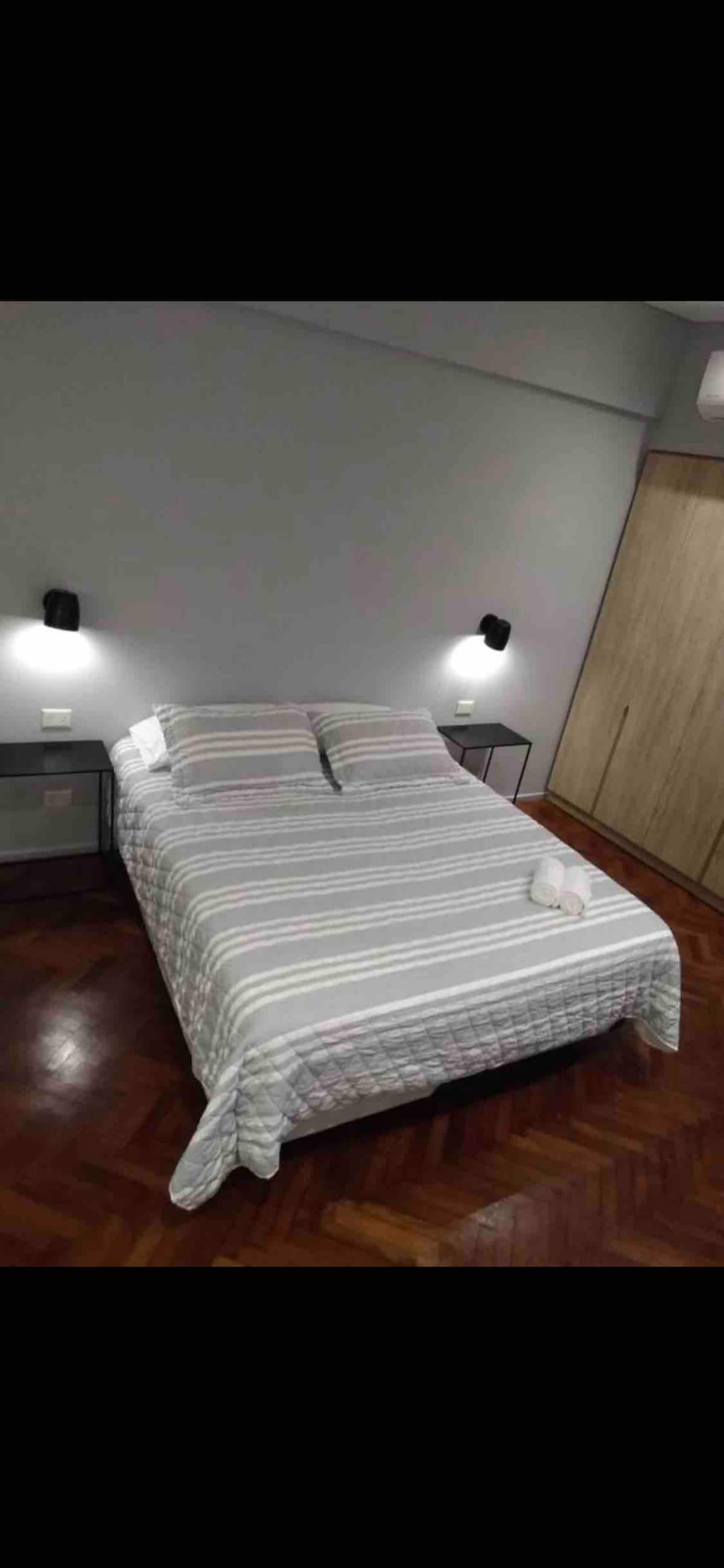 Kitnet em San Telmo, com cama queen ou duas camas de solteiro, com cofre. Possui banheiro completo com box de chuveiro, aquecimento e ar-condicionado. O espaço inclui área de trabalho e está equipado com máquina de lavar e secar, fogão e forno separado, micro-ondas, torradeira, panelas e geladeira, além de ferro e tábua de passar roupa.