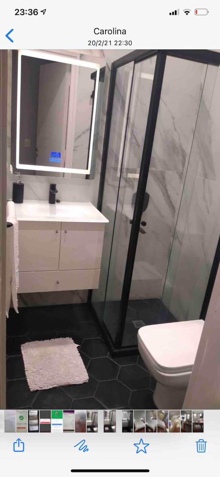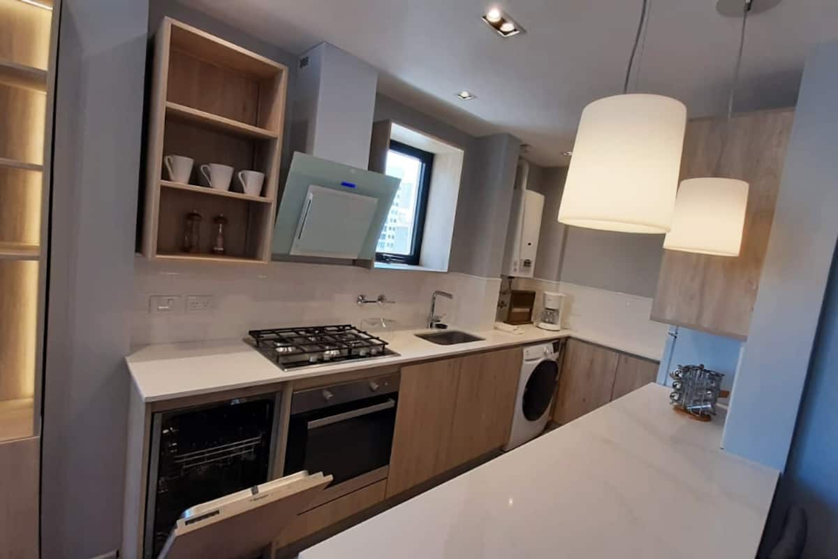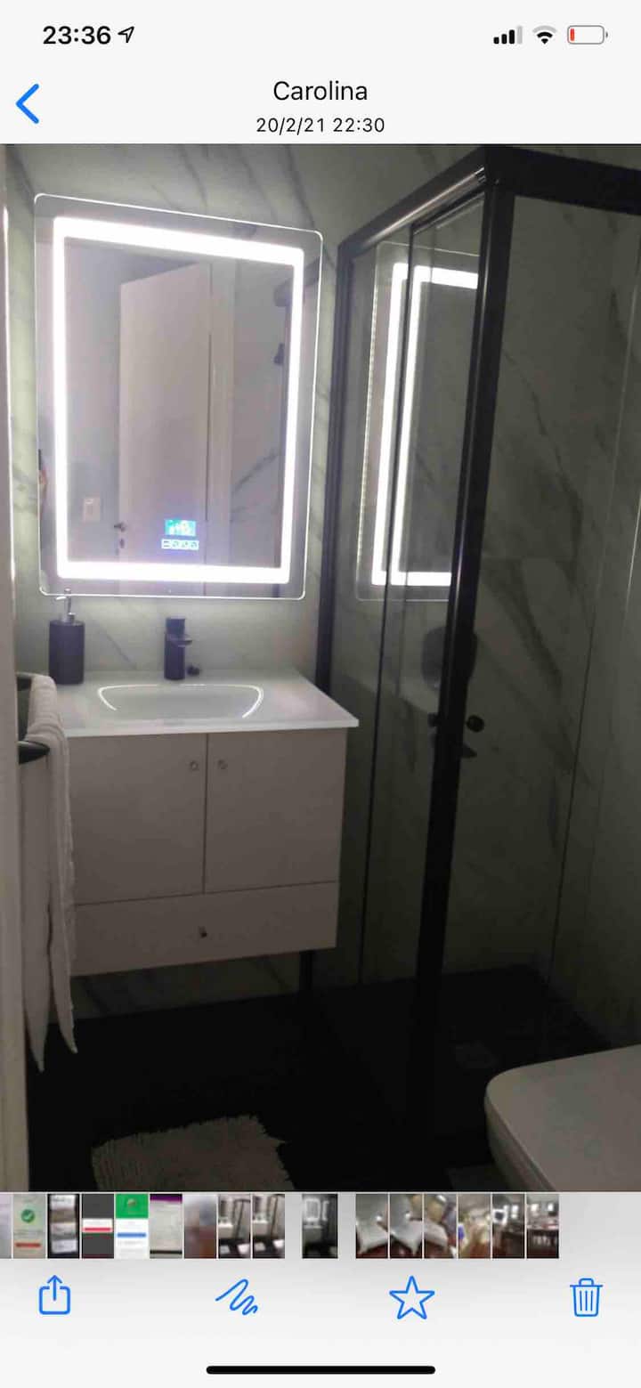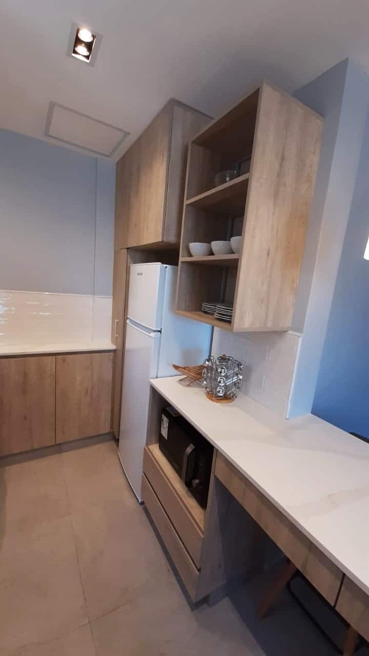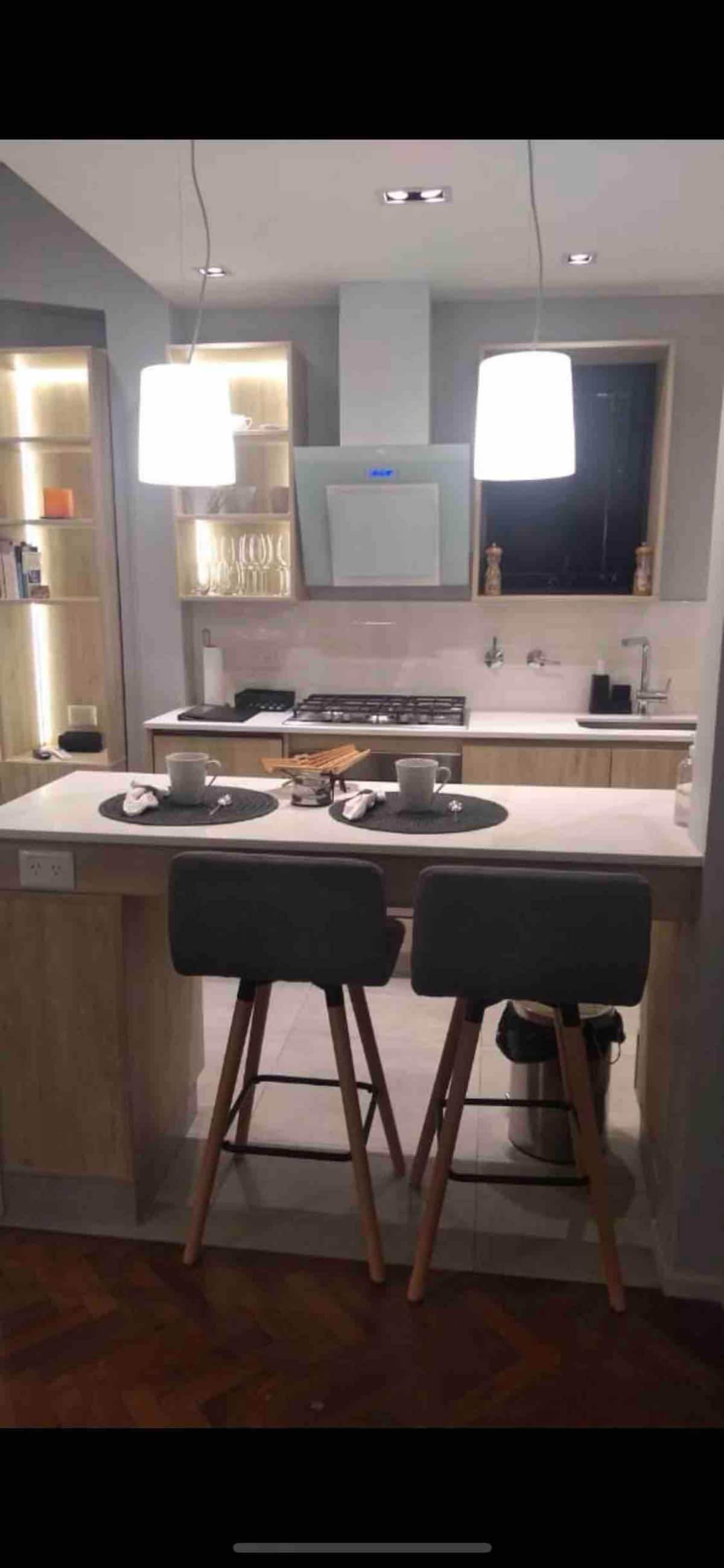 Kitnet em San Telmo, com cama queen ou duas camas de solteiro, com cofre. Possui banheiro completo com box de chuveiro, aquecimento e ar-condicionado. O espaço inclui área de trabalho e está equipado com máquina de lavar e secar, fogão e forno separado, micro-ondas, torradeira, panelas e geladeira, além de ferro e tábua de passar roupa.