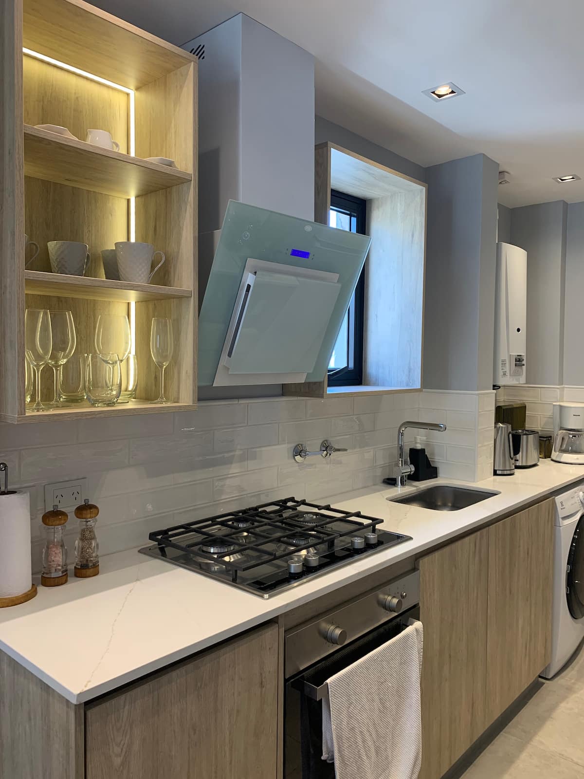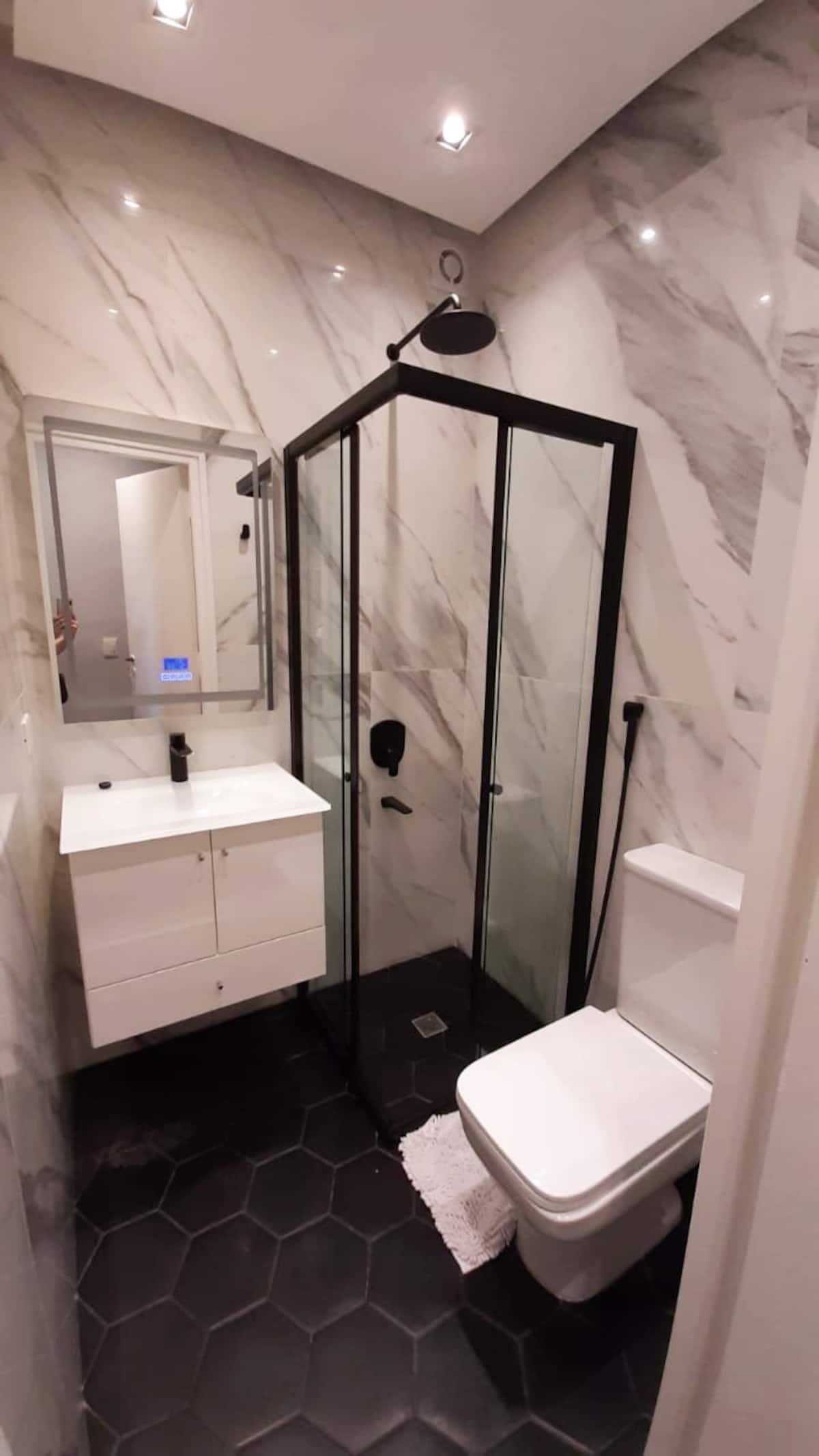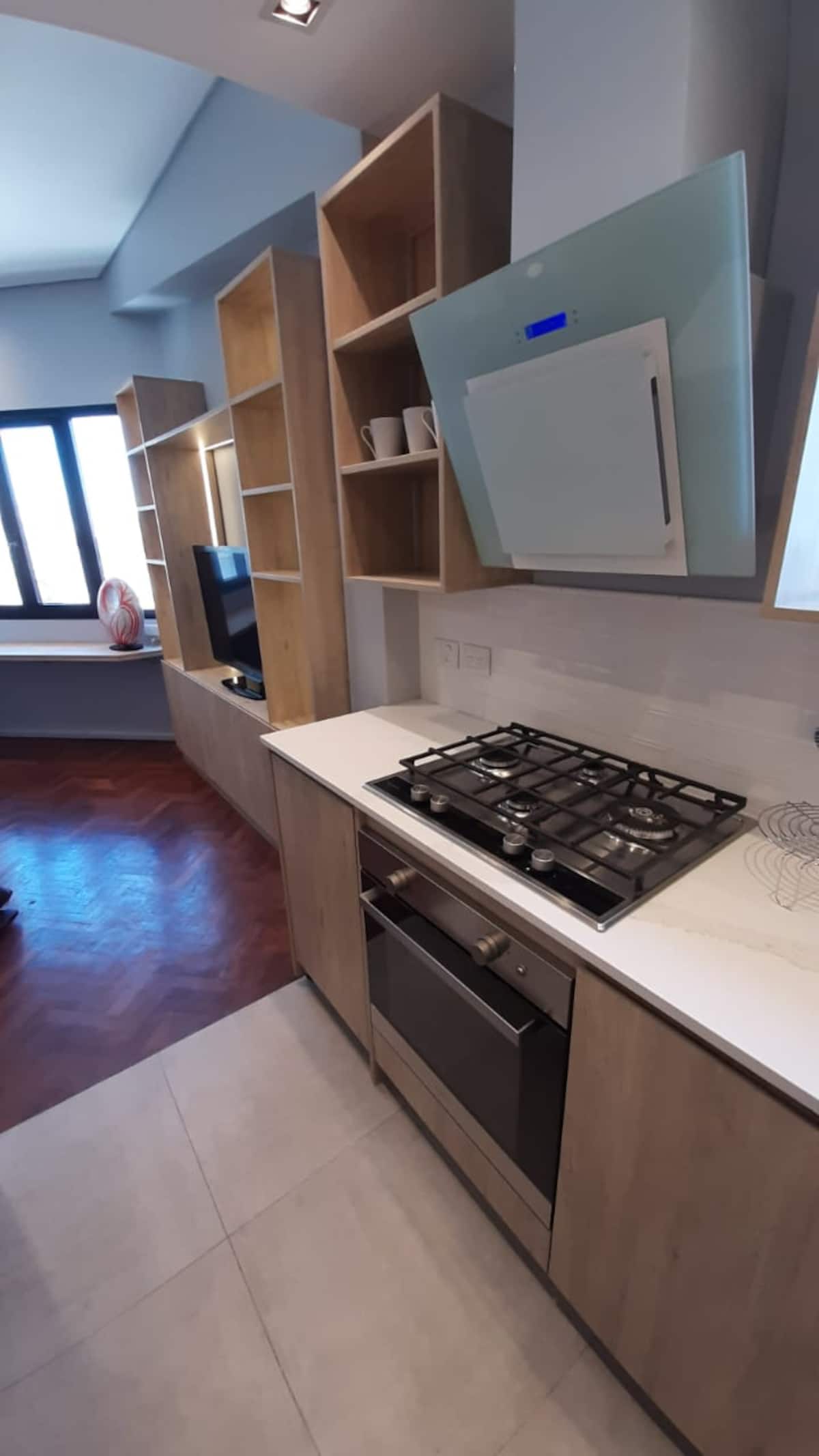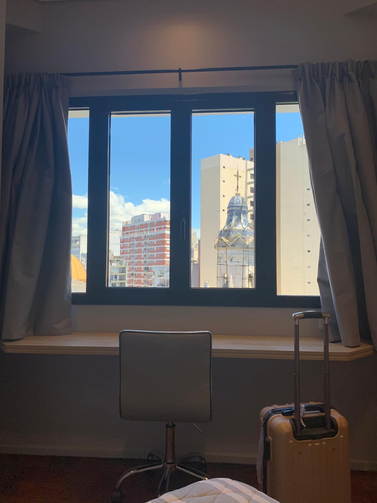 Kitnet em San Telmo, com cama queen ou duas camas de solteiro, com cofre. Possui banheiro completo com box de chuveiro, aquecimento e ar-condicionado. O espaço inclui área de trabalho e está equipado com máquina de lavar e secar, fogão e forno separado, micro-ondas, torradeira, panelas e geladeira, além de ferro e tábua de passar roupa.