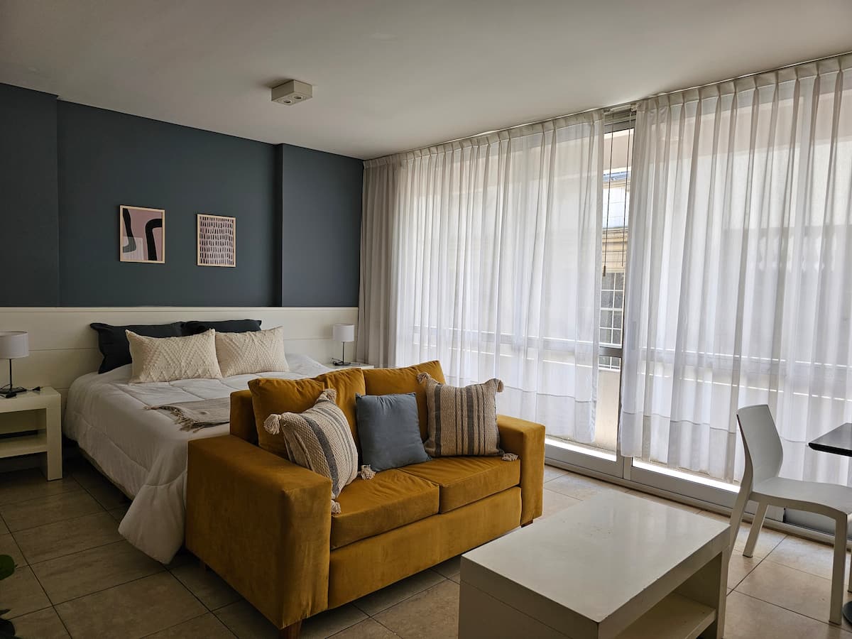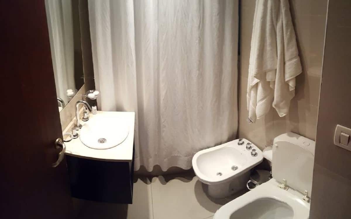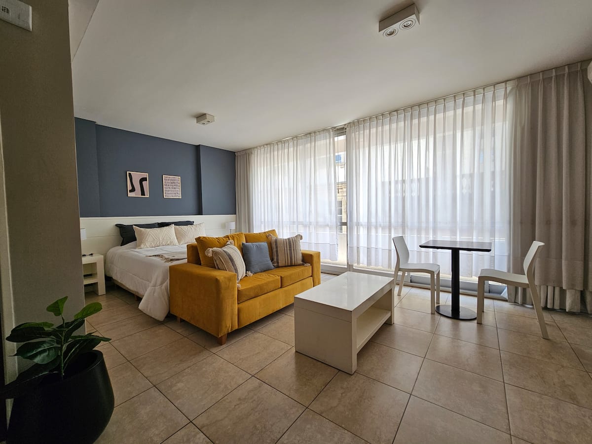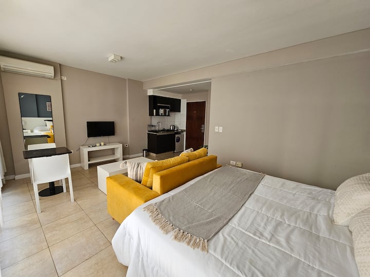 Kitnet mobiliada em Monserrat, a 4 quarteirões do obelisco. Cozinha americana com micro-ondas, louça para duas pessoas, fogão (anafe) e minibar. Banheiro privativo com banheira, cama king, TV LED de 32" e ar-condicionado. Prédio com piscina na cobertura e lavanderia.