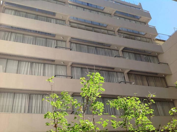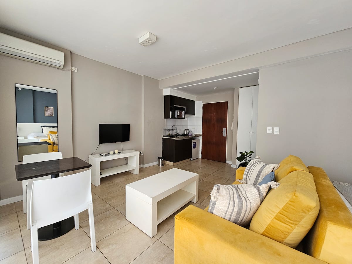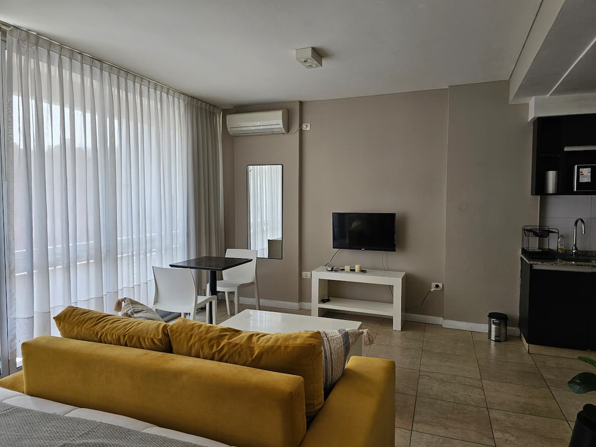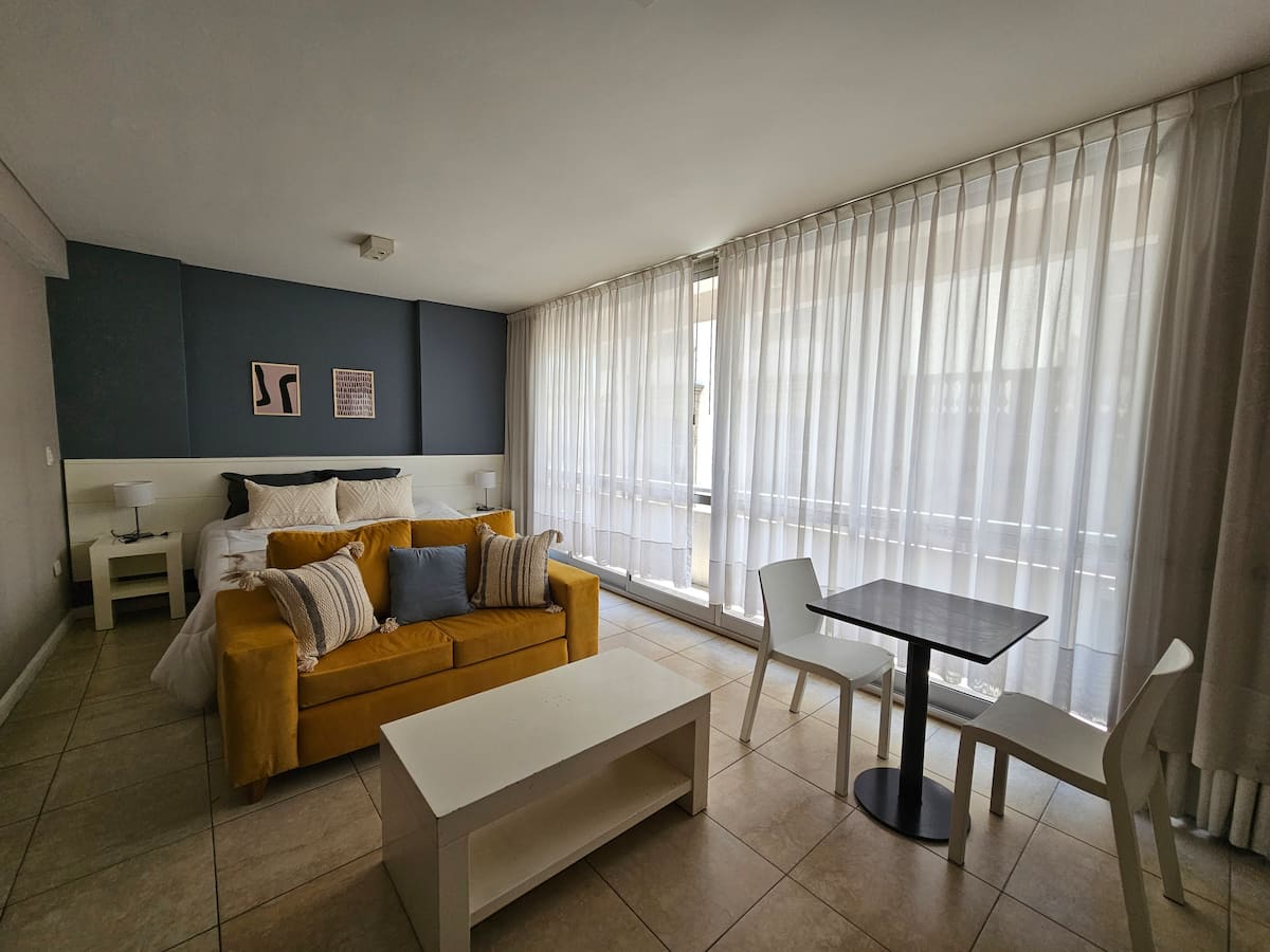 Kitnet mobiliada em Monserrat, a 4 quarteirões do obelisco. Cozinha americana com micro-ondas, louça para duas pessoas, fogão (anafe) e minibar. Banheiro privativo com banheira, cama king, TV LED de 32" e ar-condicionado. Prédio com piscina na cobertura e lavanderia.