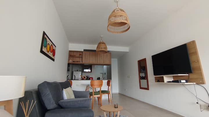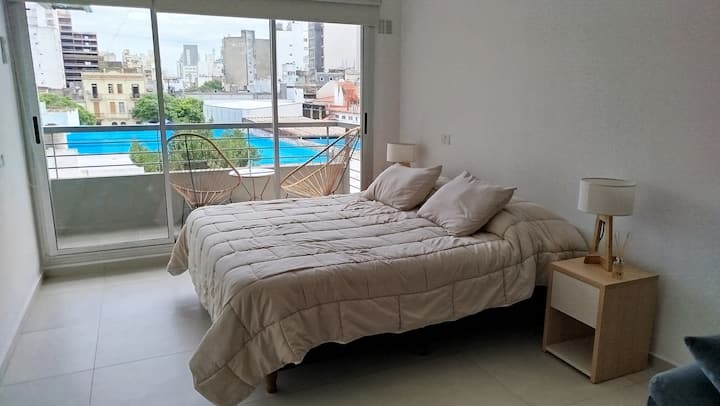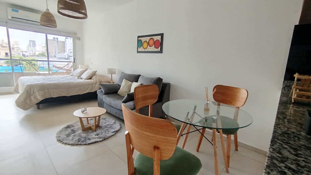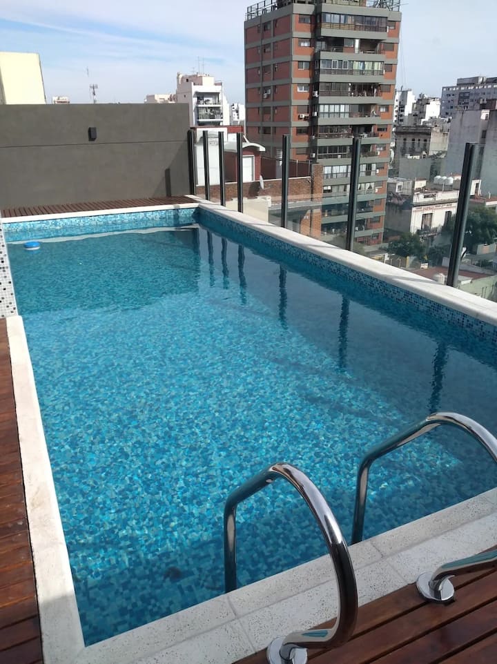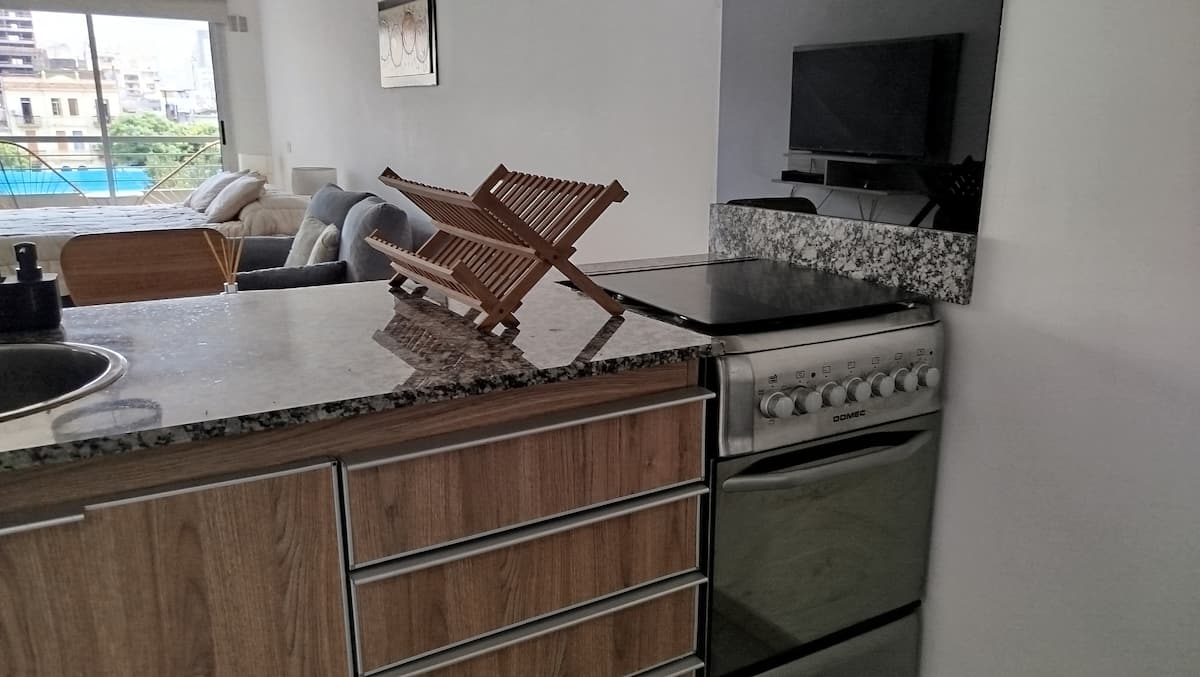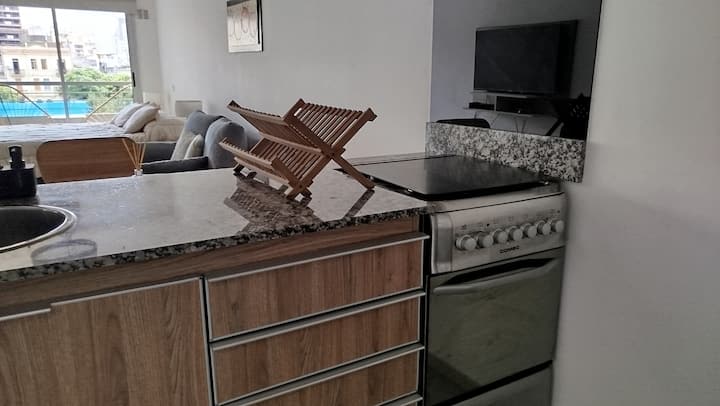 Kitnet em Monserrat. Unidade com acesso a uma área comum com piscina e solário. Fica a 300 metros das estações das Linhas E e C do metrô.