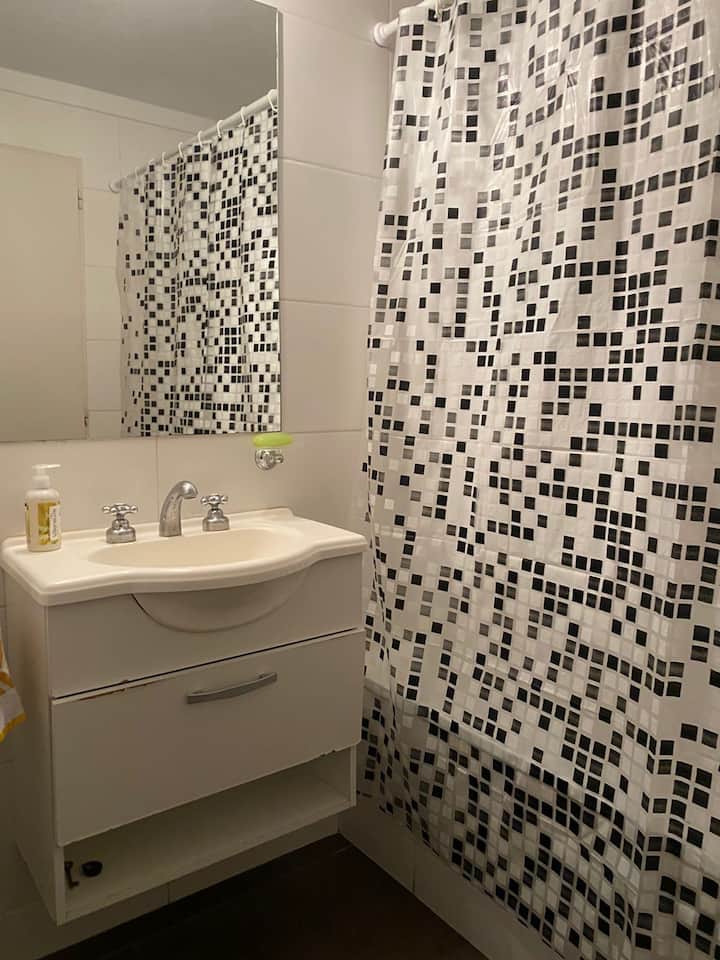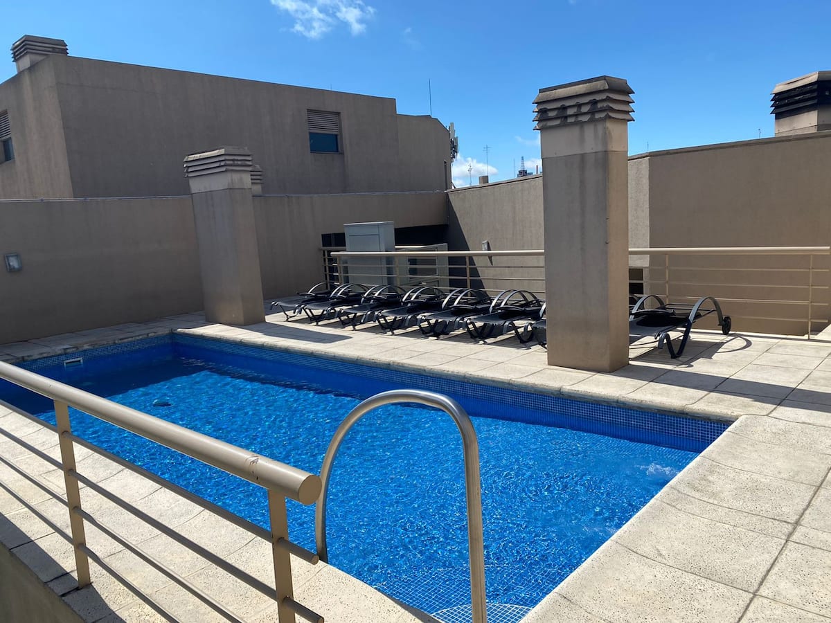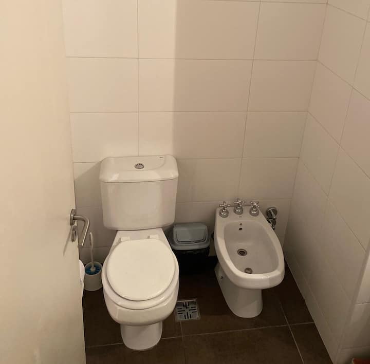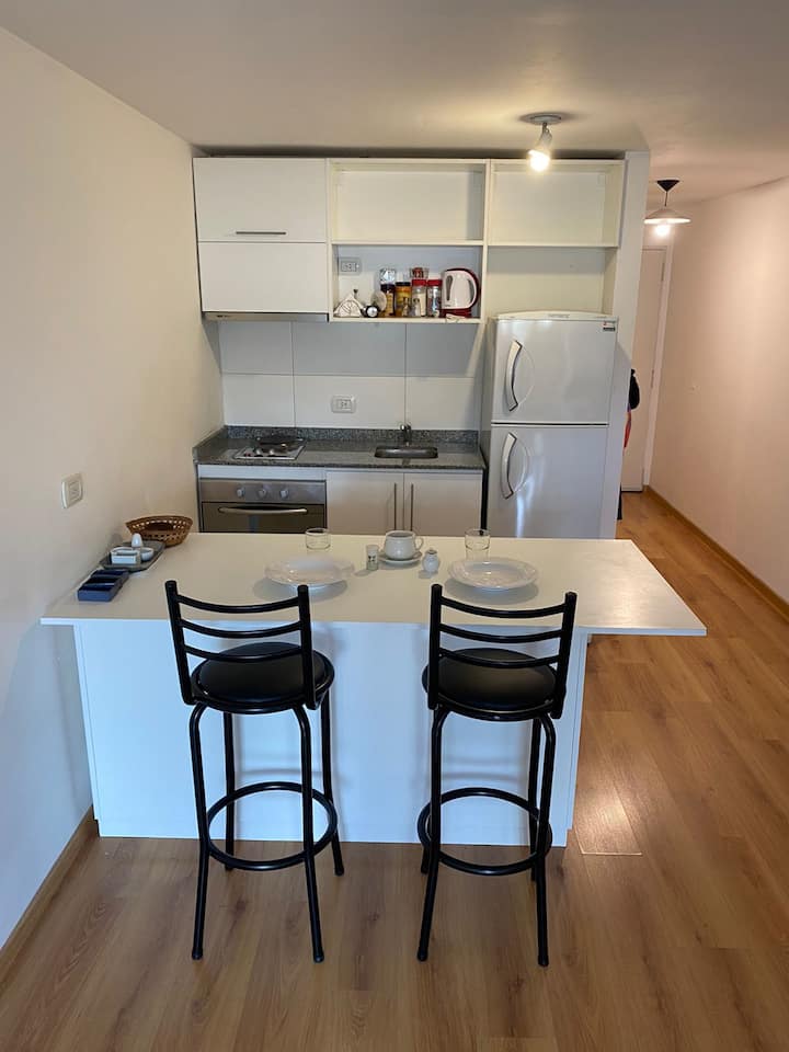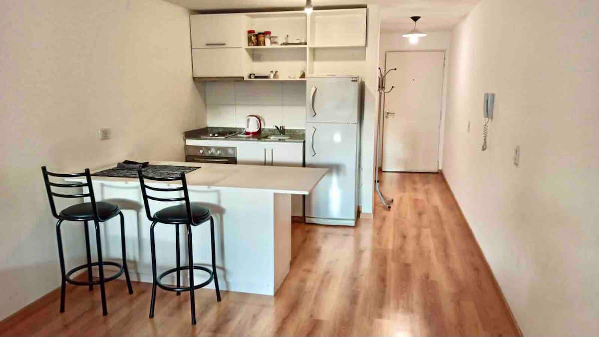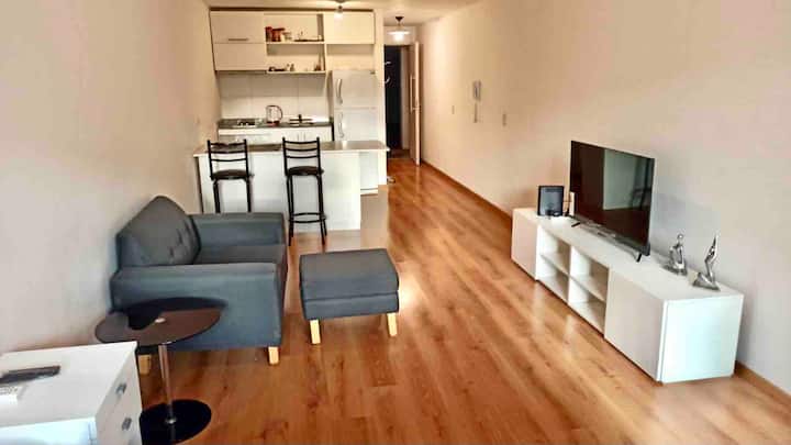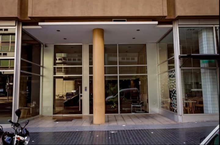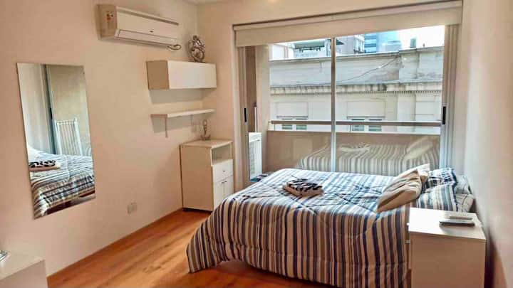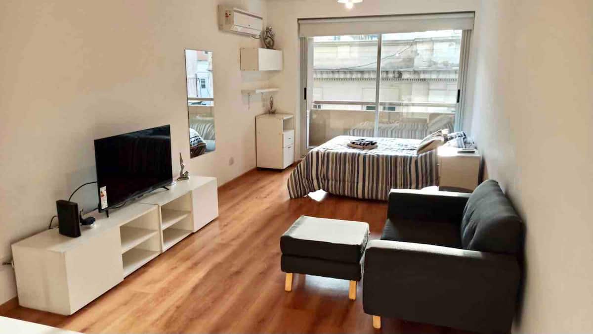 Apartamento tipo kitnet em Monserrat, no centro histórico de Buenos Aires. O edifício tem segurança 24 horas, piscina com espreguiçadeiras na cobertura, área de churrasco, academia e lavanderia. Inclui TV Smart de 42”, internet de 50 megas e TV a cabo com cerca de 80 canais (serviço Fibertel).
