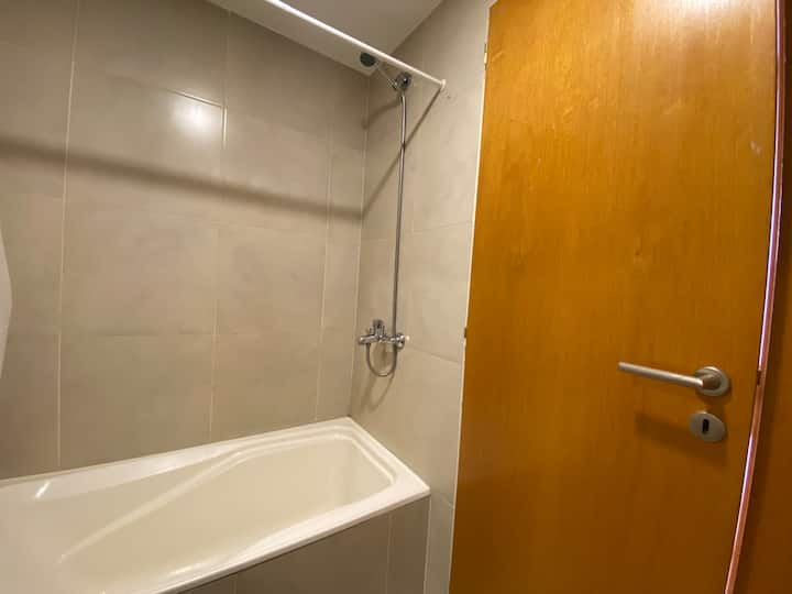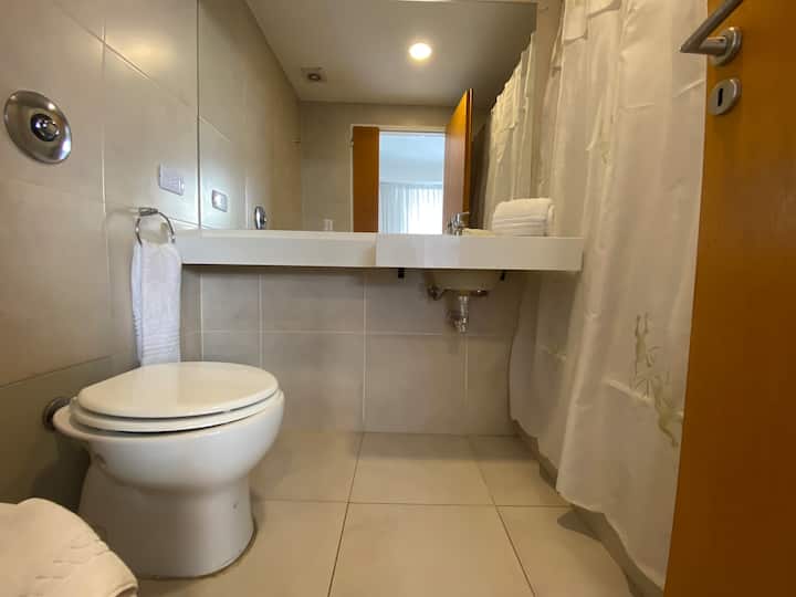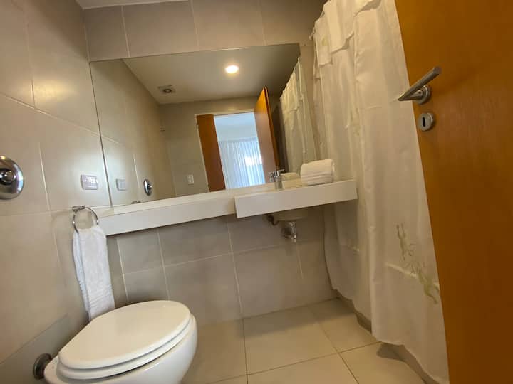 Kitnet em Monserrat, com varanda. Está em um prédio inaugurado em março de 2018 e acomoda até 2 pessoas. Inclui cama de casal, mesa e cadeiras, utensílios e louças, geladeira embutida sob a bancada e banheiro privativo com banheira.
