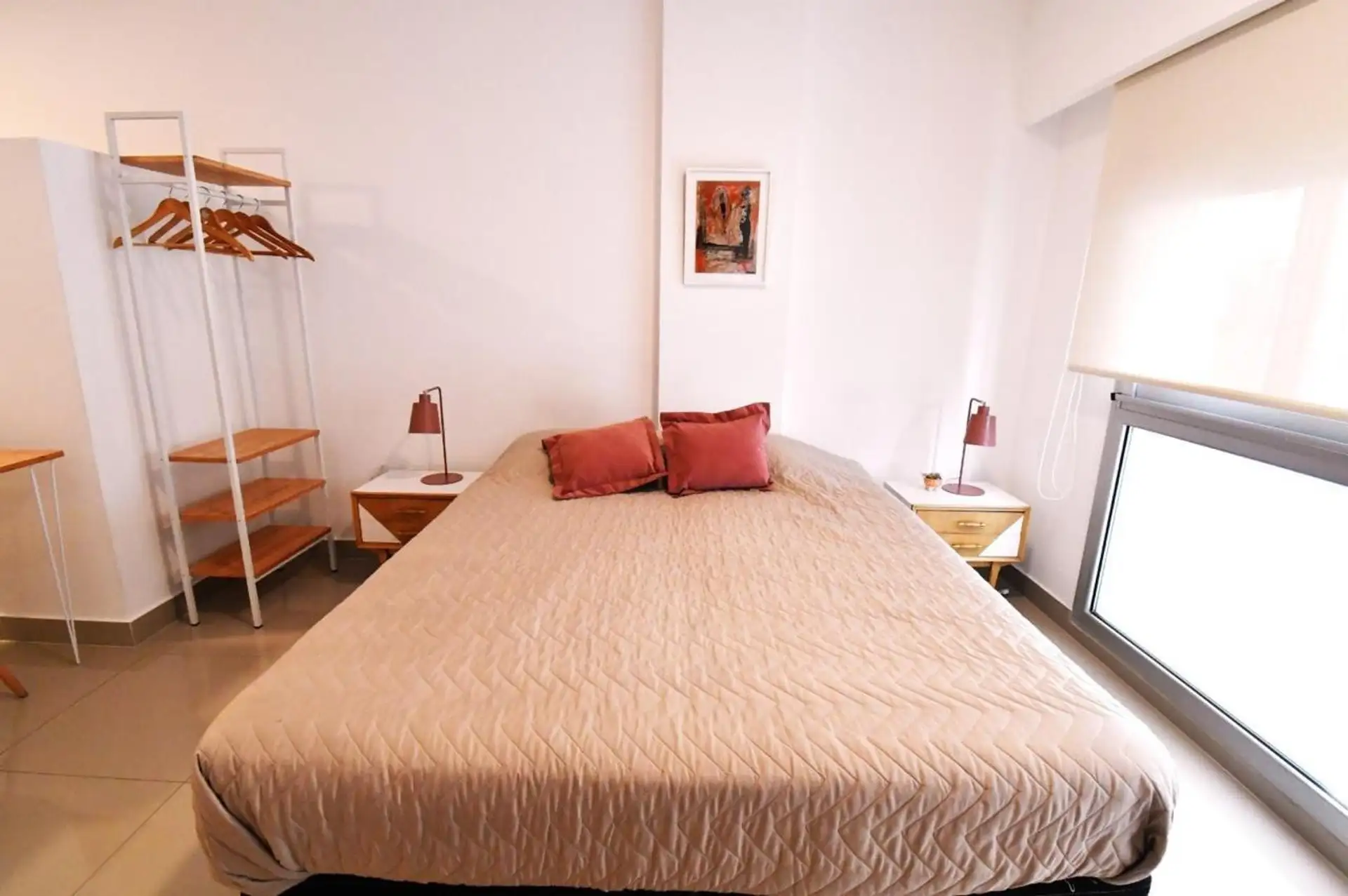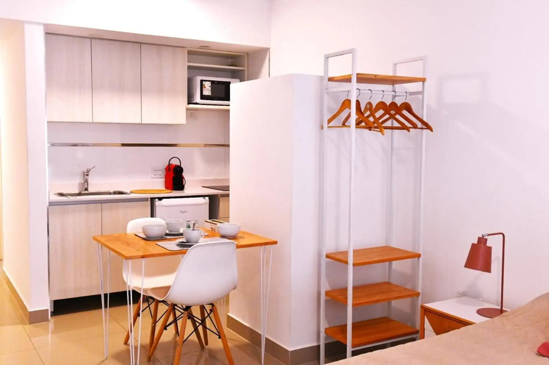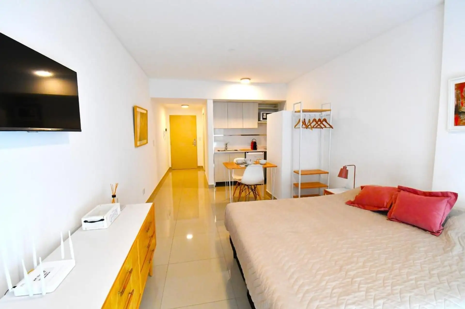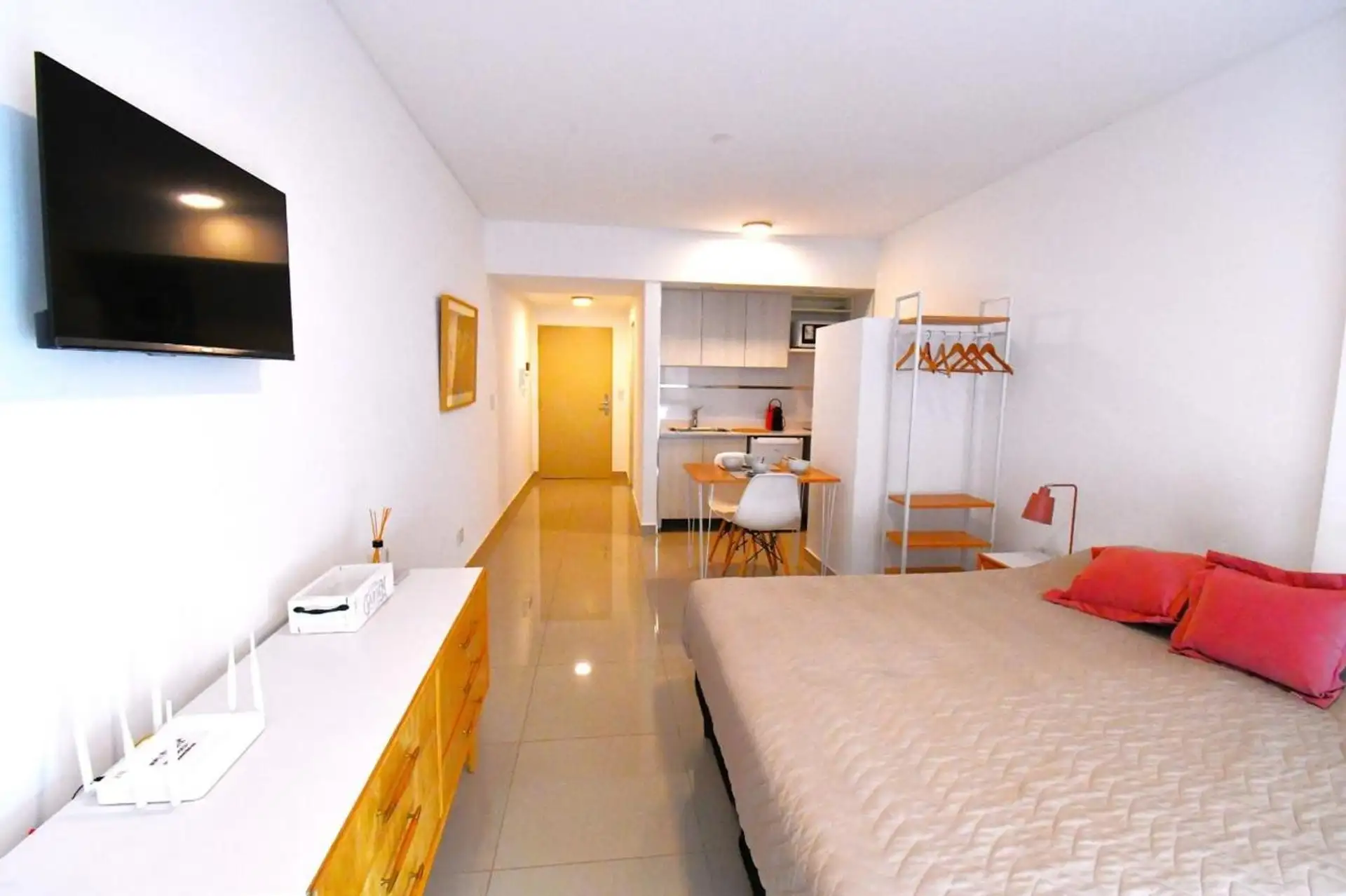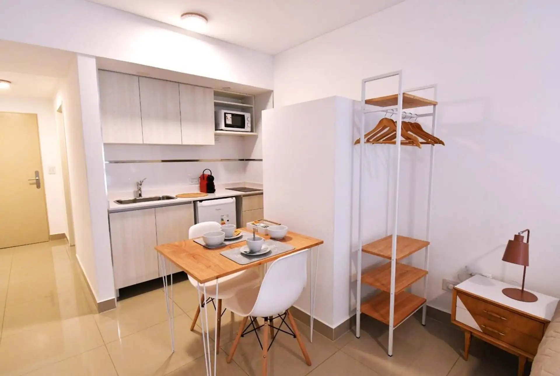 Kitnet para aluguel temporário com 34 m² totais e 30 m² cobertos, de fundos (contrafrente), com área de estar e cozinha equipada. Inclui forno elétrico e micro-ondas, chaleira elétrica, cafeteira Nespresso, torradeira e liquidificador, além de fogão elétrico (anafe) e banheiro completo. O imóvel tem varanda de fundos e ar-condicionado split frio/quente, geladeira e Wi-Fi. O prédio oferece laundry, salão comunitário/cowork (SUM cowork), piscina, gerador, elevadores “inteligentes”, câmeras de segu