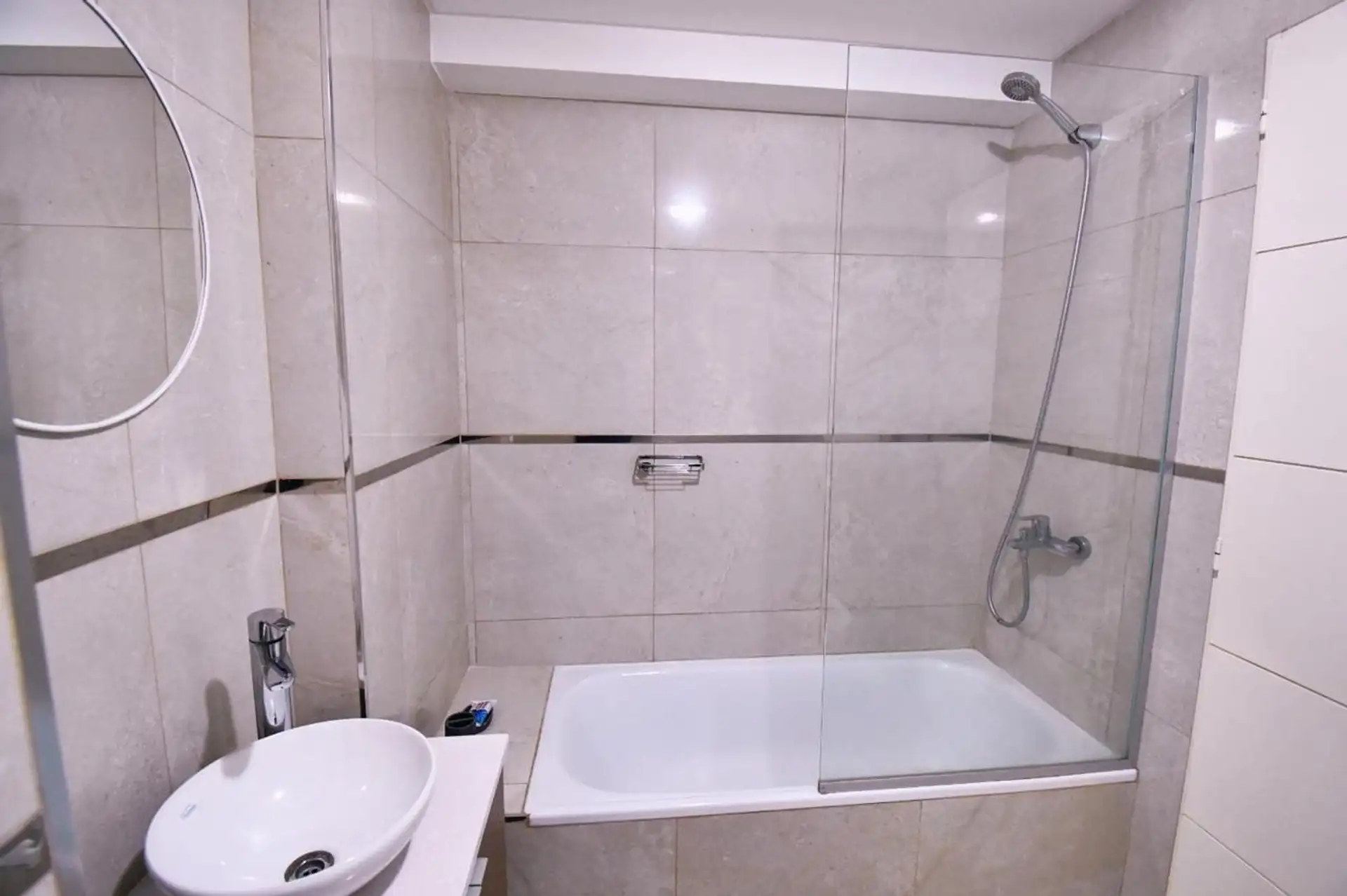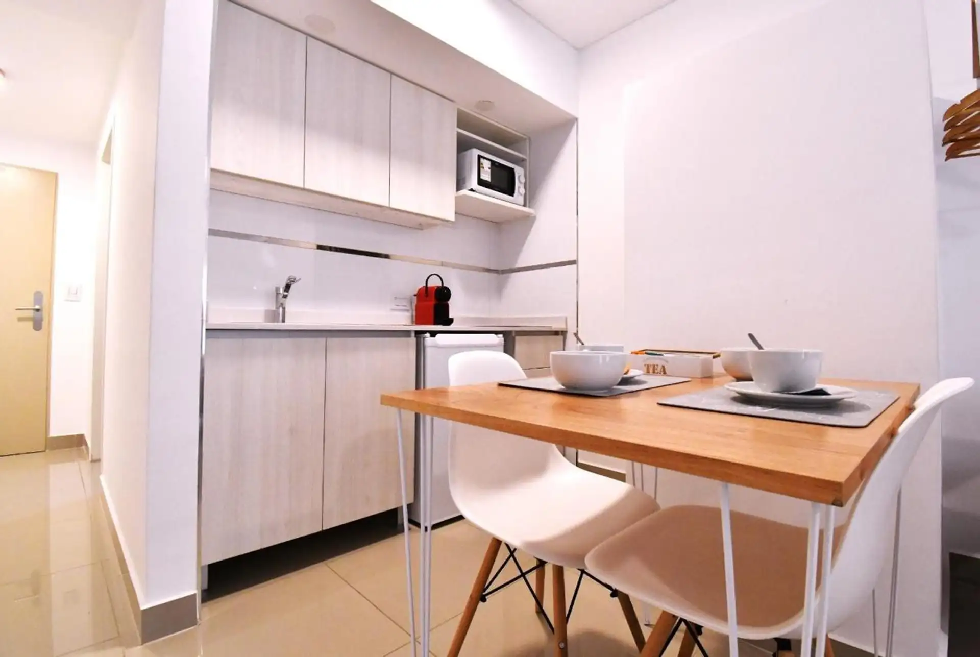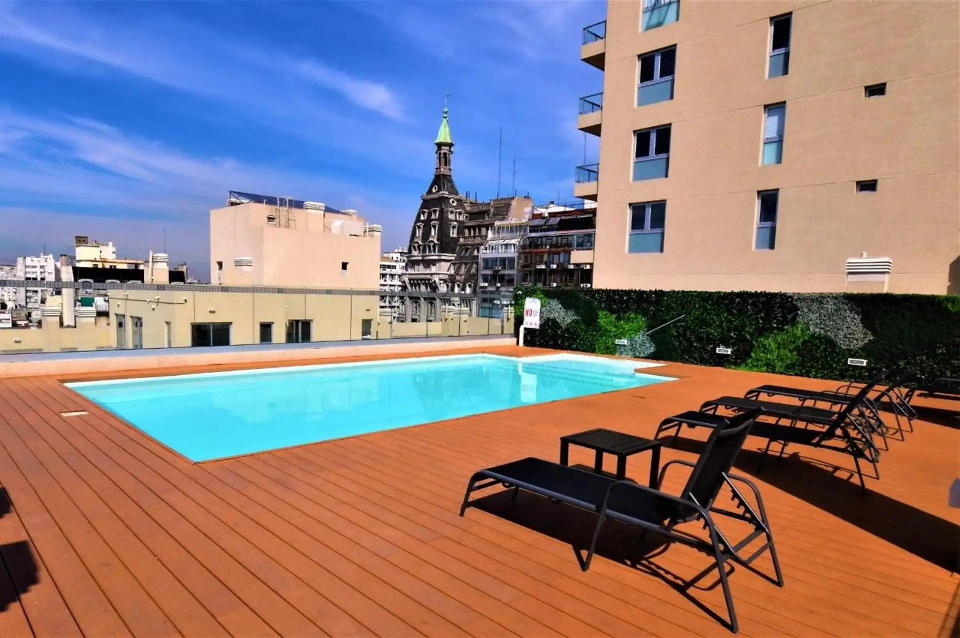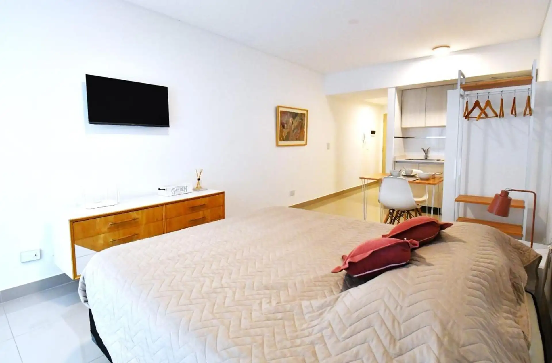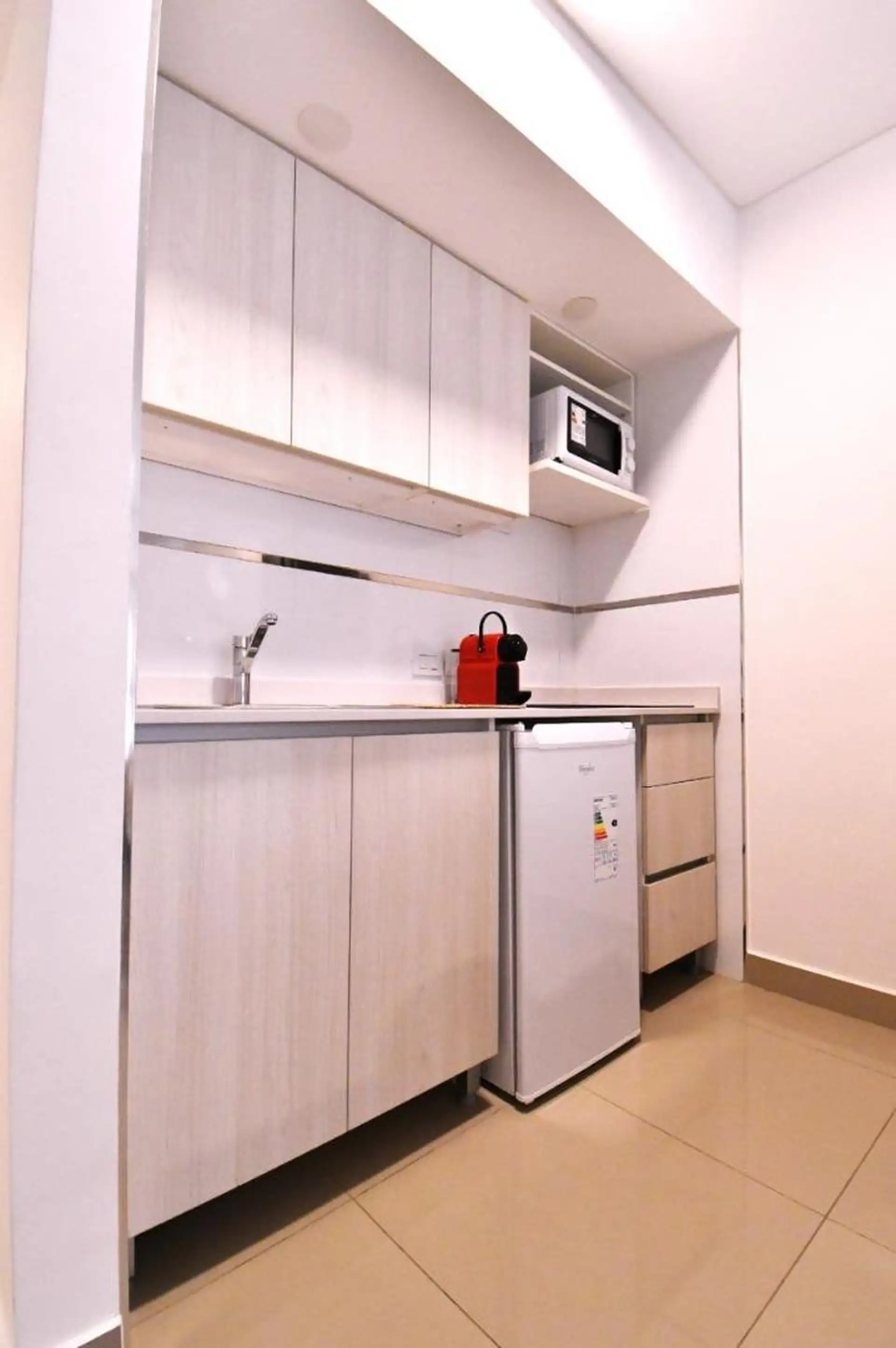 Kitnet para aluguel temporário com 34 m² totais e 30 m² cobertos, de fundos (contrafrente), com área de estar e cozinha equipada. Inclui forno elétrico e micro-ondas, chaleira elétrica, cafeteira Nespresso, torradeira e liquidificador, além de fogão elétrico (anafe) e banheiro completo. O imóvel tem varanda de fundos e ar-condicionado split frio/quente, geladeira e Wi-Fi. O prédio oferece laundry, salão comunitário/cowork (SUM cowork), piscina, gerador, elevadores “inteligentes”, câmeras de segu