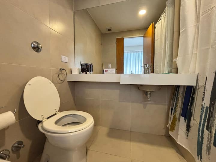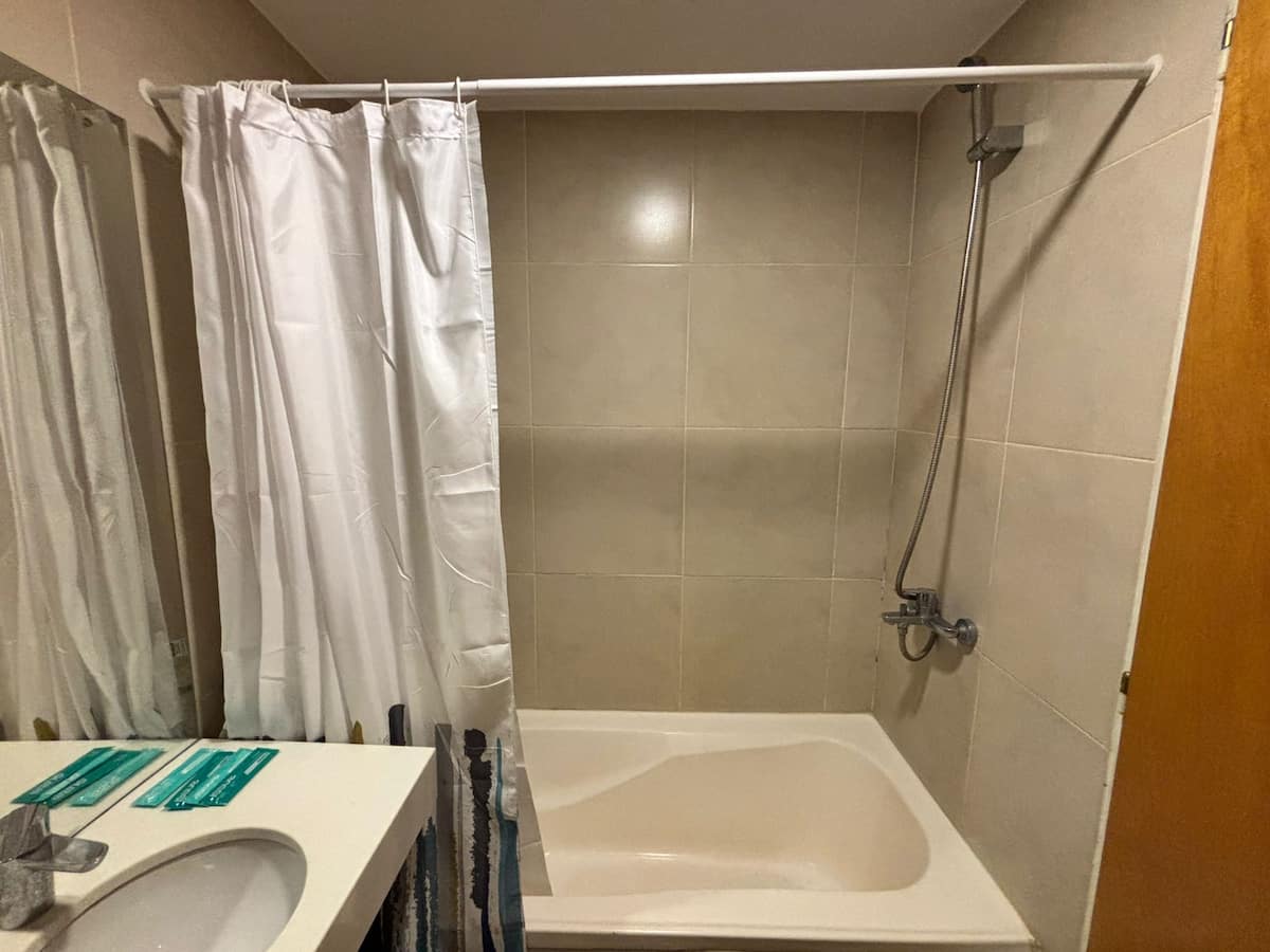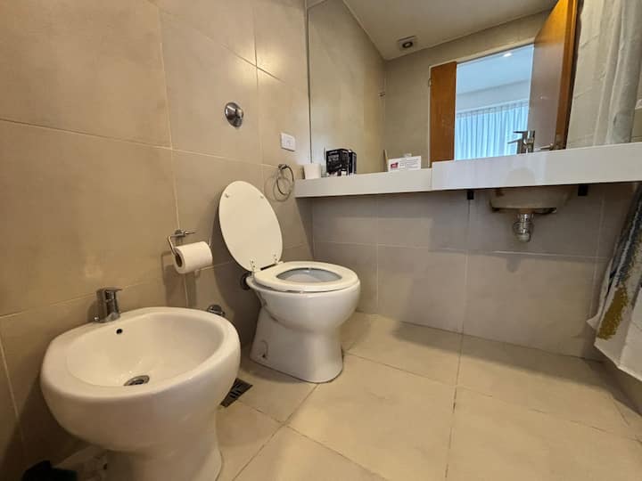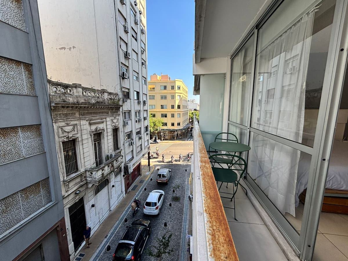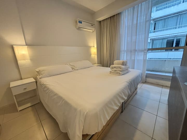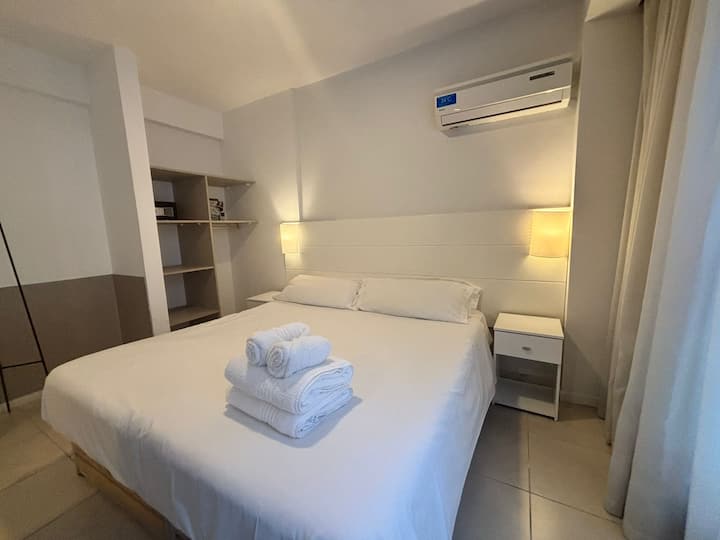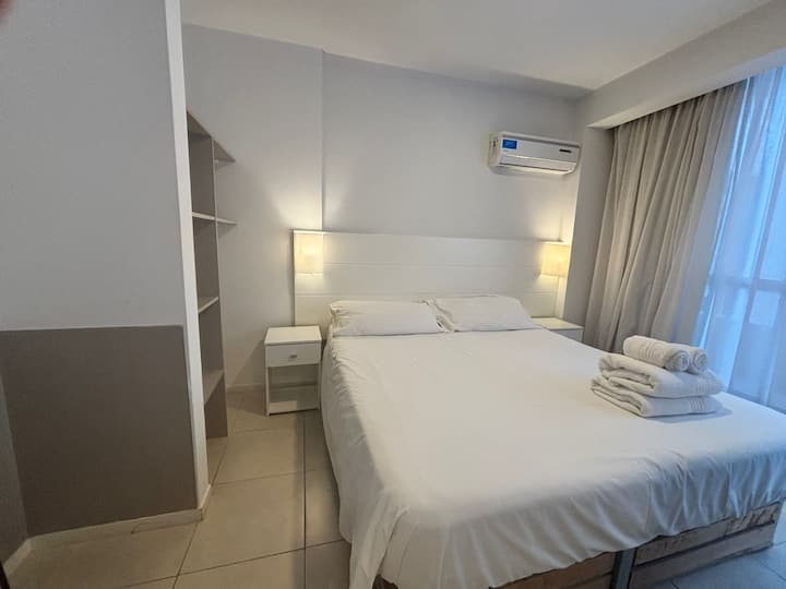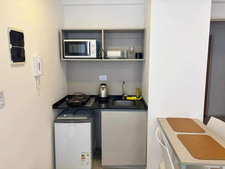 Kitnet com varanda em Monserrat, em prédio inaugurado em março de 2018. A unidade acomoda até 2 pessoas e tem cama de casal, mesa/desk, cadeiras, utensílios e louças, além de geladeira sob a mesa. Possui banheiro privativo com banheira. O prédio é novo e tem mini mercado no térreo.