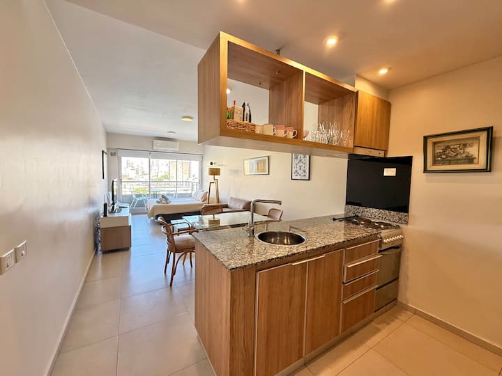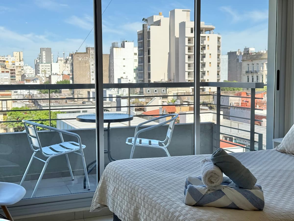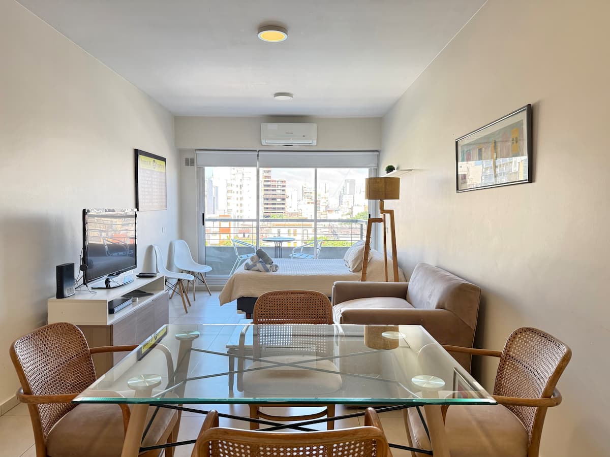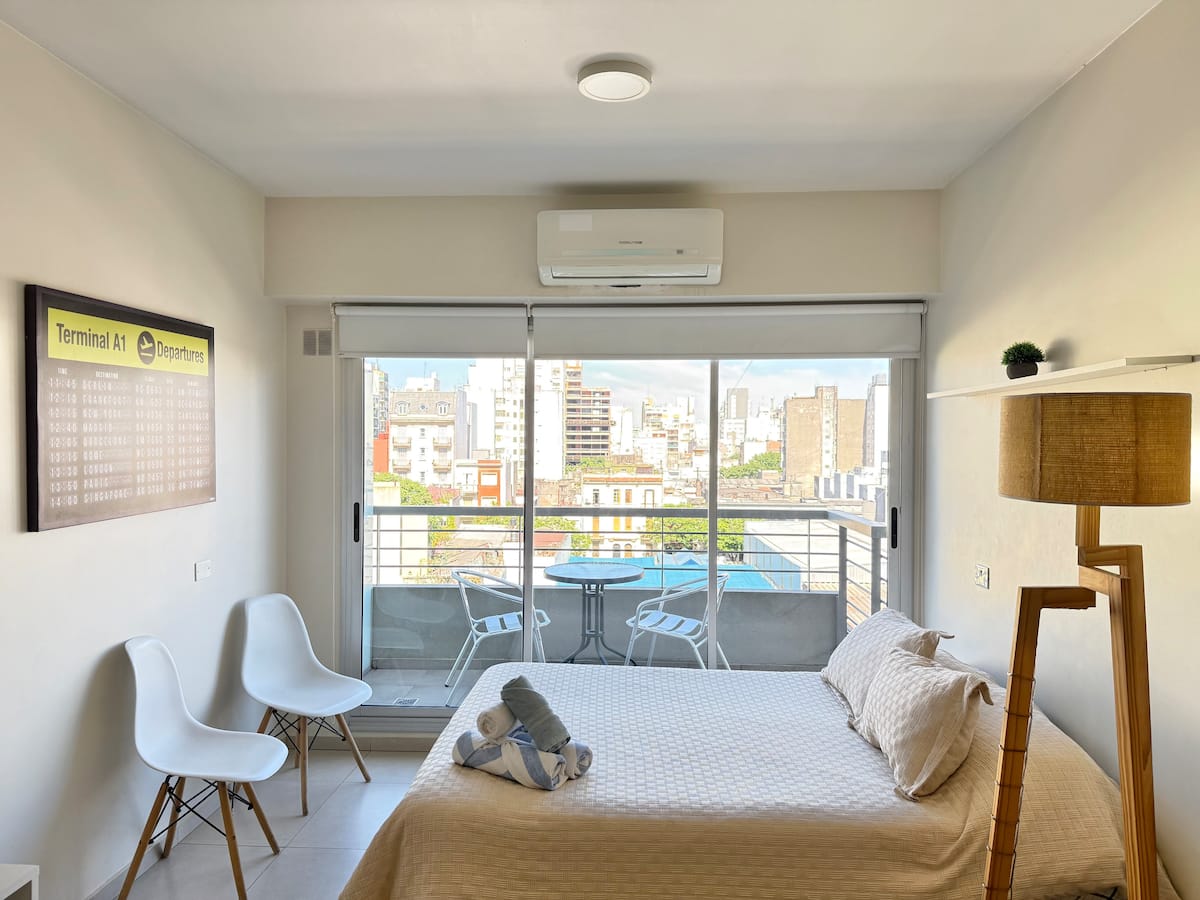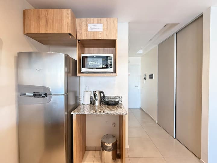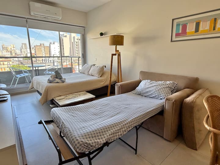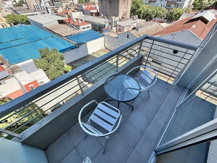 Kitnet em Monserrat, novo (nunca habitado) e totalmente equipado, com 2 portas de acesso com sistema de segurança magnético em ambas. O edifício tem piscina com deck e solarium, e oferece vista a partir do último andar. Há varanda com vista aberta do bairro. A kitchenette é equipada para preparo de refeições, com utensílios e itens de cozinha. O imóvel fica a 3 blocos da estação de metrô da Linha C e a 6 blocos de San Telmo.