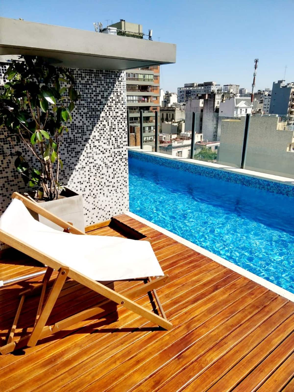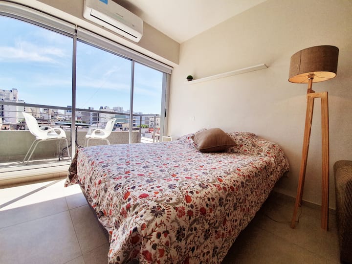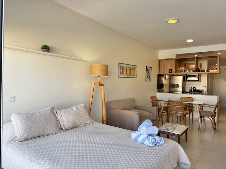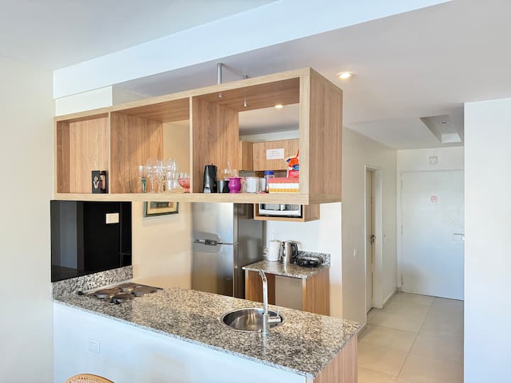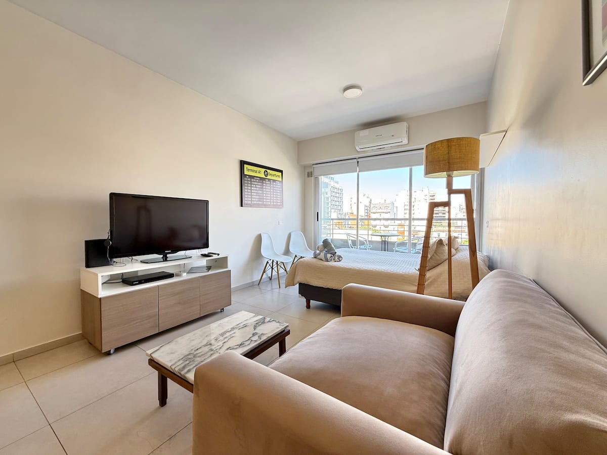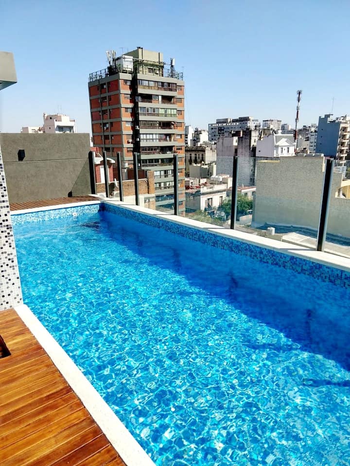 Kitnet em Monserrat, novo (nunca habitado) e totalmente equipado, com 2 portas de acesso com sistema de segurança magnético em ambas. O edifício tem piscina com deck e solarium, e oferece vista a partir do último andar. Há varanda com vista aberta do bairro. A kitchenette é equipada para preparo de refeições, com utensílios e itens de cozinha. O imóvel fica a 3 blocos da estação de metrô da Linha C e a 6 blocos de San Telmo.