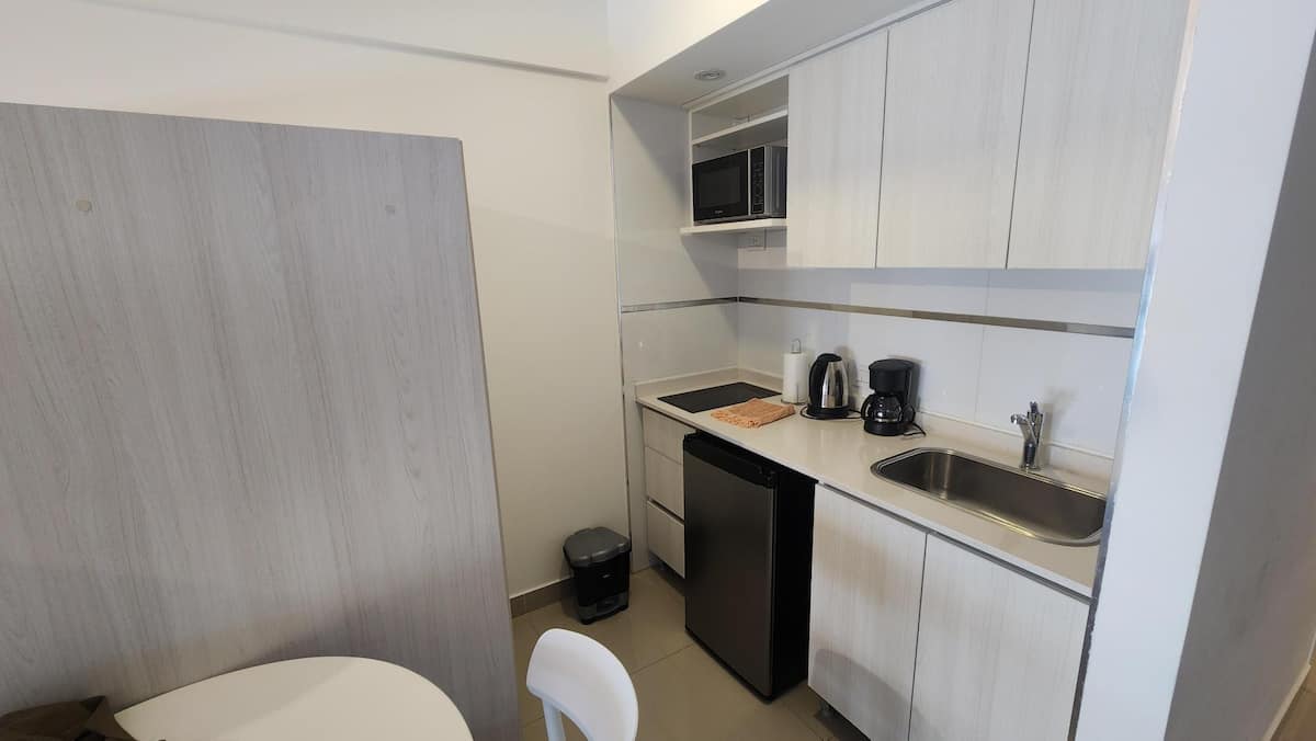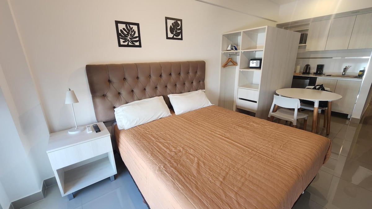 Apartamento tipo studio mobiliado em Monserrat, com planta em conceito aberto integrando sala, área de jantar e área de dormir. Cozinha equipada com utensílios e aparelhos essenciais. Banheiro recém-reformado com box para chuveiro e acabamentos. Inclui TV com serviços de streaming e Wi-Fi de alta velocidade.
