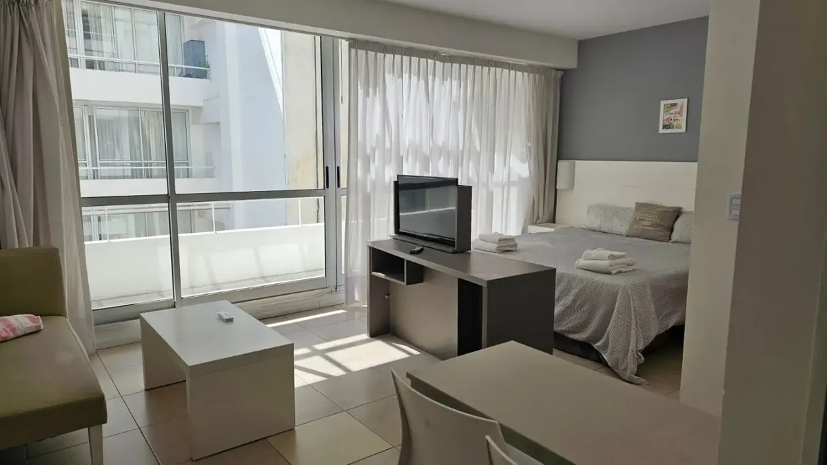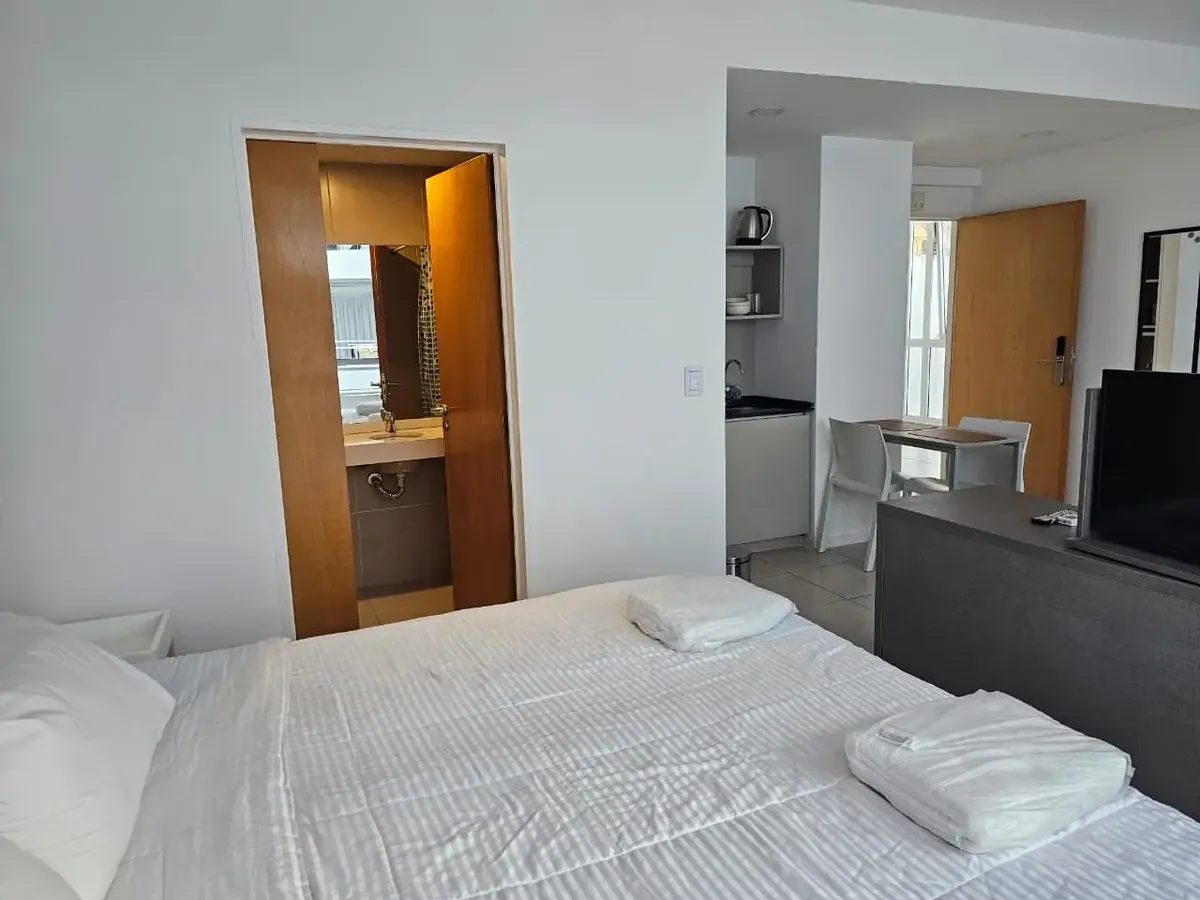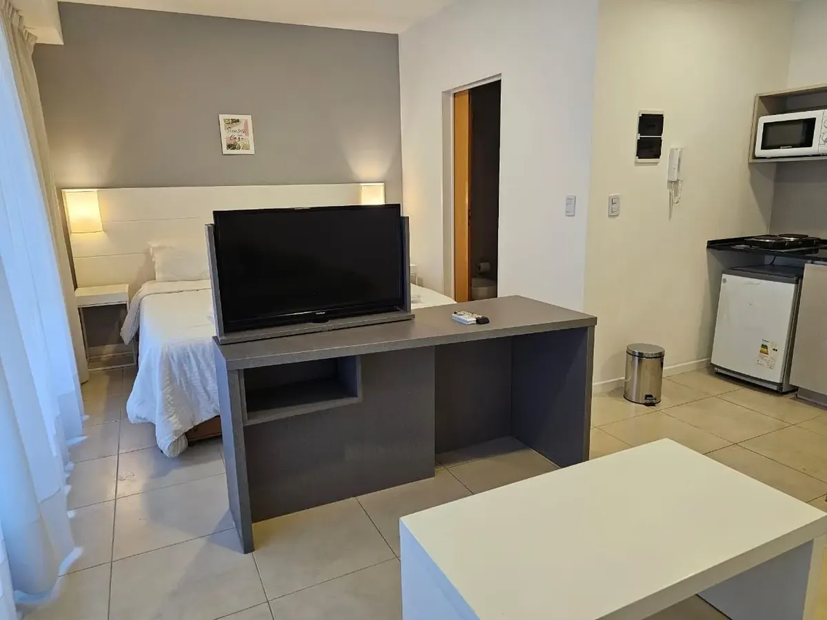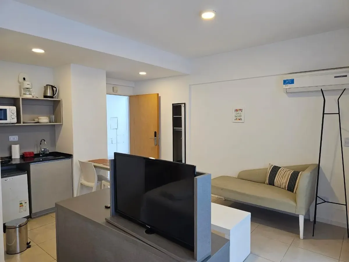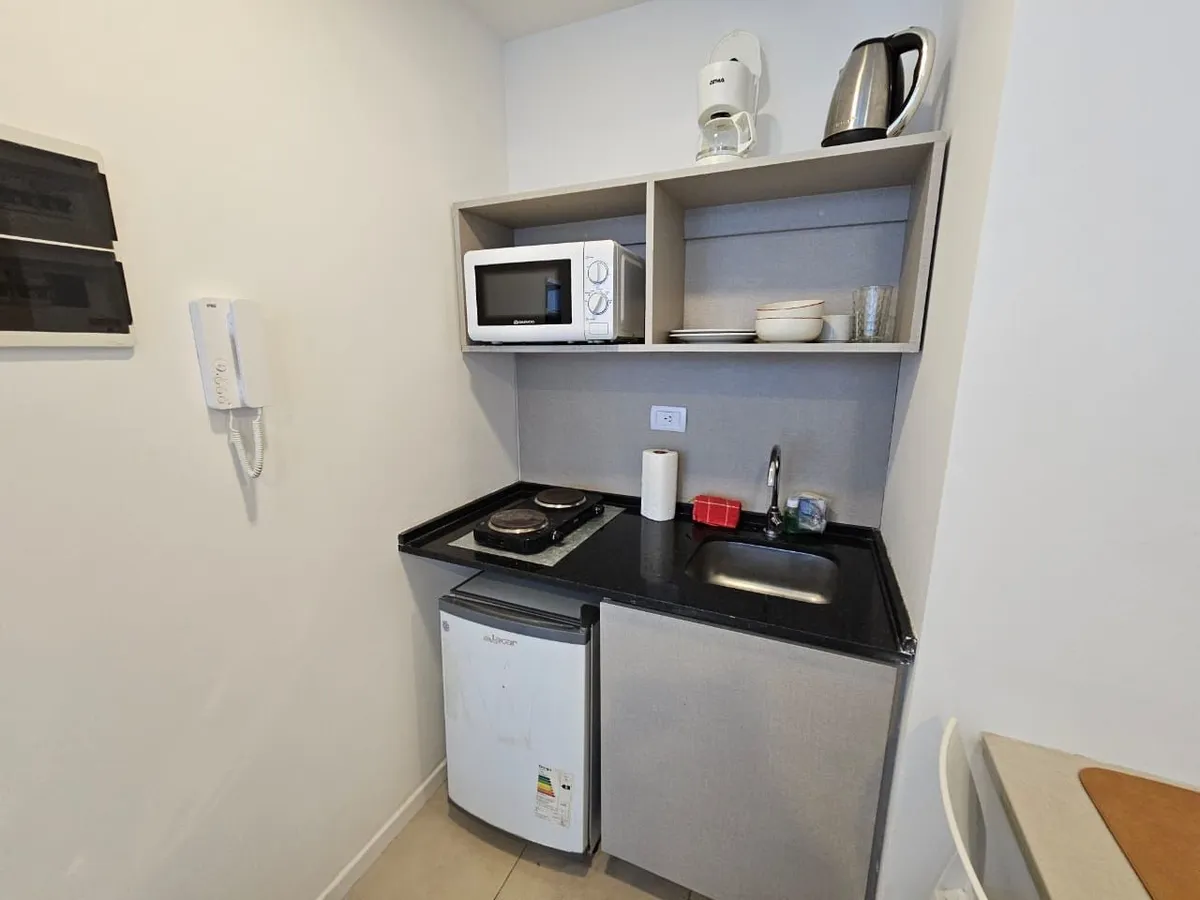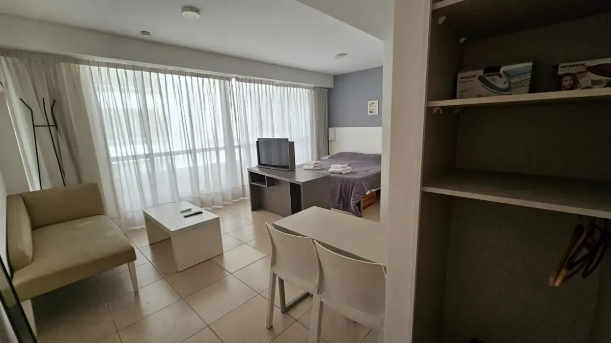 Kitnet mobiliada com 36 m² totais, com varanda ampla, em San Telmo. A unidade tem cozinha integrada com móveis de armazenamento, banheiro completo com banheira e ar-condicionado frio-calor. O apartamento é entregue com cama, mesa, cadeiras, TV, geladeira, micro-ondas e cafeteira. O aluguel é de ARS 600.000 por mês, mais despesas, com mês de adiantamento e depósito; disponível a partir de 30 de abril de 2026.