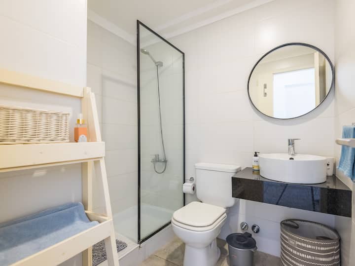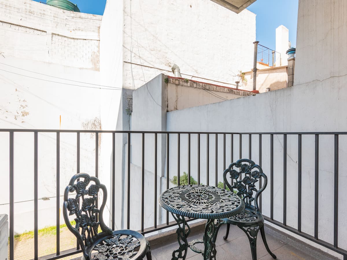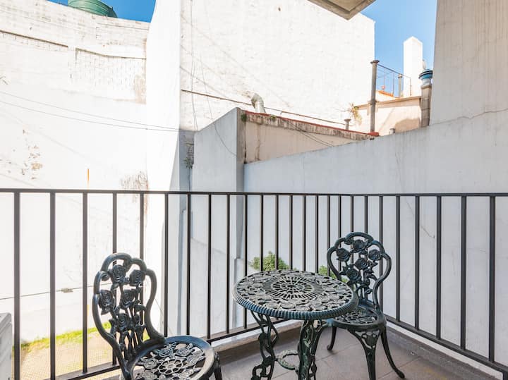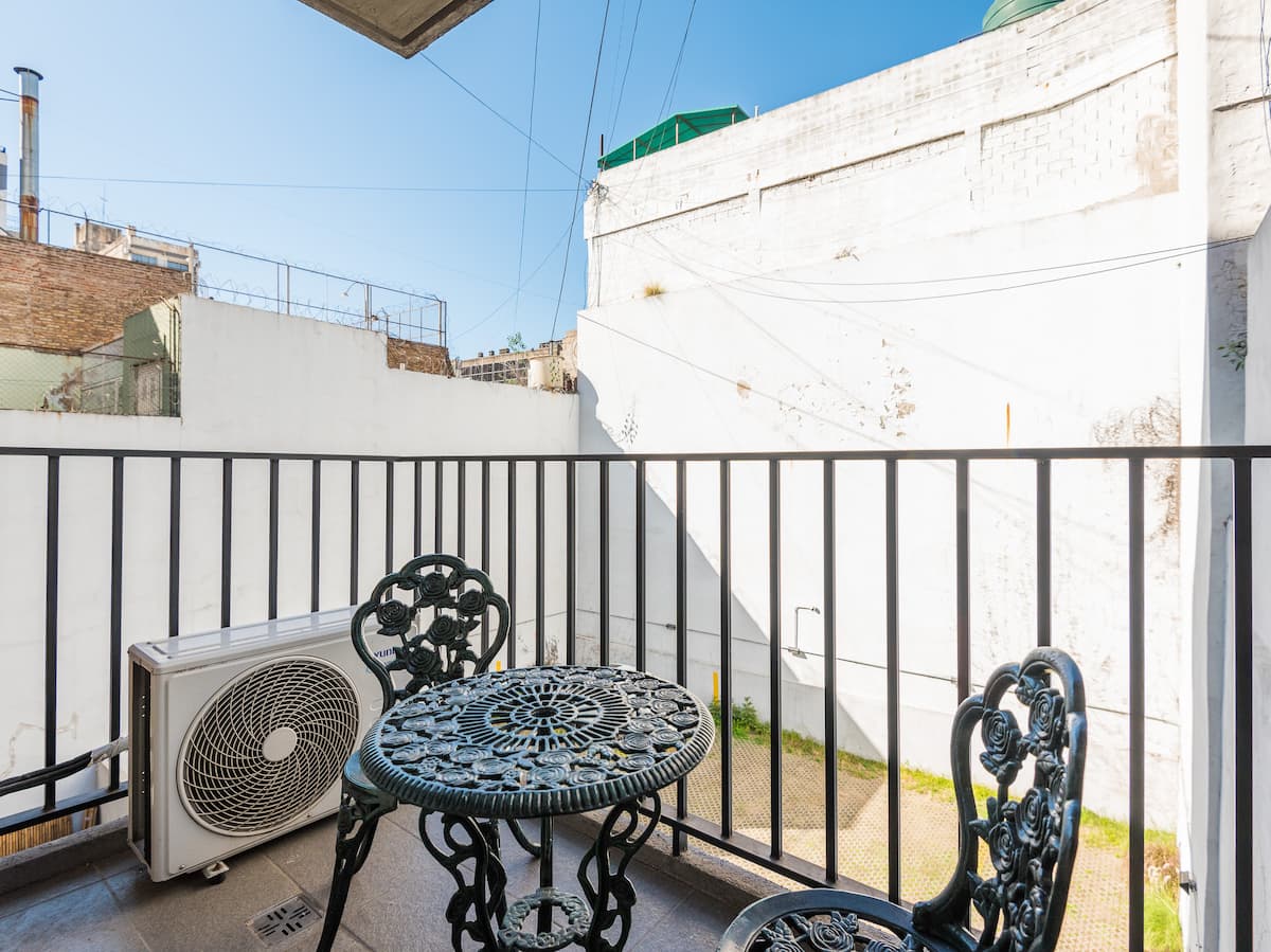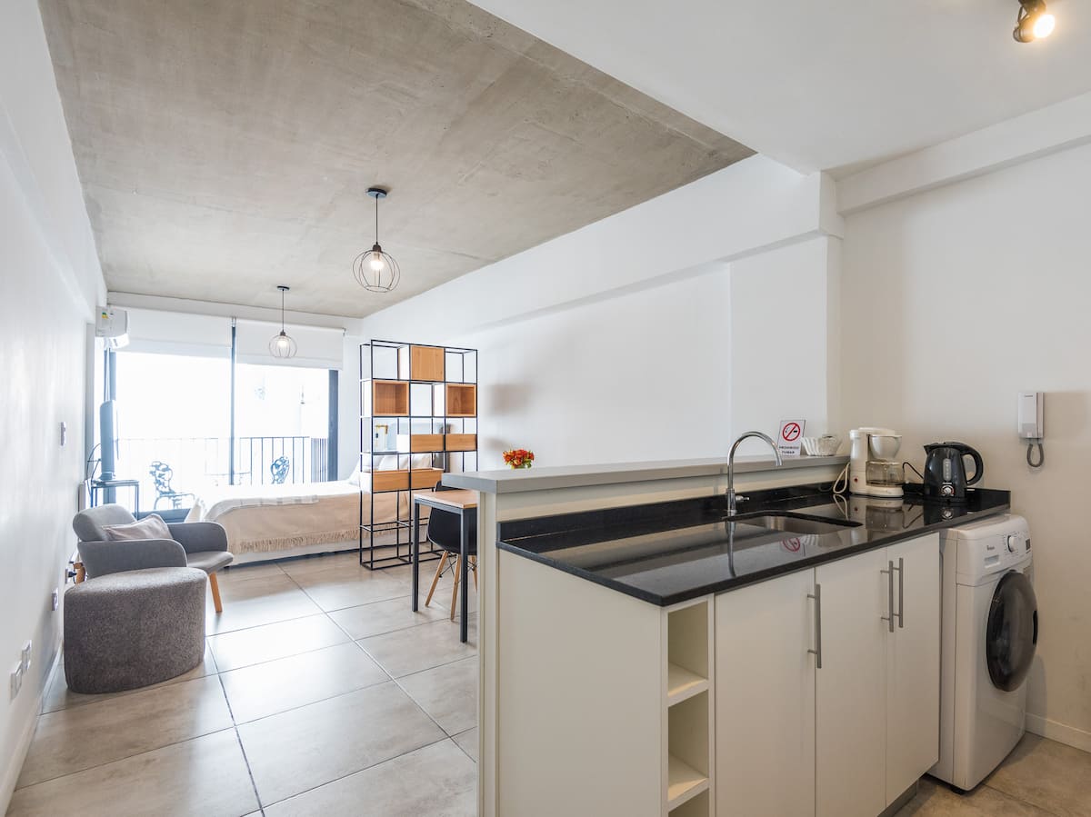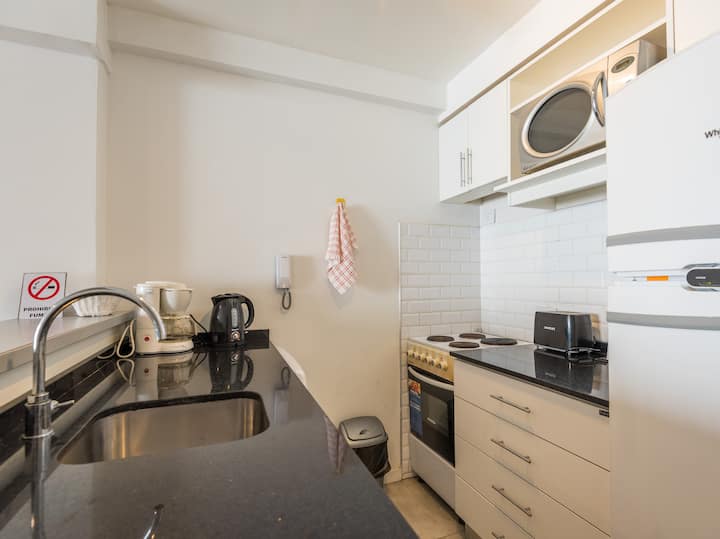 Kitnet em Monserrat com varanda, ar-condicionado (frio e quente) e área de banho. Inclui geladeira com freezer, micro-ondas, forno elétrico, fogão elétrico, cafeteira, torradeira e chaleira elétrica, além de máquina de lavar dentro do apartamento. O edifício tem elevador, acesso para pessoas com deficiência, terraço, alarme de incêndio e câmera de segurança.