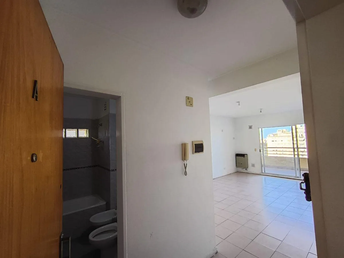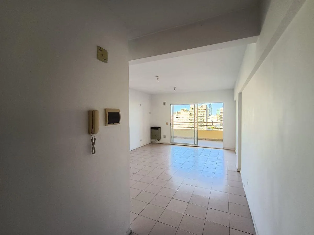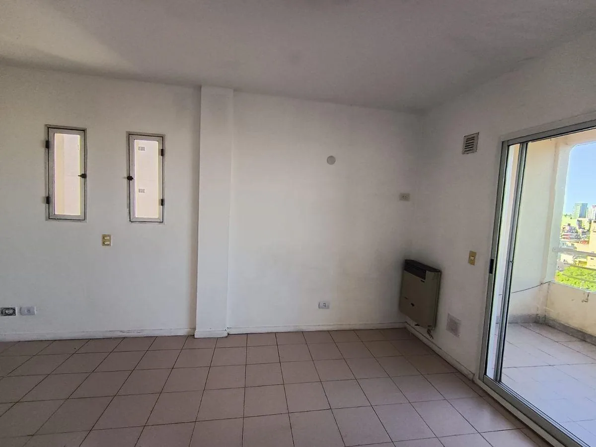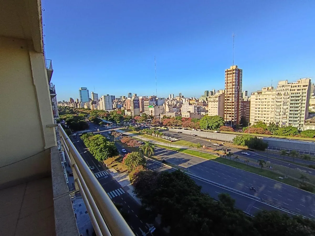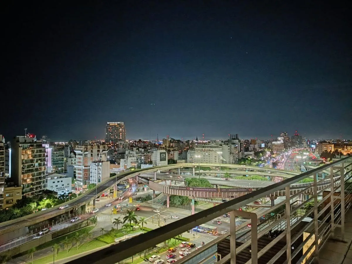 Kitnet de um ambiente com varanda de frente para a rua, no 11º andar. Vista para a Calle 9 de Julio e a autopista; com janelas de vidro duplo e ambiente iluminado e arejado. Possui cozinha com fogão de 4 bocas e forno, aquecedor elétrico (calefón), bancada e armário (alacena) com prateleiras, além de banheiro completo com box. O prédio tem elevador, câmera de segurança e terraço com área de churrasco e espaço de lavanderia (laundry). Aceita animais de estimação na varanda; a localização fica a 3