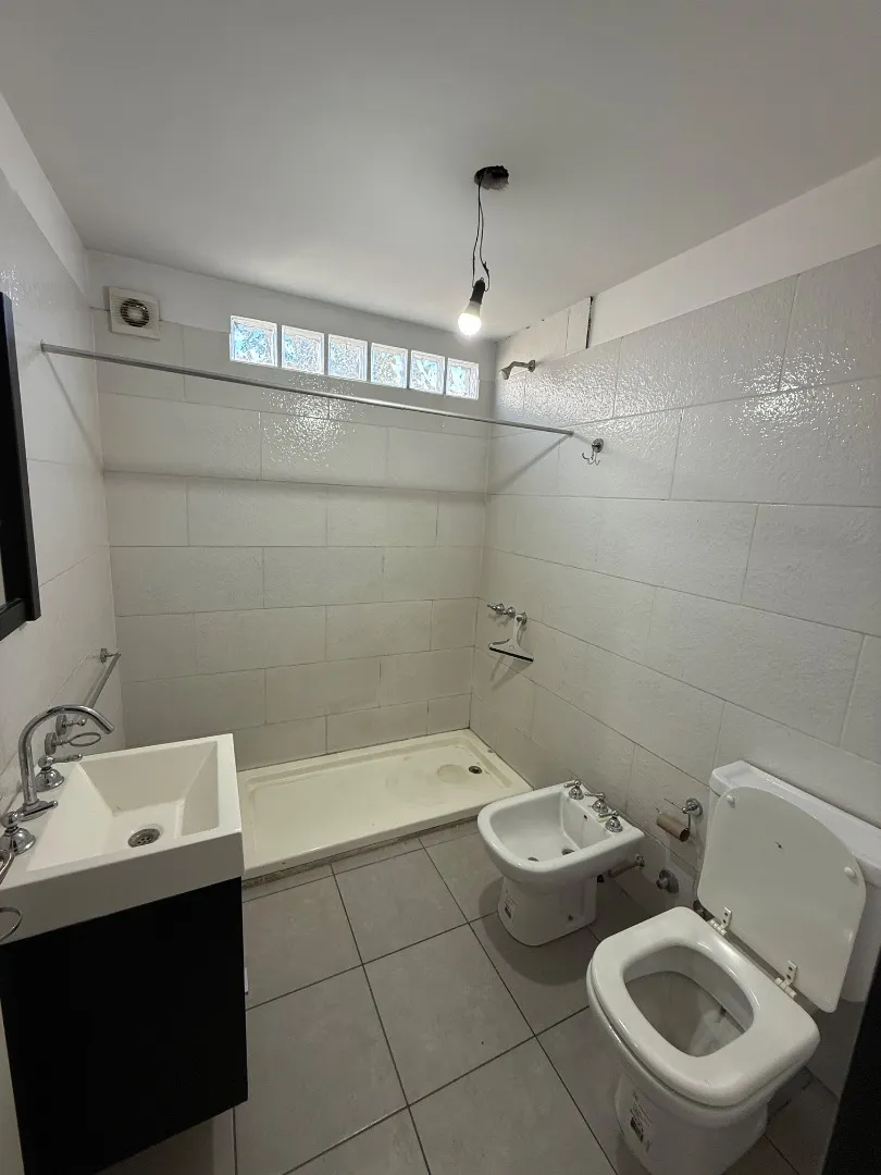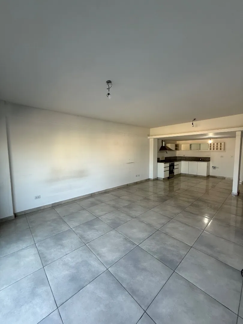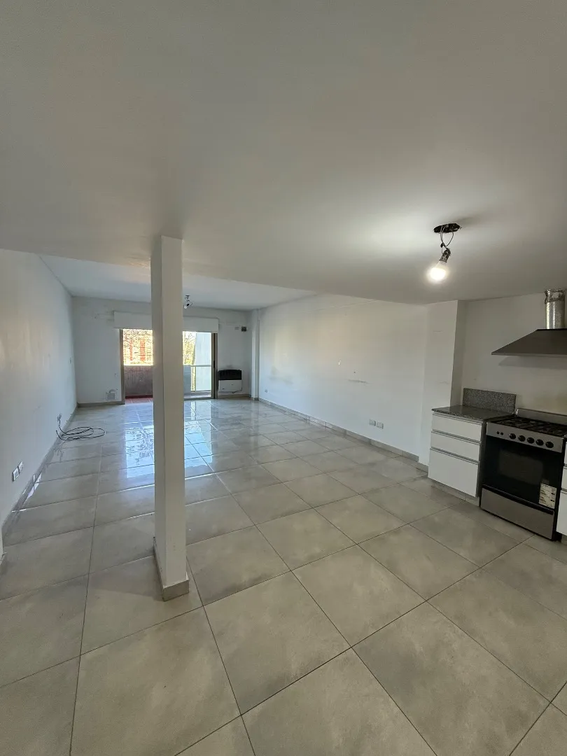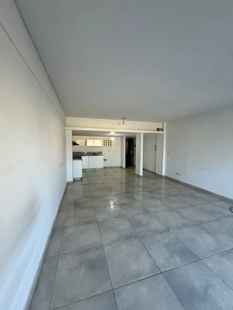 Apartamento de 1 ambiente no 1º piso, de frente para a rua, com cozinha e área de jantar, banheiro completo e ambiente único com possibilidade de divisão. Há varanda voltada para a rua.