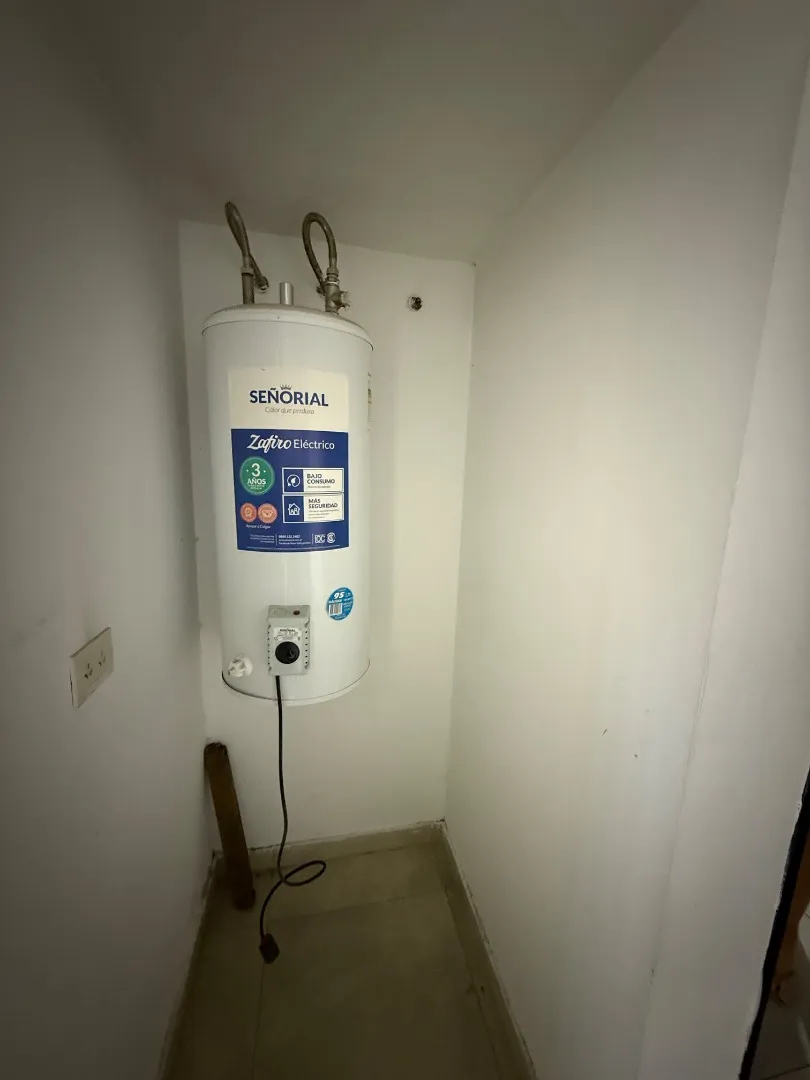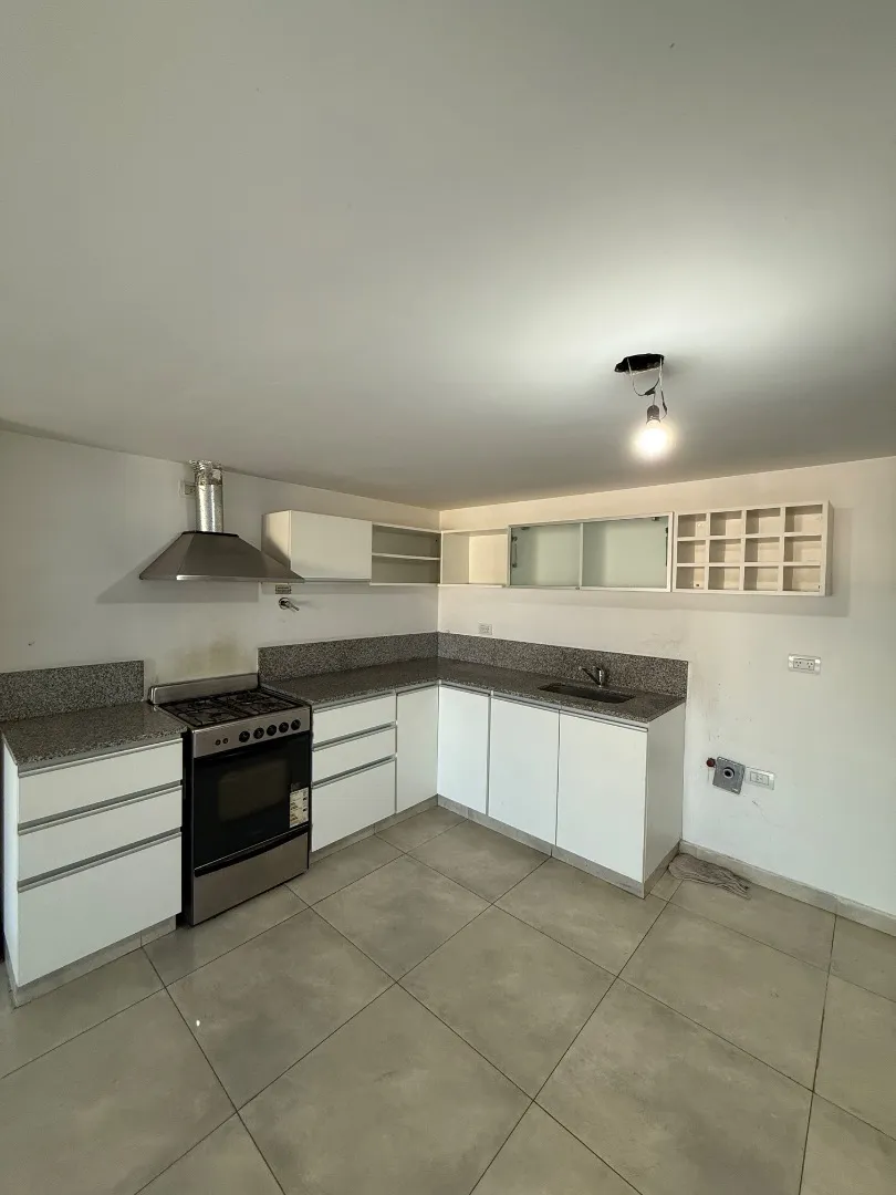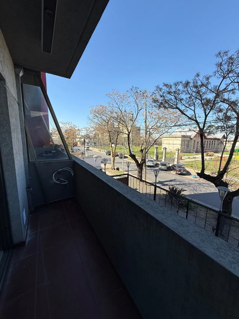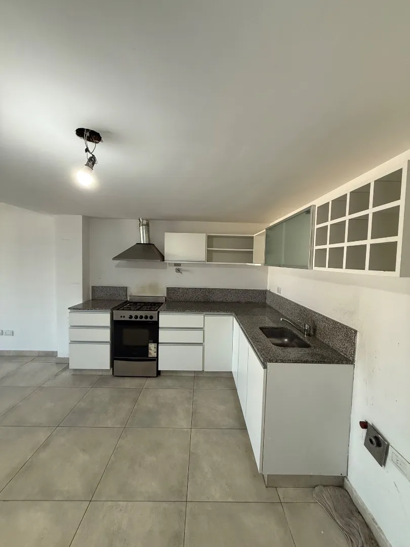 Apartamento de 1 ambiente no 1º piso, de frente para a rua, com cozinha e área de jantar, banheiro completo e ambiente único com possibilidade de divisão. Há varanda voltada para a rua.