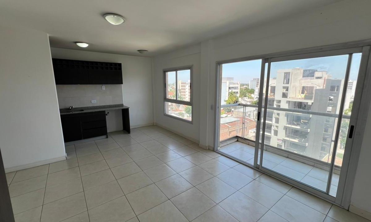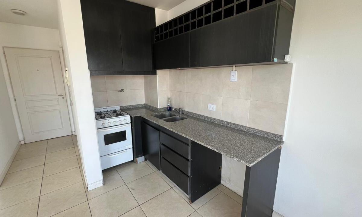 Kitnet para aluguel em Morón. O apartamento tem cozinha semi integrada, varanda de frente para a rua, armário e banheiro completo com banheira.