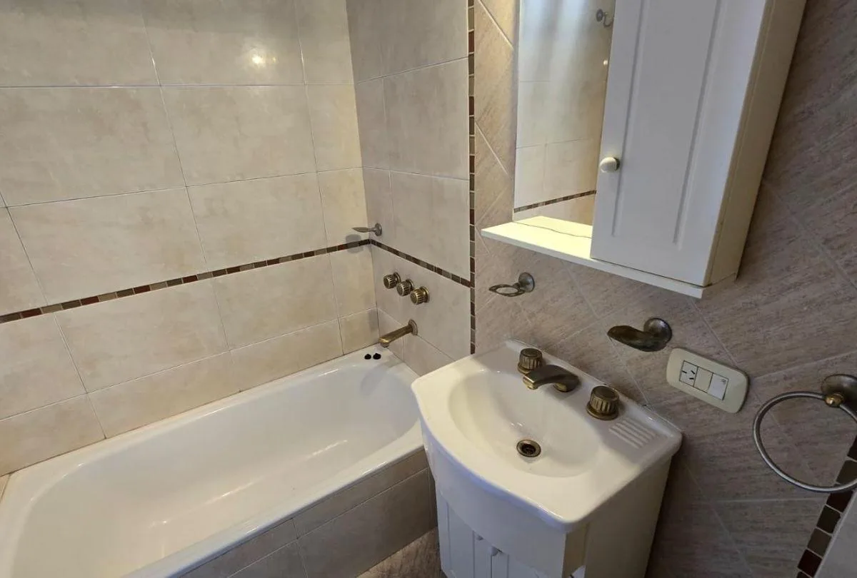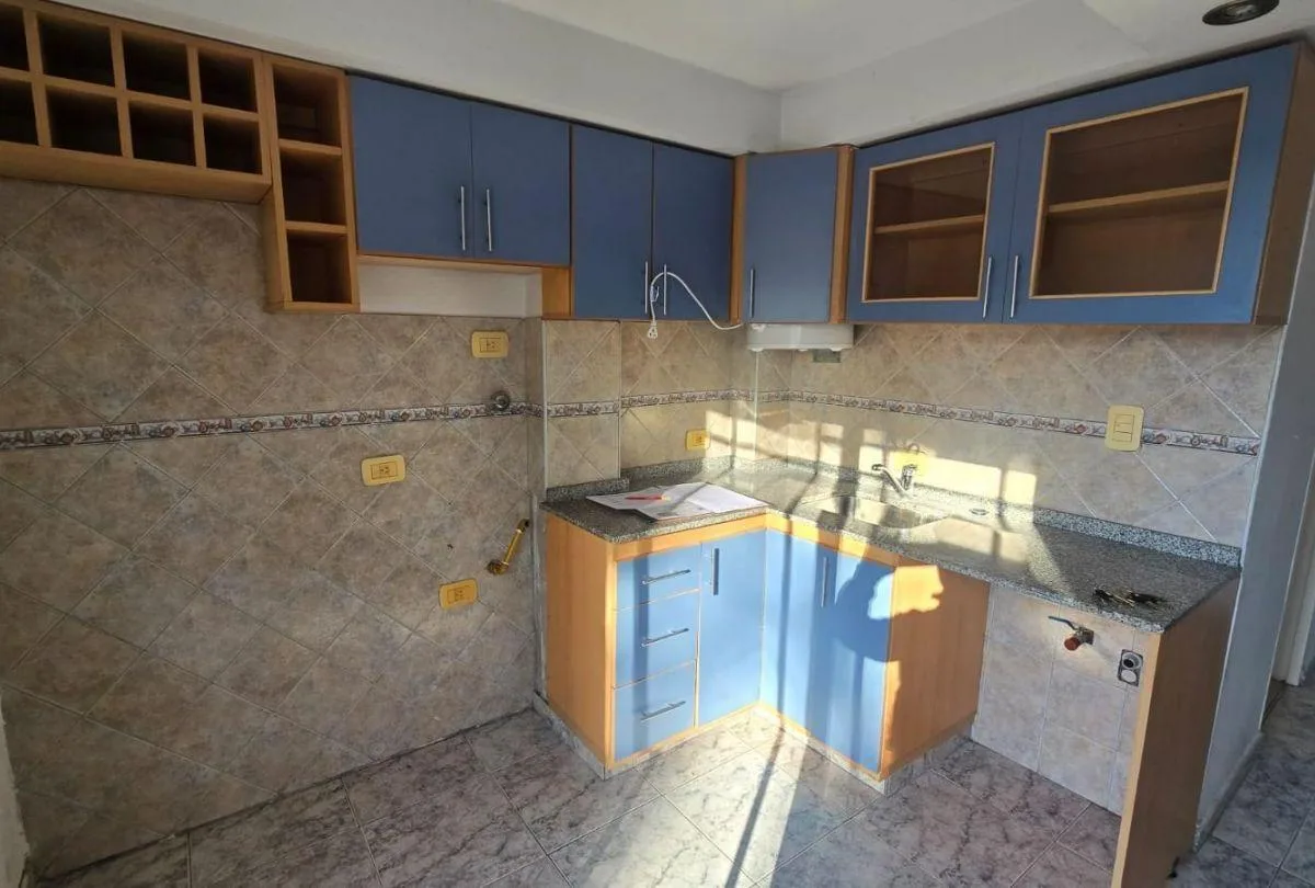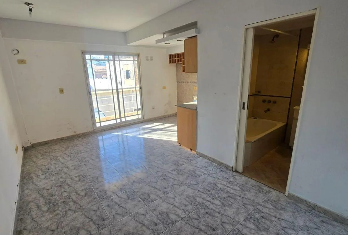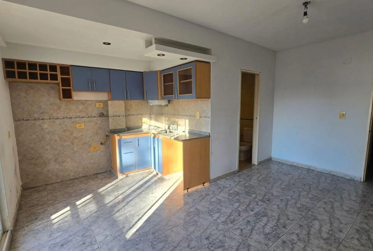 Kitnet (monoambiente) em Villa Sarmiento, Morón, no primeiro piso por escada, com orientação para os fundos. Cozinha integrada com móveis sob a bancada e armários superiores. Há balcão, com saída a partir do ambiente.